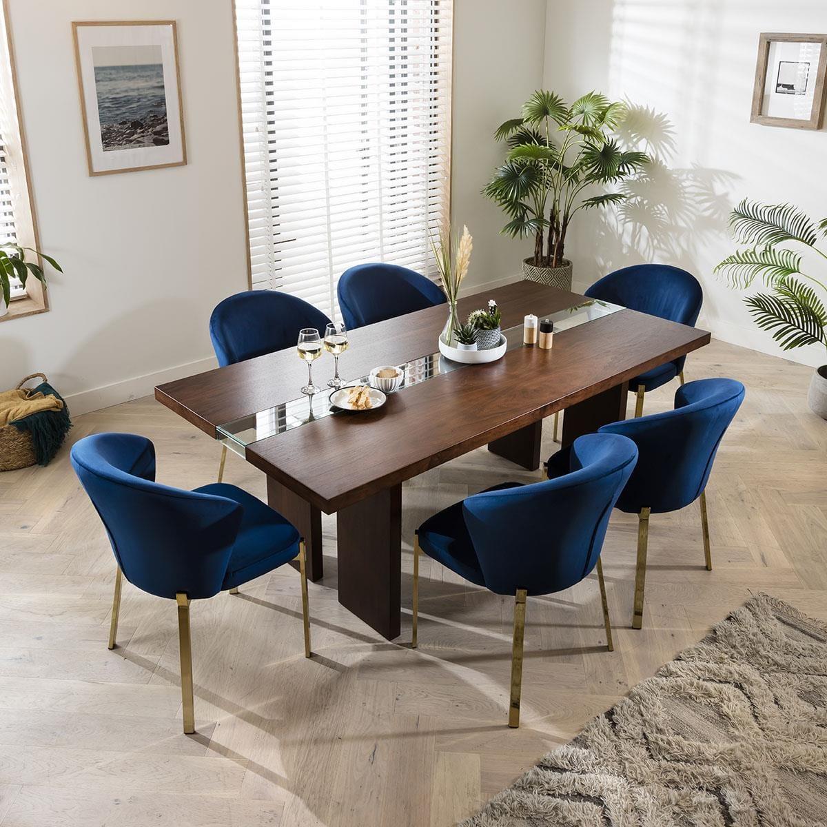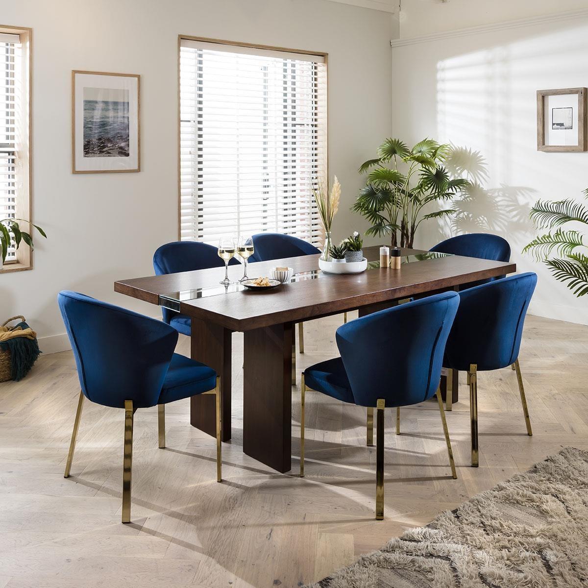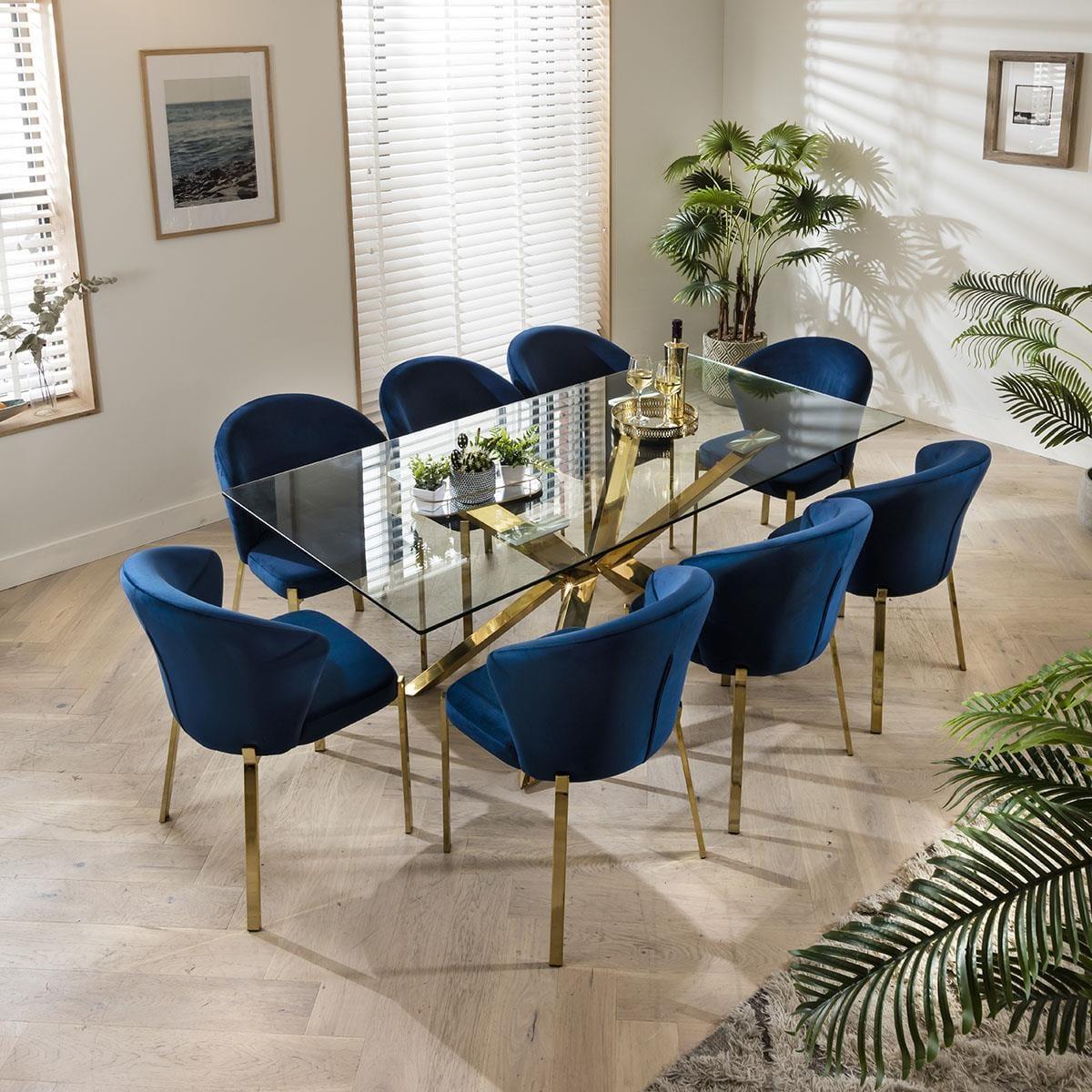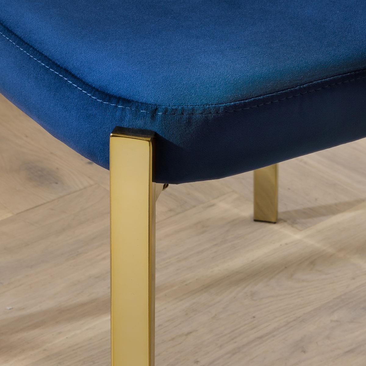 Revitalise your dining room decor with the JLA Luxury Navy Velvet Upholstered Dining Chairs. Graceful, minimalist lines draw inspiration from the signature silhouettes of mid-century dining chairs that blend seamlessly with the luxe comfort of the JLA Collection's soft and stain-resistant performance velvet upholstery. Cleverly proportioned, its curved back is designed to cocoon around you. Supported by dense foam padding and resting atop golden metal tapered legs, the JLA dining chairs are a vintage-modern style that makes this velvet chair ideally suited for a variety of rooms. Seat Height: 46cm W: 57cm, D: 62cm, H: 83cm Also available in Grey or Cream