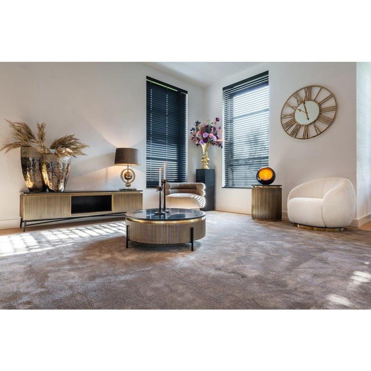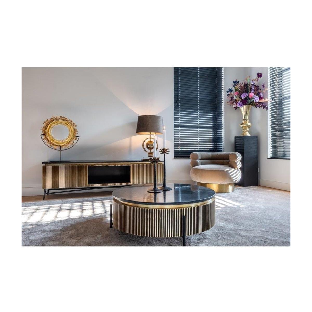 The Ironville Gold Drum Coffee Table brings together modern and mid-century forms. The wide cylindrical design features a ribbed brass metal sheet body finished in a golden tone that exudes opulence and luxury, while nodding to styles of the 1960s. A black marble top completes the look. The rigid and streamline structure of this coffee table is reminiscent of mid-century furniture styles, adding a retro feel to your living room. The 90cm round drum shaped body is elevated from the floor by slender metal legs, adding an understated edge to the design. Spread the cost our with interest-free finance options. Minimum spend applies.