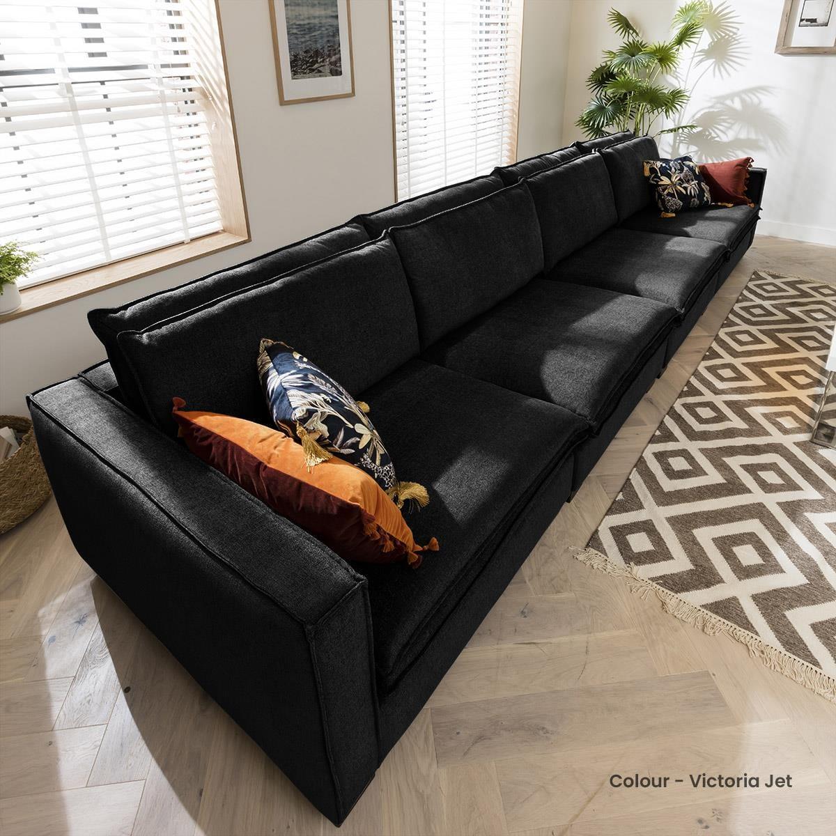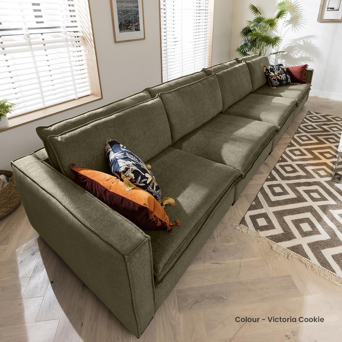 The Kyle modular large 6 seater straight sofa, designed with long, elegant lines, with light expression that offers deep modern comfort in any home. Make your living room stylish and well-arranged with this modern sectional sofa. The Kyle XL collection offers extra deep seating & style that instantly becomes the centrepiece of any modern, traditional or minimalist living room. Its robust, wooden frame and legs ensure longevity, while the premium upholstery covers thick layers of foam that guarantee comfortable seating. The sleek lines and simplistic design of the sofa are enriched by the dual-cushion seat and backs that add a cosy charm to the overall appeal of the sofa set. Why not add a matching footstool to place by the sofa, creating a space to stretch your legs out freely? This straight modular sofa is a functional 6-seater, adaptable to your interior dimensions by adding extra modules. The thickly padded sofa is tailored in a choice of 50 exclusive premium fabrics that boast stitching that is expertly sewn by upholstery specialists. Stability of the sofa is ensured with durable wooden legs. With its modern appearance, this sofa fits well with an array of décors making a chic centrepiece of any room. Need assistance? Use Live Chat to send us a message. If you need more information about this product, use the Live Chat service to speak to the team or send us a message. Spread the cost our with interest-free finance options. Minimum spend applies. W436cm D118cm H92cm Fully modular extendable design All dimensions are approximate due to fabric differences. Please allow tolerance of +/- 5cm to any direction