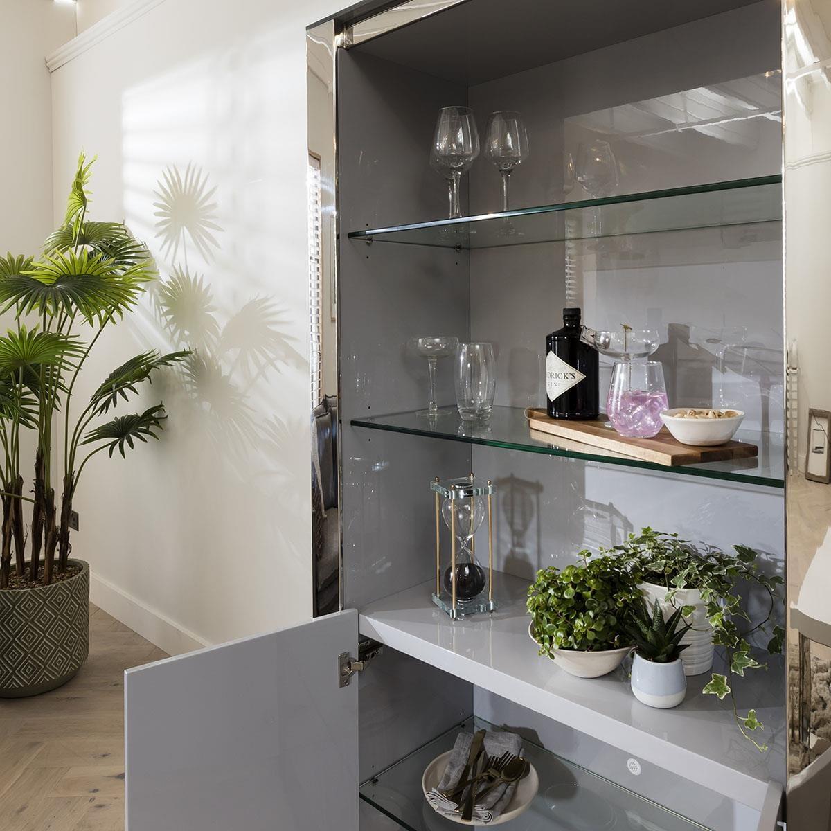 Ultra-clean lines with shiny stainless steel framing of the Sophie grey gloss display case will add a touch of luxury styling to any space. Showcase many of your prized possessions on the 186cm high contemporary shelving unit. The frame is made from premium quality shiny stainless steel which offers a lavish silver shine. The 100cm wide shelving unit comes with a large storage capacity, including 2 soft-close doors that open up to a large cupboard and tempered glass open-shelves. Styled with contemporary design in mind, the Sophie collection combines the best materials with superior composition. Crafted from wood and given a white gloss finish, the Sophie range is completed by extremely shiny stainless steel accents. The high gloss finish is easy to wipe clean and will brighten up any dining or living area with ease. The Sophie collection was designed to embody everything we love about luxury chic furniture. Here at Quatropi, you will find lots of glamorous shelving units and display cases helping you to achieve an ultra-modern, clutter free living area or dining room. W100cm D39cm H186cm Stainless Steel Detailing Matching Items Available