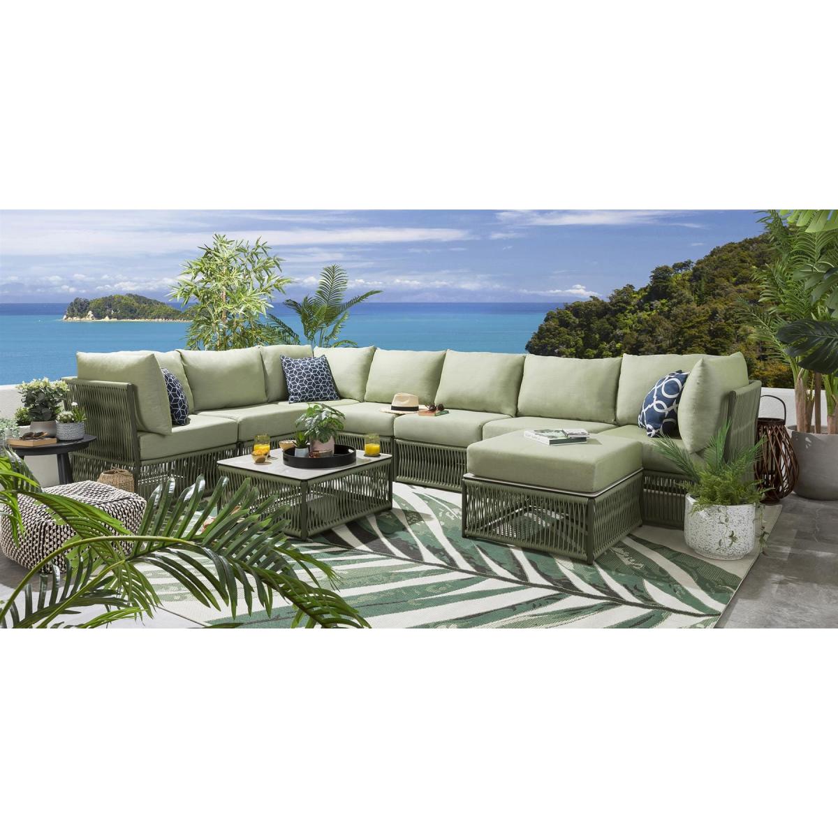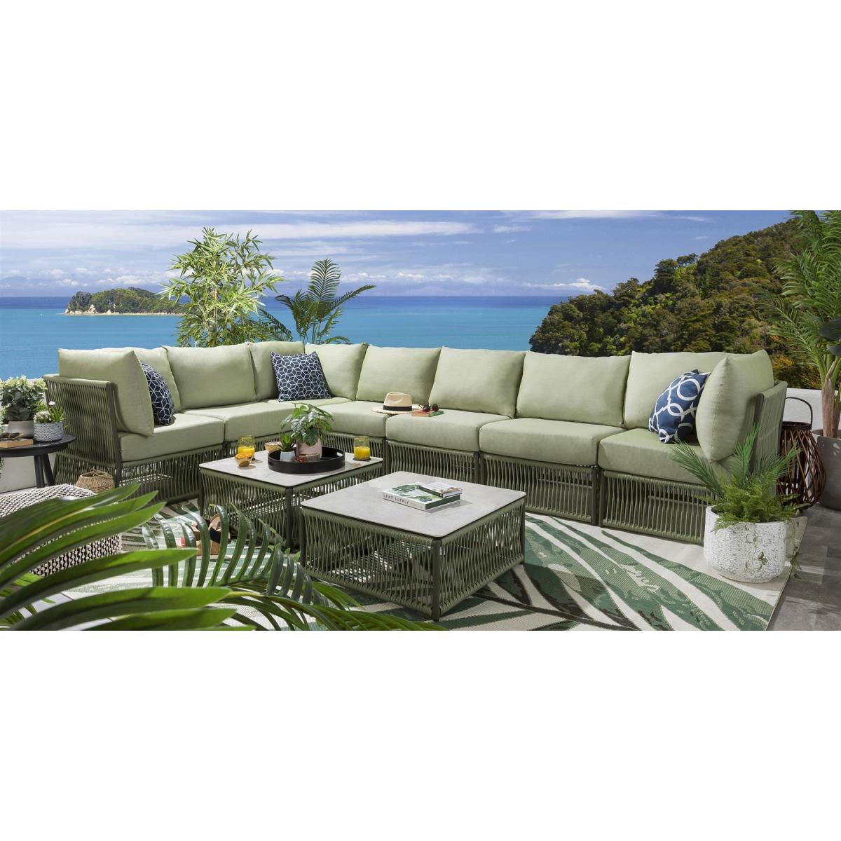 The Quatropi Luxury Cole Modular Outdoor Sofa Range is the perfect choice for outdoor relaxation and entertaining. Featuring luxurious deep cushions, this range of outdoor sofas is designed for maximum comfort and style. The frames are made from lightweight, durable aluminum, which is corrosion-resistant and perfect for withstanding the elements in any season. The sofas come in two color options ' blue or green ' and feature a 5-year warranty. The fabric used is weather-resistant and will remain looking good for years to come, even in the harshest climates. The cushions are filled with a high-grade foam for maximum comfort, and come with winter and rain covers for added protection. The Quatropi Luxury Cole Modular Outdoor Sofa Range is the perfect choice for anyone looking to create a stylish and comfortable outdoor seating area. The Cole Modular Outdoor Sofa Range from Quatropi is perfect for al-fresco dining, entertaining, or simply relaxing in the garden. The modular design and range of sizes make it easy to configure a seating area that suits your needs, and the contemporary styling ensures that it will look great no matter what the occasion. W288cm D288cm H75cm Set Includes 3 x corner sections, 4 x middle sections, 2 x coffee table/footstool Free Winter Cover