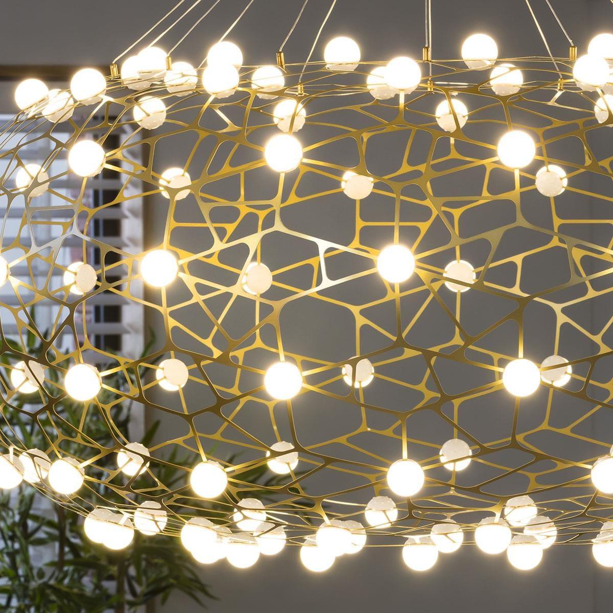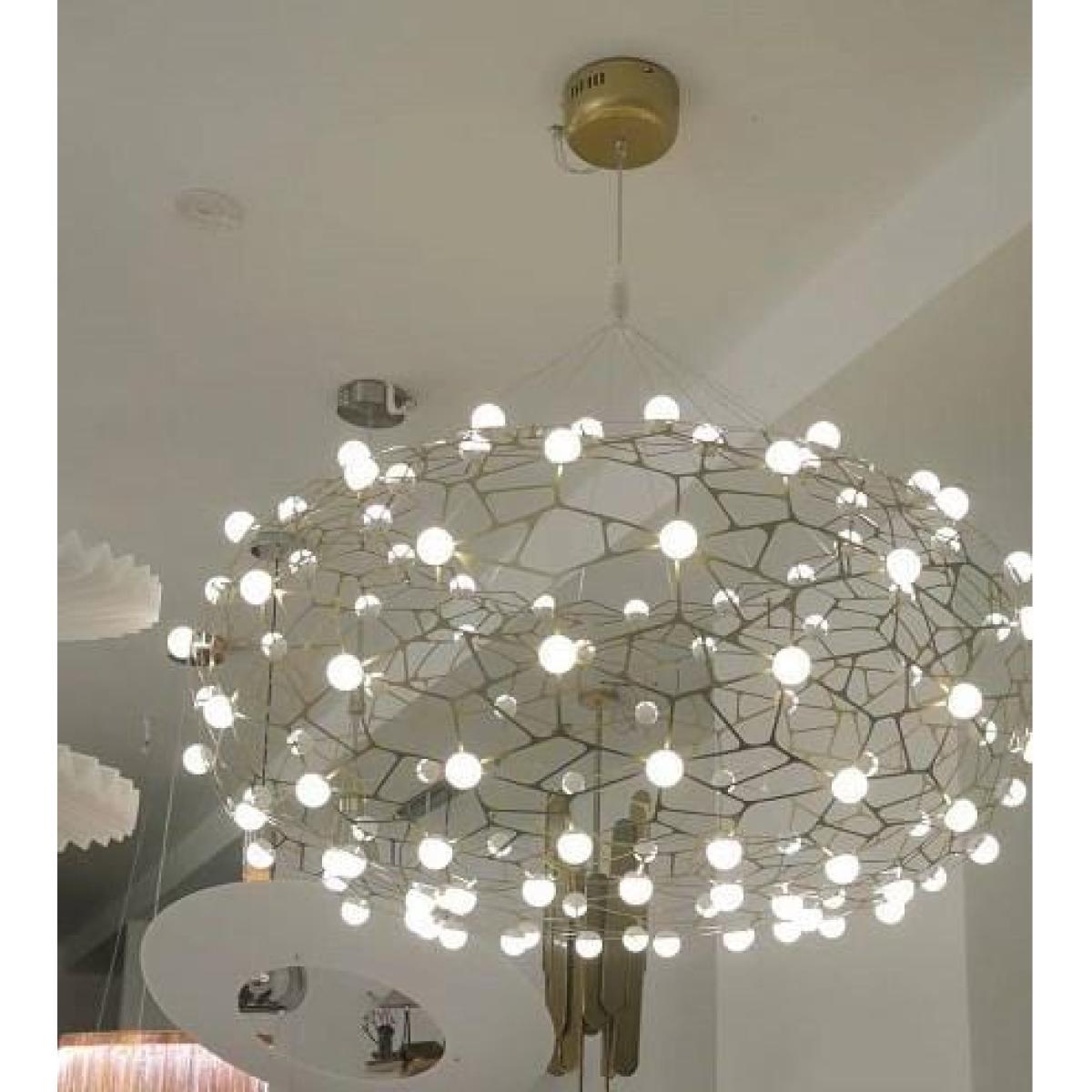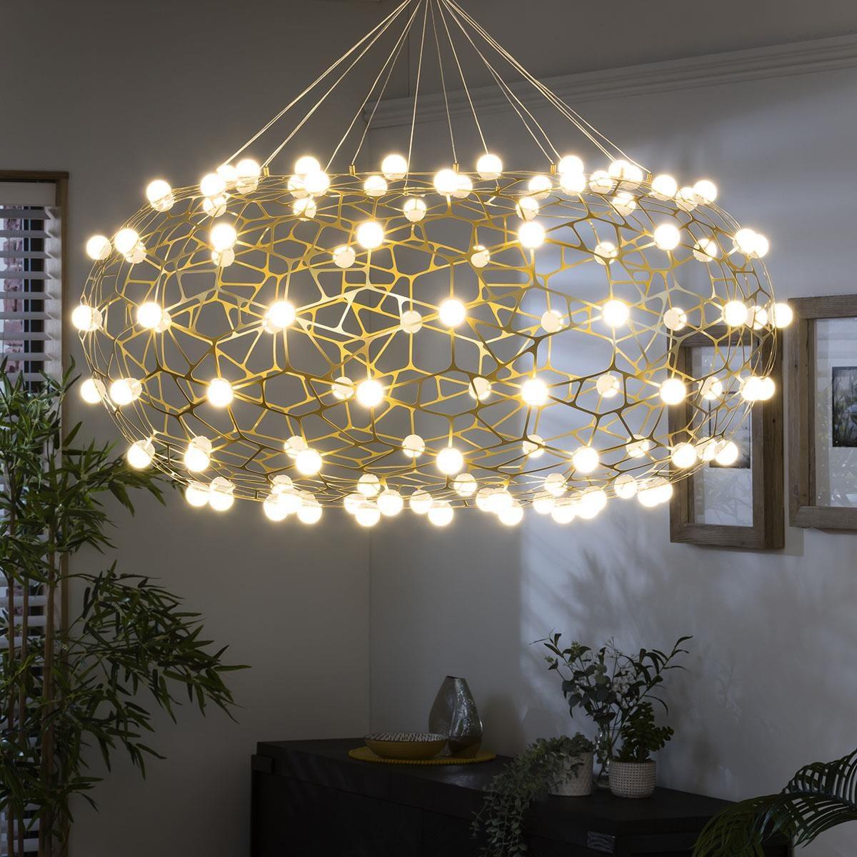 Totally glam up your space with these geometric basket ceiling light features. Finished in gold with bright LED plastic white beads, this stunning beaded ceiling light would be the perfect light to feature in a hallway, dressing room or kitchen. The pendant ceiling light, supported by strong suspension wires firmly connect the lamp body, is a stunning chandelier that boasts a contemporary edge with a stunning patterned light display and warm ambience throughout your home. Self-assembly required. This fitting has an intricate design and should be assembled by someone that is very famililar with lighting components and self-assembly furniture. This oversized pendant is sure to be a standout feature. LED Lightsource Power: 56W CCT: 3000. K Maximum drop 1.8m W100cm D100cm H50cm Large Geometric Basket Metal Pendant Ceiling Ligh Includes Integrated LED light