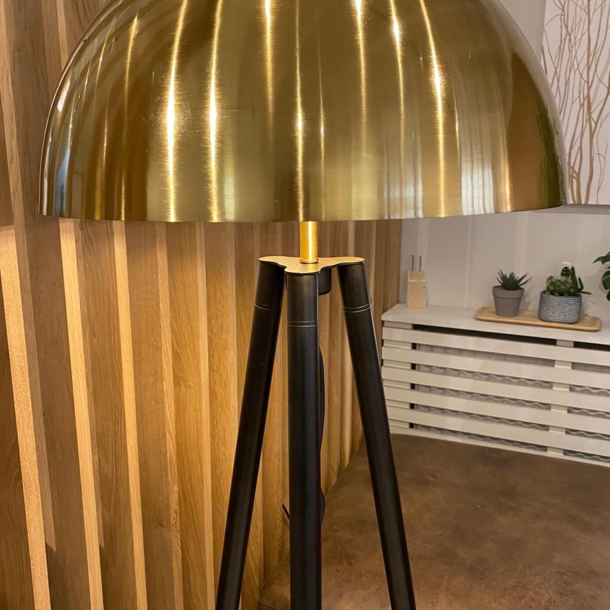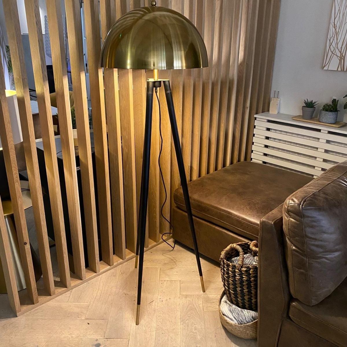 I love this tripoddish floor lamp for its sleek, modern silhouette and striking gold shade, which adds a touch of warmth and sophistication. It works especially well in contemporary or minimalist interiors, but can also bring a luxe accent to eclectic or industrial spaces. Styling-wise, consider placing it next to a comfy armchair or sofa to create a cosy reading nook, or use it as a statement piece in a corner to add vertical interest without overwhelming the space. Practical tips include pairing it with neutral furniture to let the gold pop, or combining it with warm-toned decor for a cohesive look. Its height and design make it versatile, perfect for both living rooms and bedrooms.