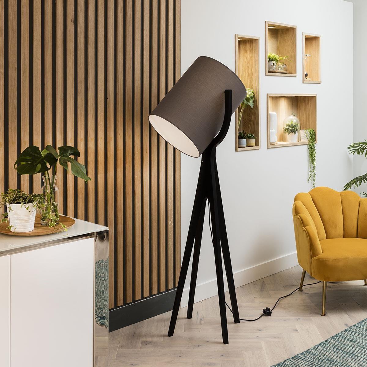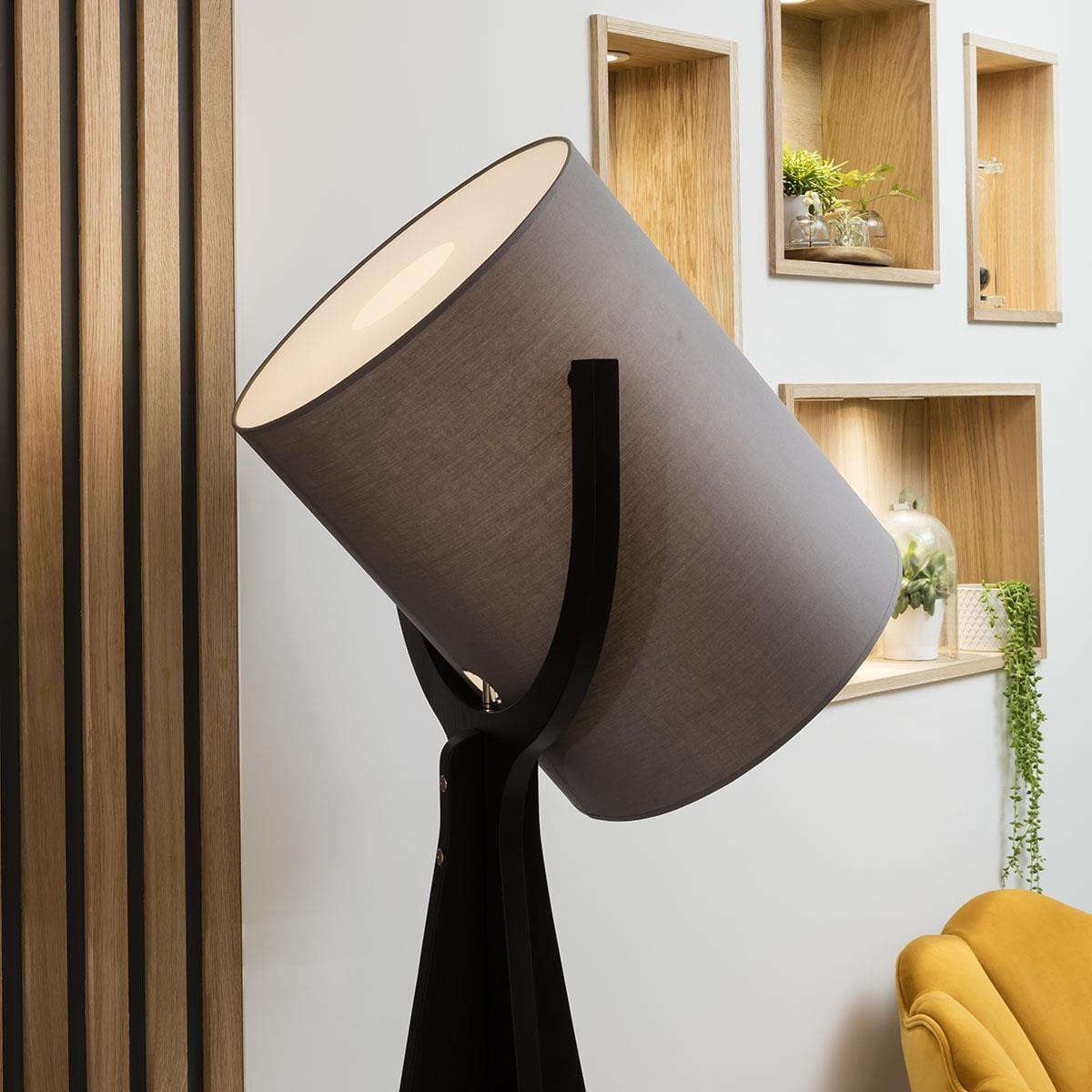 Minimal and contemporary in style and highly functional, the black tripod floor lamp frame supports a large grey fabric tilting shade. The floor lamp combines an industrial aesthetic with scandi design. Use the tripod floor lamp in the living room where it lights up the room in a diffuse glow. The sleek frame contributes to a cosy and warm atmosphere. If you need more information about this product, use the Live Chat service to speak to the team or send us a message. Spread the cost our with interest-free finance options. Minimum spend applies. W0cm D0cm H0cm Modern Design Features a pivoting shade
