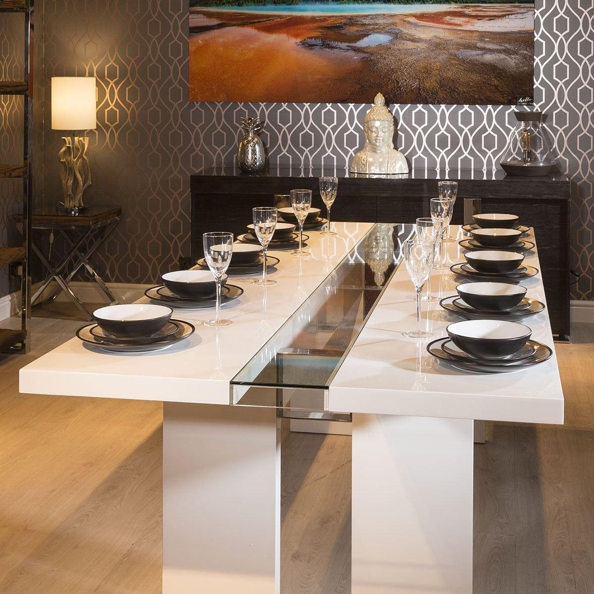 Luxury large rectangular dining table from Quatropi with Stunning Cental Glass Feature. A WOW of a table that will comfortably seat 12 Solid, Stong and very heavy Wooden legs and top with a a tempered clear glass feature. Super durable and really stunning to look at. W240cm D110cm H75cm 12 Seater Dining Table Luxury White Gloss Finish
