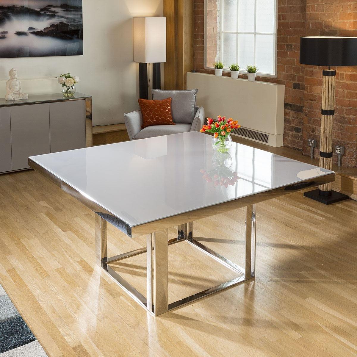 Introducing the Sophie range of designer furniture exclusive to Quatropi. This high end range exudes ultra modern style and features beautiful dove grey hi-gloss paint, matching grey glass and stainless steel frames and feet. The Sophie Dining tables all feature dove grey tempered glass tops and thick mirror finish stainless steel frames and legs. This square table is 1.5 meters and perfect for up to 8 large dining chairs Superb quality and strength from this stunning design. Felt feet ensure no damage to any type of flooring. The table is accompanied by 8 high end, extra padded white chairs with stainless steel frame. W150cm D150cm H76cm Stainless Steel Detailing Faux Leather White Chairs
