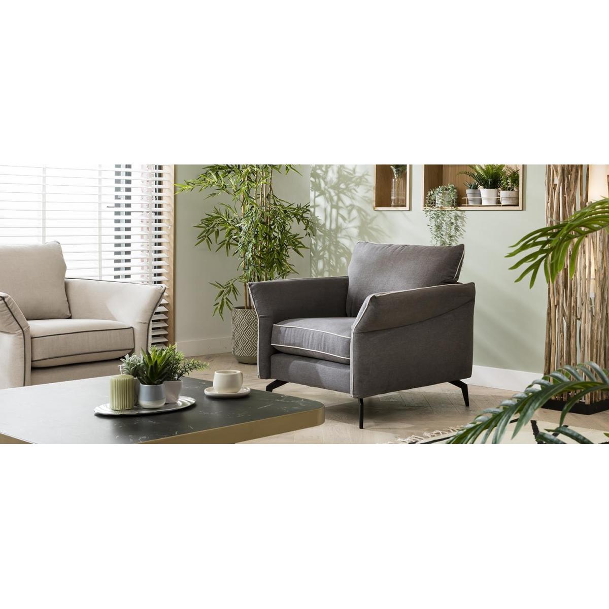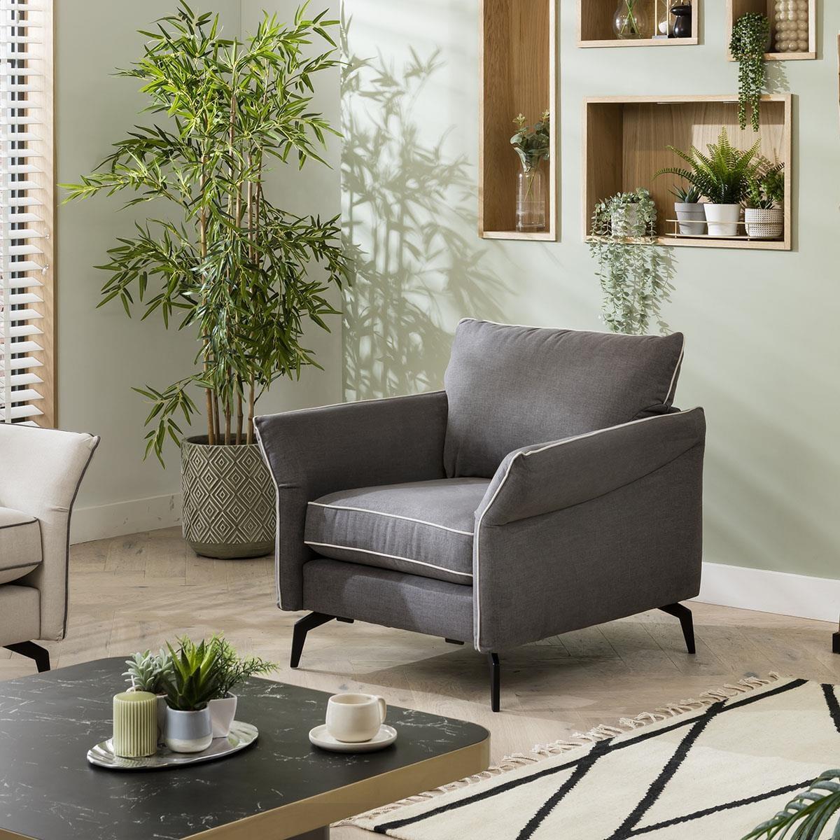 Our Raven Armchair is a modern mid-height back look, with contemporary design features like flared arms and angled metal legs. Cosy up for a film night or lounge in style with this lounge chair. The Raven Chair includes generously filled, encapsulating supporting foam cushions with a soft-medium firmness for the highest level of comfort, upholstered in our popular Linnet Smoke fabric with Linnet Clay pipping, the style is deep-seated comfort with flared arms and unique contrast piping. If you need more information about this product, use the Live Chat service to speak to the team or send us a message. Spread the cost our with interest-free finance options. Minimum spend applies. W95cm D93cm H81cm Modern Armchair All dimensions are approximate due to fabric differences. Please allow tolerance of +/- 5cm to any direction