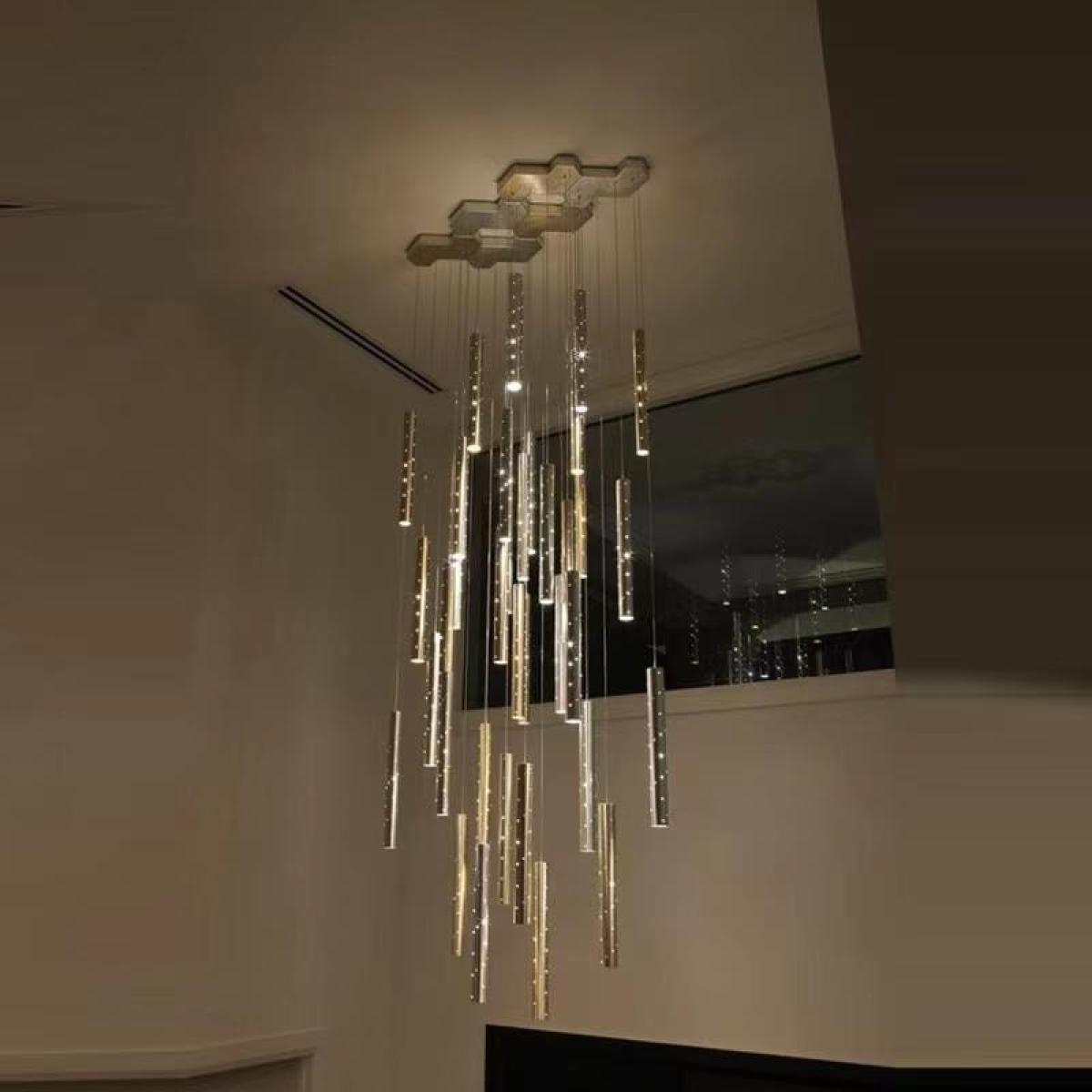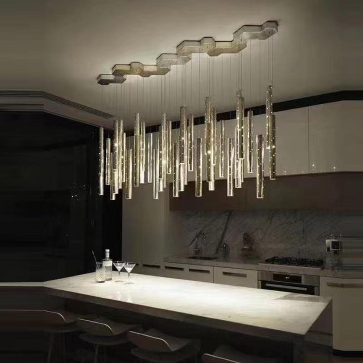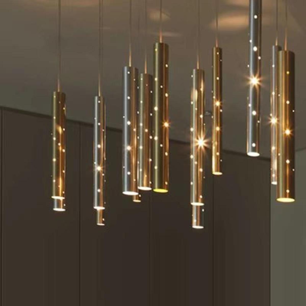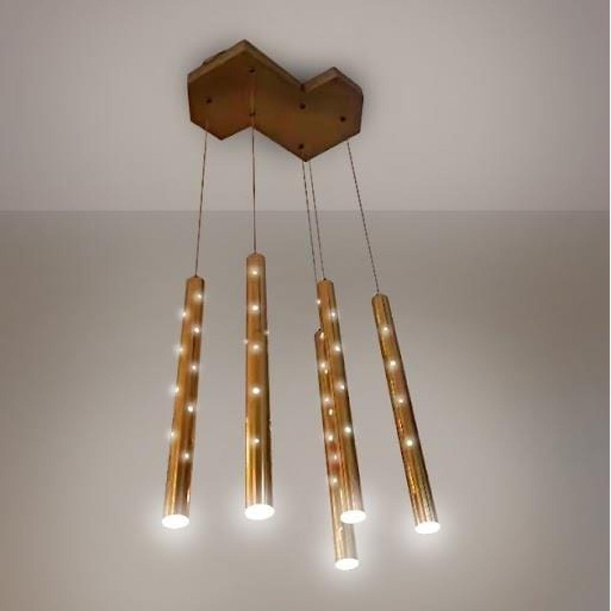 Mix a dash of modern style into the heart of your home with this golden tubular chandelier ceiling light. This pendant light features 5 long LED filled tubes which when combined offer a boost of warming brightness. Our modern chandelier ceiling light presents a commanding multi-faceted shine that is great for making a statement and brightening up larger rooms. Self-assembly required. This fitting has an intricate design and should be assembled by someone that is very famililar with lighting components and self-assembly furniture. This oversized pendant is sure to be a standout feature. LED Lightsource Power: 36W CCT: 3000. K W40cm D25cm H0cm Features Integrated LEDs Great for hallways or kitchen islands