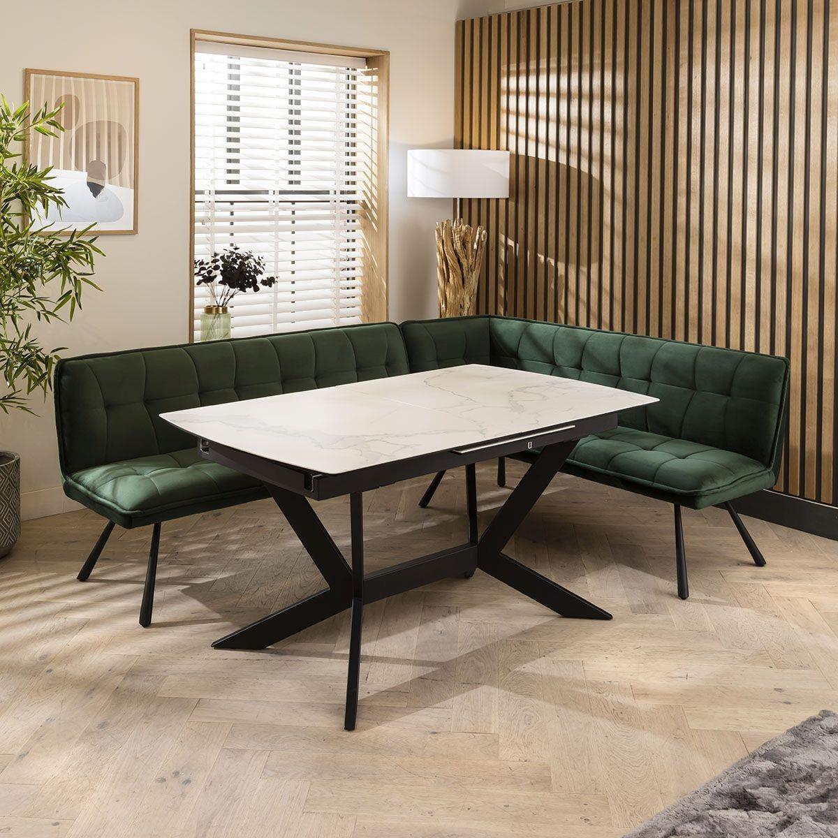 The exquisite Davina left-hand corner dining bench is a perfect blend of style and functionality. Designed to comfortably seat up to 5 people, this versatile corner seating bench creates a cosy gathering spot for family and friends. For added comfort, the corner dining bench is covered in a premium green velvet. The dining bench is upholstered in a premium emerald green fabric, offering a touch of sophistication to any dining space. The luxurious material not only adds elegance but also ensures durability, allowing for long-lasting enjoyment. With its sleek black powder coated legs, the corner bench exudes a contemporary charm that effortlessly complements modern interiors. The sturdy construction provides stability and support, making it an ideal choice for everyday use. Indulge in supreme comfort as you dine, thanks to the soft cushioning that lines the seat. Sink into the plush padding and experience a truly delightful dining experience. The elegant tufted design adds a refined touch, elevating the aesthetic appeal of the bench while offering an extra layer of comfort. W226cm D169cm H84cm Seat Height 49cm, Seat Depth 45cm Left Hand Corner Dining Bench in Emerald Green