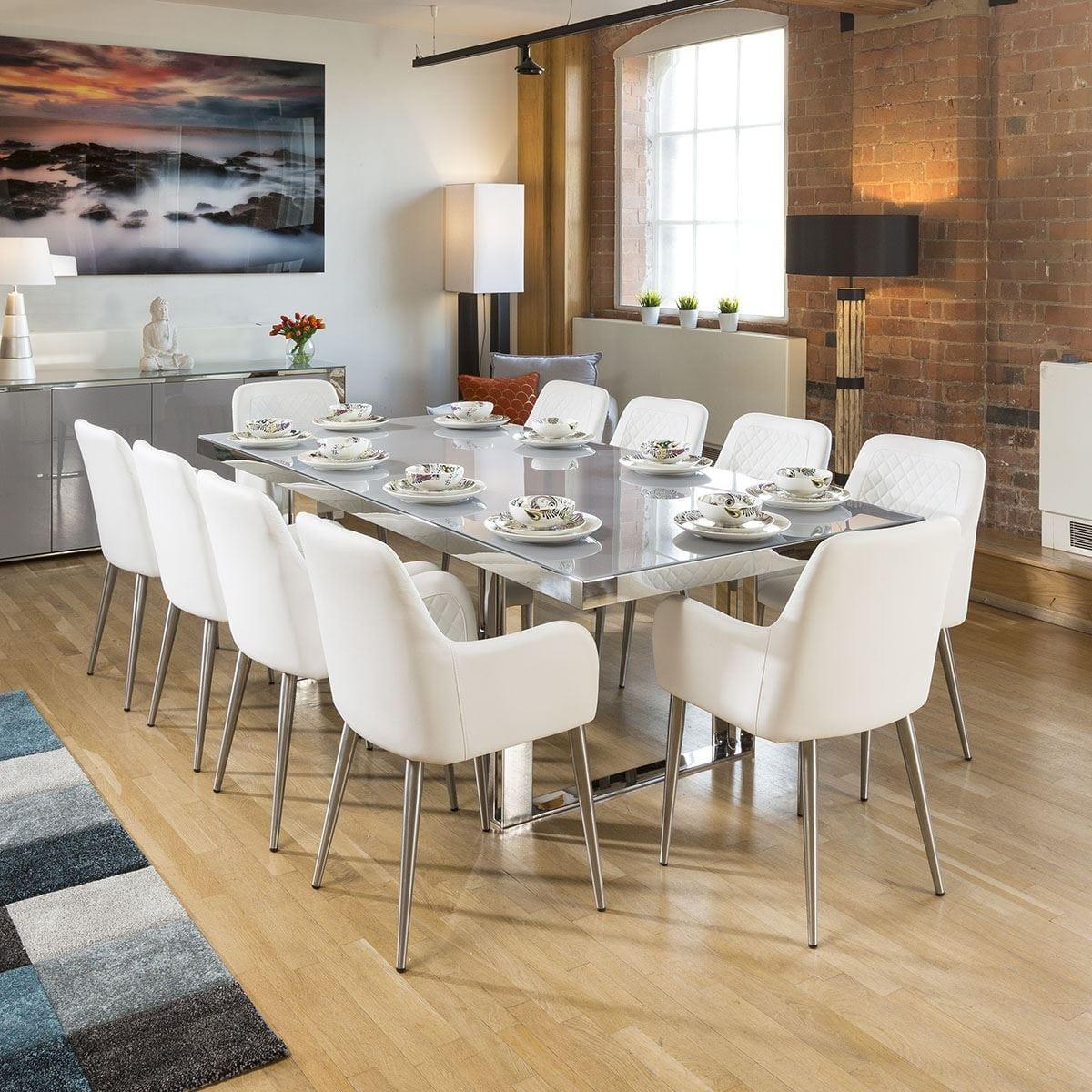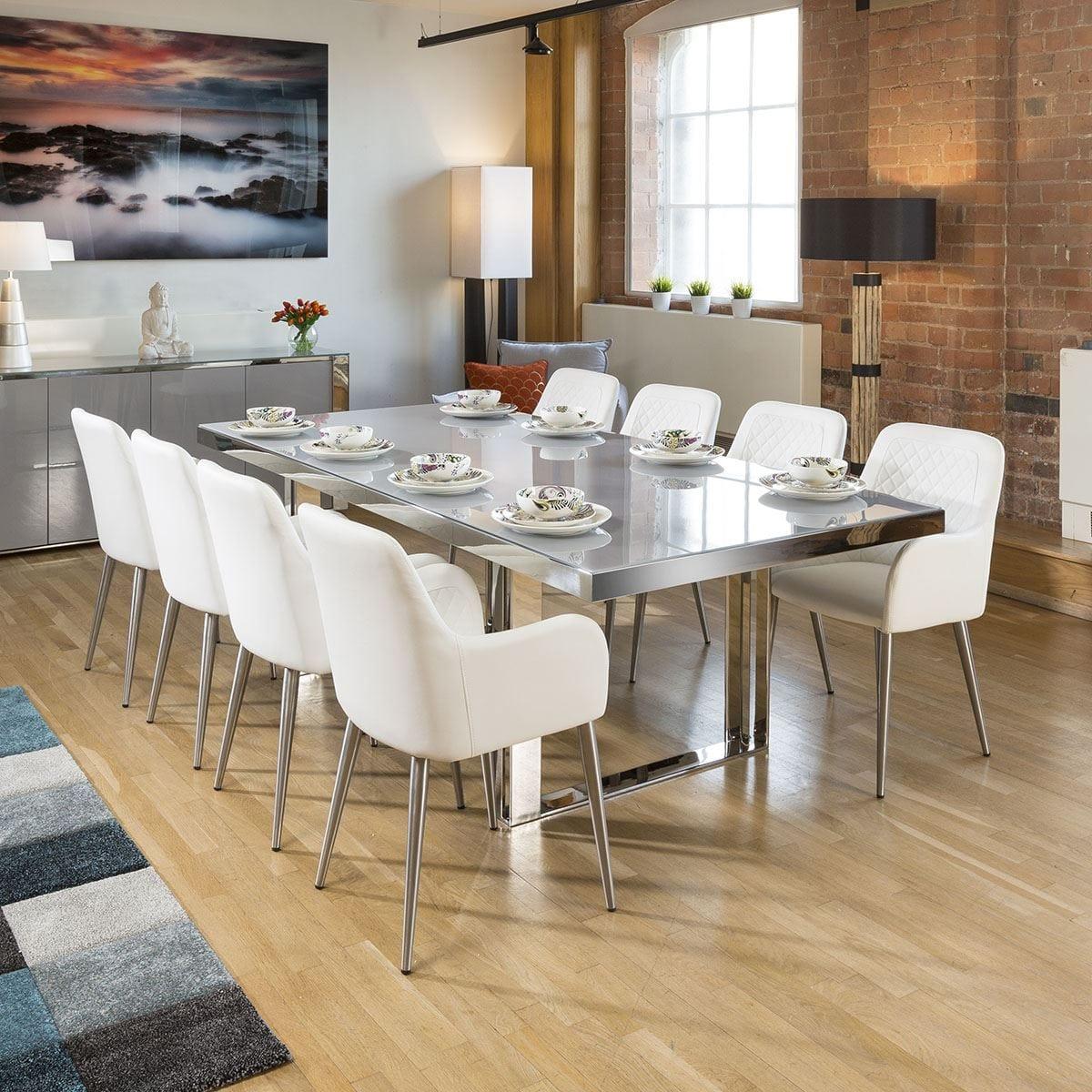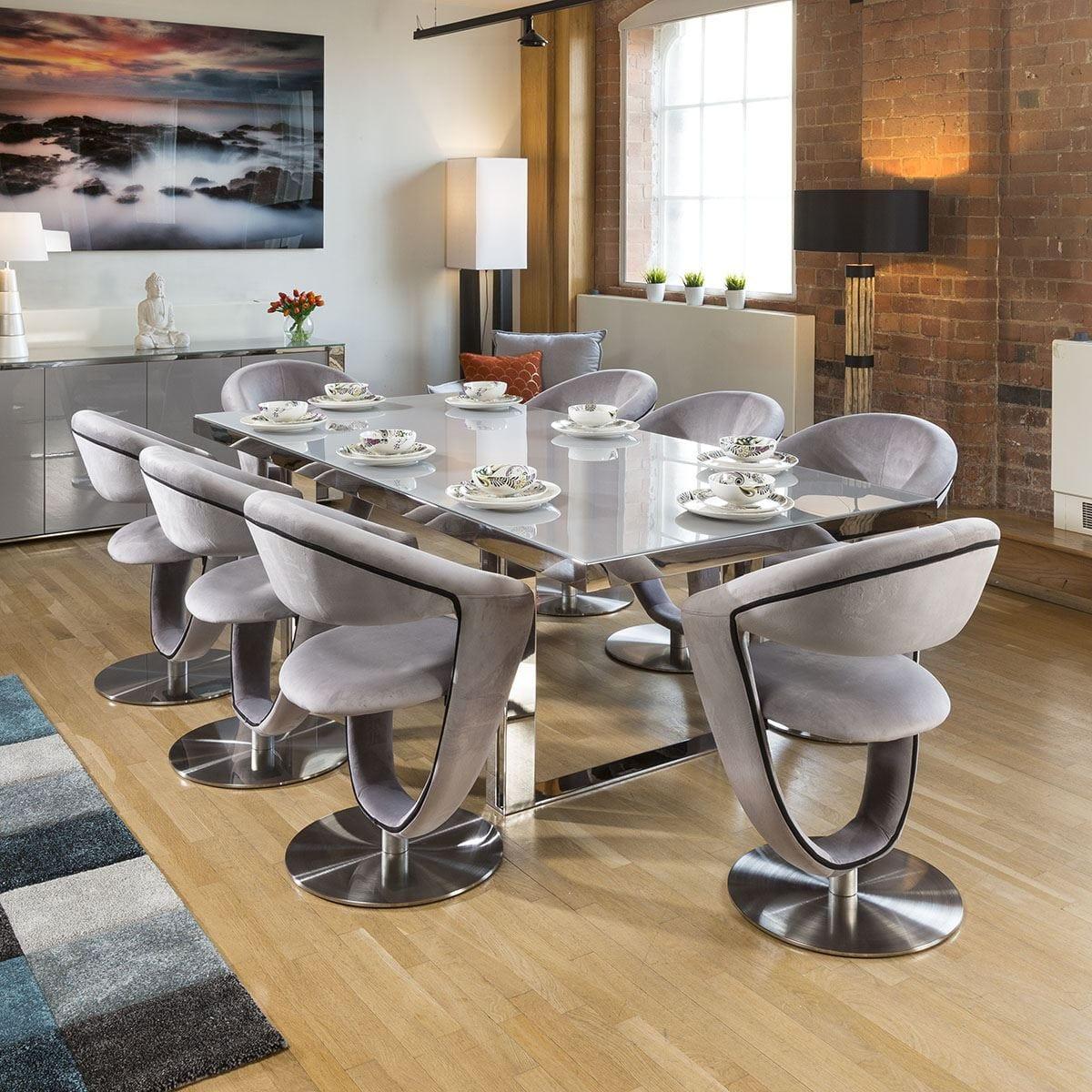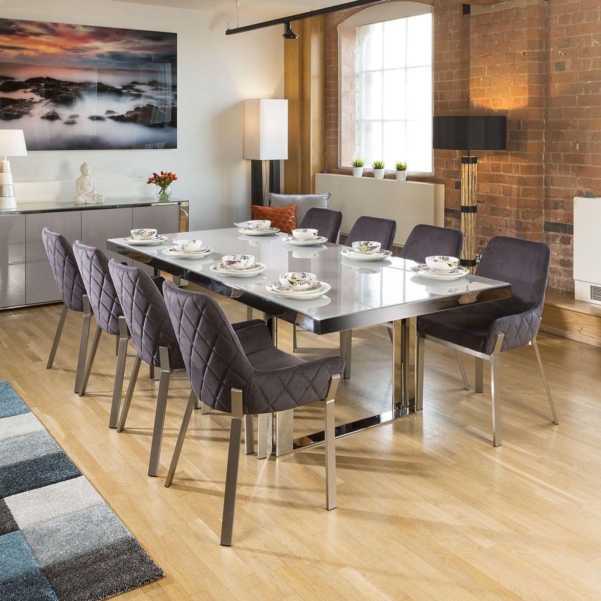 Introducing the Sophie range of designer furniture exclusive to Quatropi. This high end range exudes ultra modern style and features beautiful dove grey hi-gloss paint, matching grey glass and stainless steel frames and feet. The Sophie Dining tables all feature dove grey tempered glass tops and thick mirror finish stainless steel frames and legs. Superb quality and strength from this design. Nylon feet ensure no damage to any type of flooring. This rectangular table is 2.4 meters and perfect for up to 10 large dining chairs. W110cm D240cm H76cm Stainless Steel Detailing Tempered Glass Top
