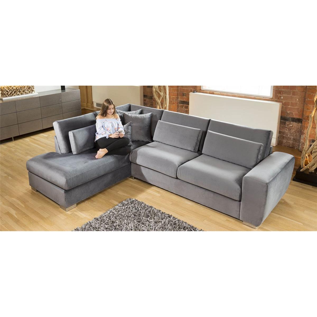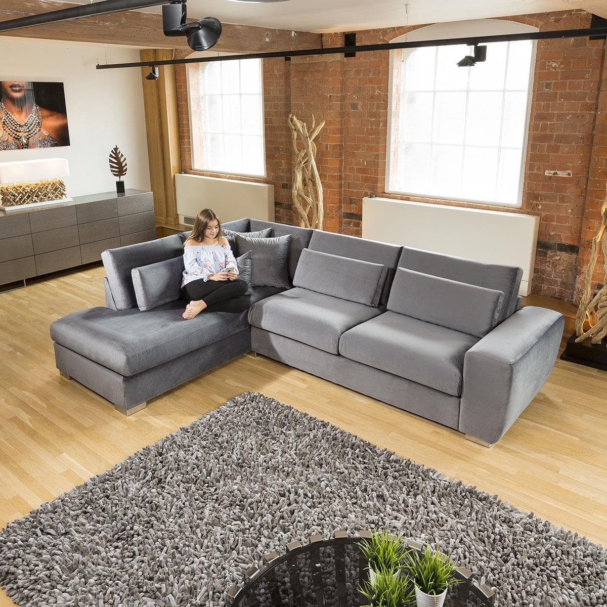 Large range of quality straight, corner and U shaped sofas and armchairs, choose your fabric, choose your shape. Available with coordinating or contrasting headrests, footstools, pillow and scatter cushions. An extra modular 70cm or 90cm armless centre section is also available if required.. The first thing that you will notice is flat sleek lines of the seat and back cushions giving a super neat and contemporary look. All this is built on a strong solid wood frame and will be delivered in a few sections that easily bolt together. Over 200 fabric options and unlimited designs as you can add extra sections to any of this range. Other features include; Super comfy double back cushions, 4 layers of springs, Foam and wadding base cushions, Beautiful large curved arms, Minimal stitching and high end modern but subtle steel feet. W308cm D215cm H90cm Fully Modular Options All dimensions are approximate due to fabric differences. Please allow tolerance of +/- 5cm to any direction