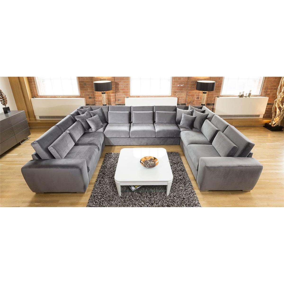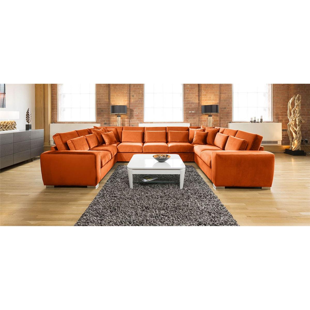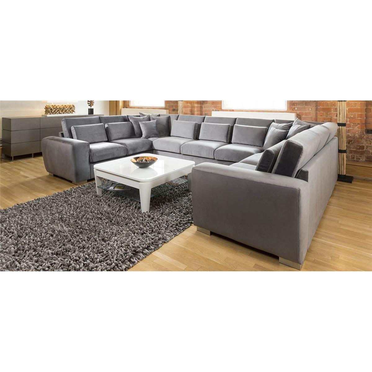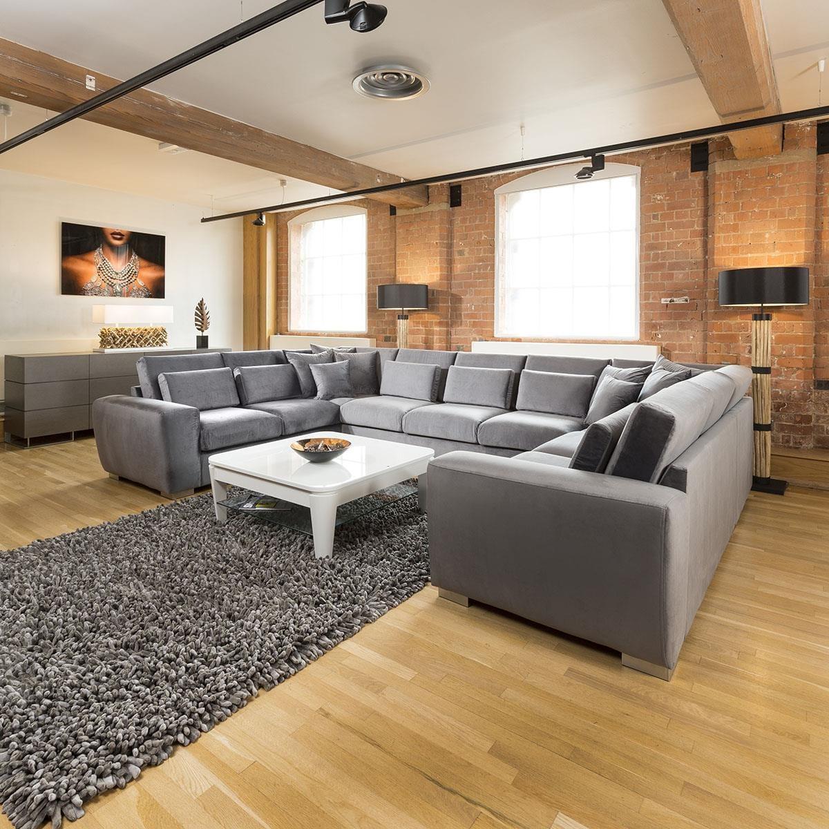 Large range of quality straight, corner and U shaped sofas and armchairs, choose your fabric, choose your shape. Available with coordinating or contrasting headrests, footstools, pillow and scatter cushions. An extra modular 70cm or 90cm armless centre section is also available if required.. The first thing that you will notice is flat sleek lines of the seat and back cushions giving a super neat and contemporary look. All this is built on a strong solid wood frame and will be delivered in a few sections that easily bolt together. Over 200 fabric options and unlimited designs as you can add extra sections to any of this range. Other features include; Super comfy double back cushions, 4 layers of springs, Foam and wadding base cushions, Beautiful large curved arms, Minimal stitching and high end modern but subtle steel feet. W402cm D268cm H90cm Fully Modular Options All dimensions are approximate due to fabric differences. Please allow tolerance of +/- 5cm to any direction