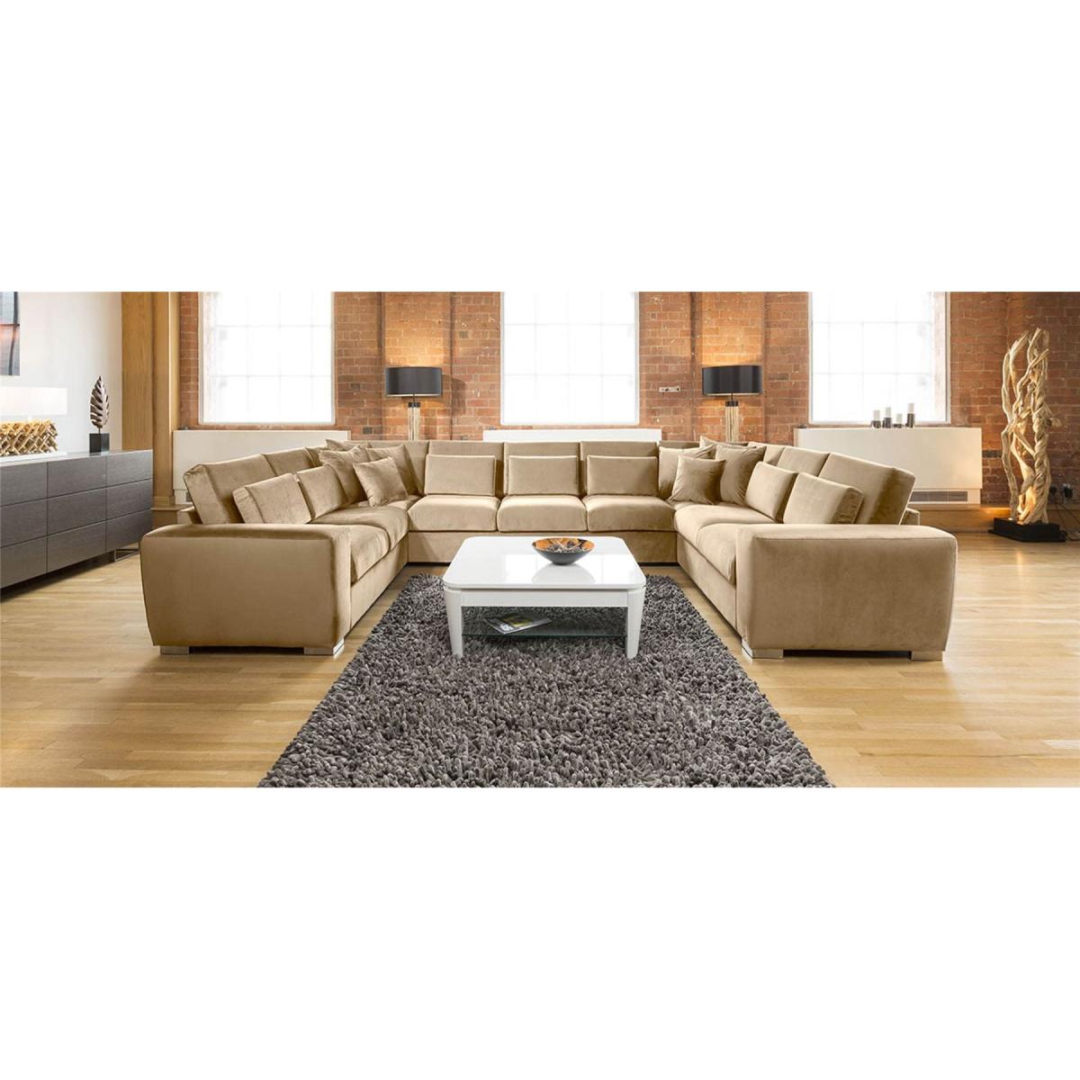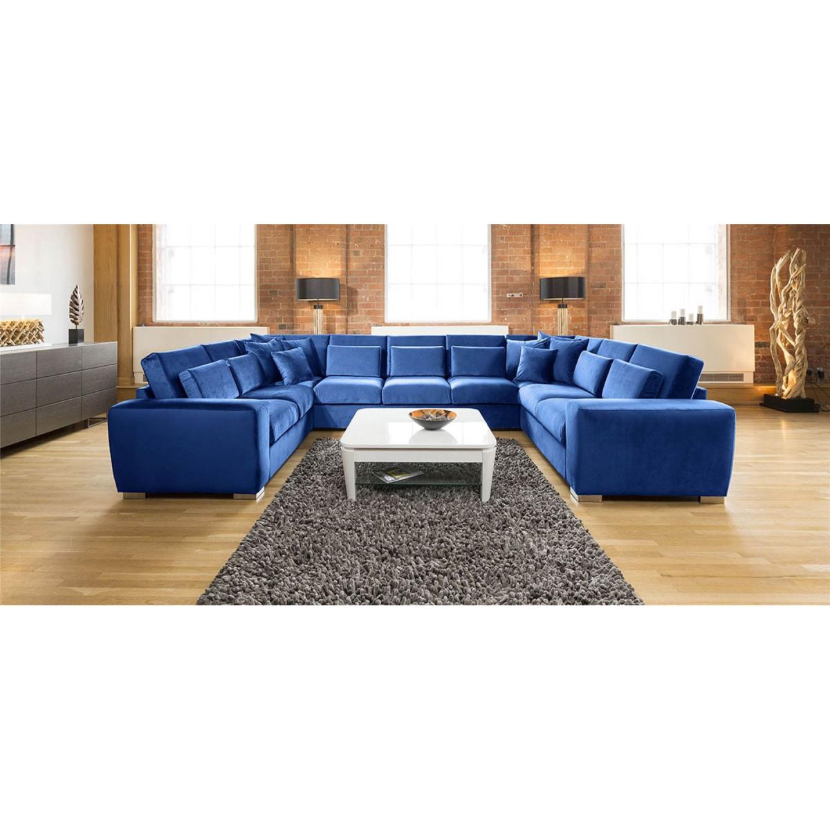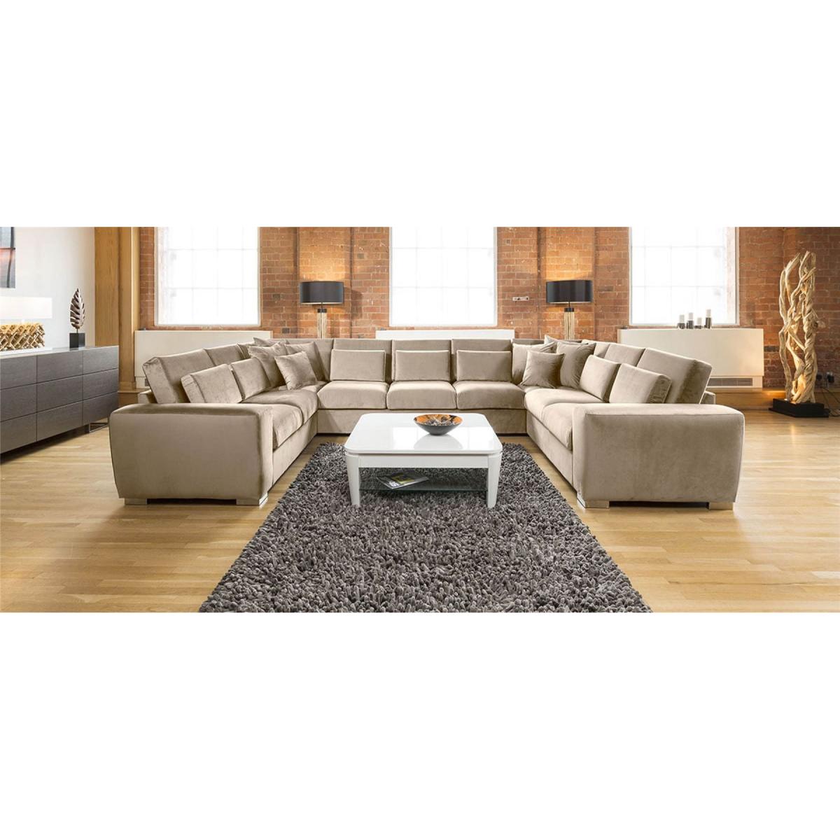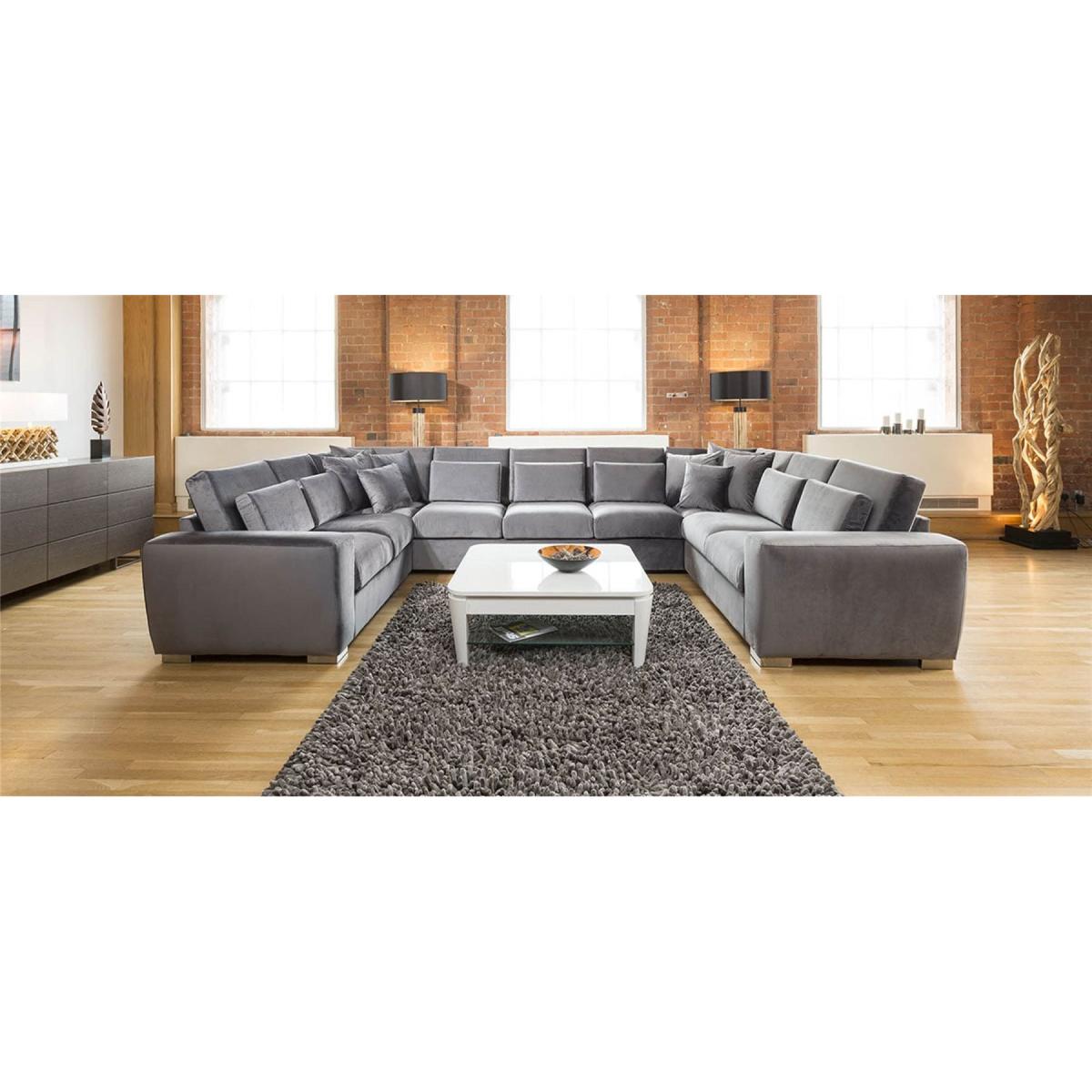 Large range of quality straight, corner and U shaped sofas and armchairs, choose your fabric, choose your shape. Available with coordinating or contrasting headrests, footstools, pillow and scatter cushions. An extra modular 70cm or 90cm armless centre section is also available if required.. The first thing that you will notice is flat sleek lines of the seat and back cushions giving a super neat and contemporary look. All this is built on a strong solid wood frame and will be delivered in a few sections that easily bolt together. Over 200 fabric options and unlimited designs as you can add extra sections to any of this range. Other features include; Super comfy double back cushions, 4 layers of springs, Foam and wadding base cushions, Beautiful large curved arms, Minimal stitching and high end modern but subtle steel feet. W402cm D268cm H90cm Fully Modular Options All dimensions are approximate due to fabric differences. Please allow tolerance of +/- 5cm to any direction