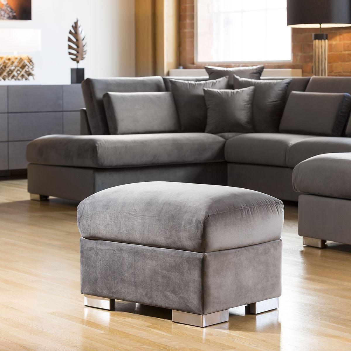This footstool is a lovely addition to the large Ohio range of quality straight, corner and U shaped sofas and armchairs, choose your fabric, choose your shape. Available with coordinating or contrasting headrests, footstools, pillow and scatter cushions. An extra modular 70cm or 90cm armless centre section is also available if required.. The first thing that you will notice is flat sleek lines of the seat and back cushions giving a super neat and contemporary look. All this is built on a strong solid wood frame and will be delivered in a few sections that easily bolt together. Over 200 fabric options and unlimited designs as you can add extra sections to any of this range. Other features include; Super comfy double back cushions, 4 layers of springs, Foam and wadding base cushions, Beautiful large curved arms, Minimal stitching and high end modern but subtle steel feet. W54cm D70cm H45cm Available in 100+ Fabrics All dimensions are approximate due to fabric differences. Please allow tolerance of +/- 5cm to any direction