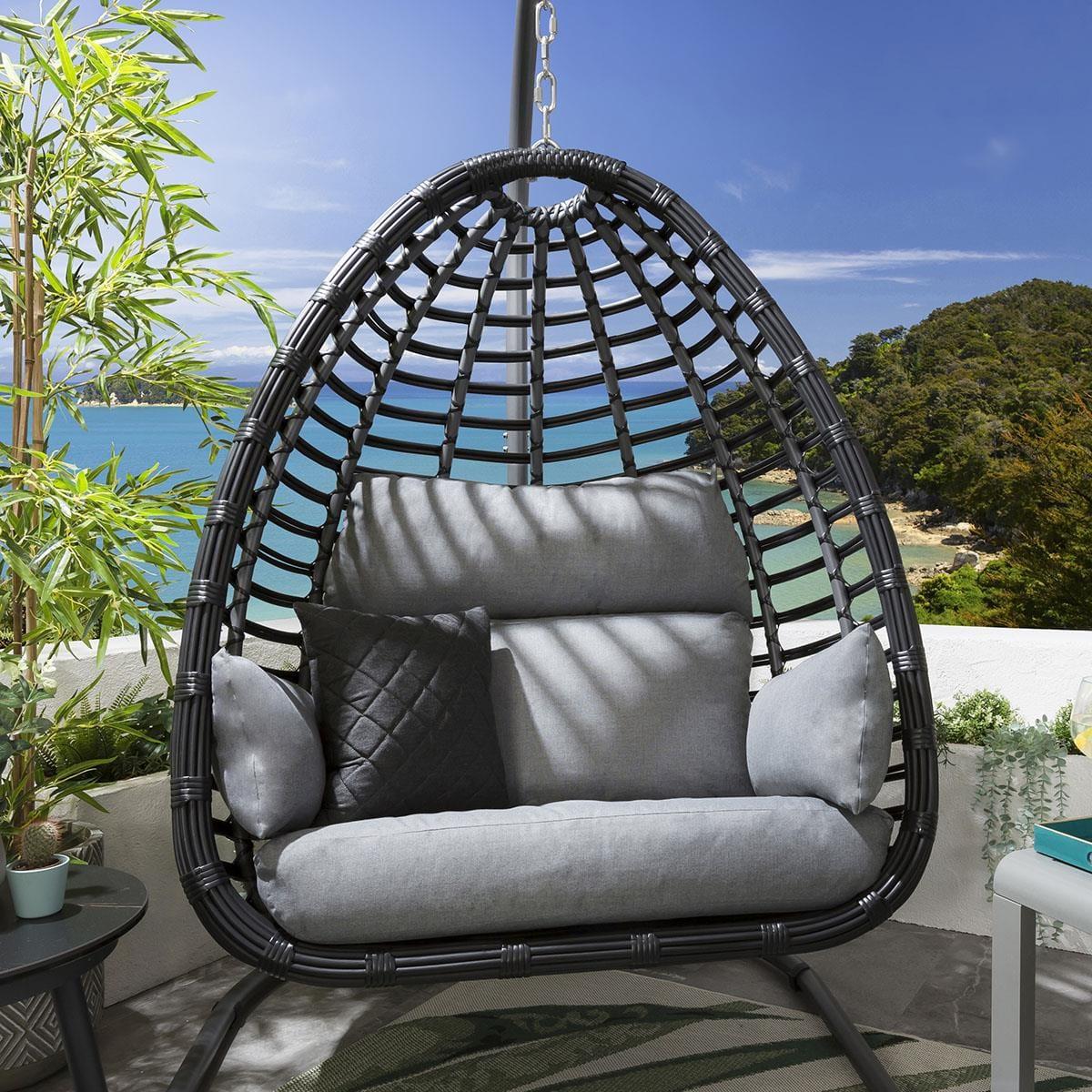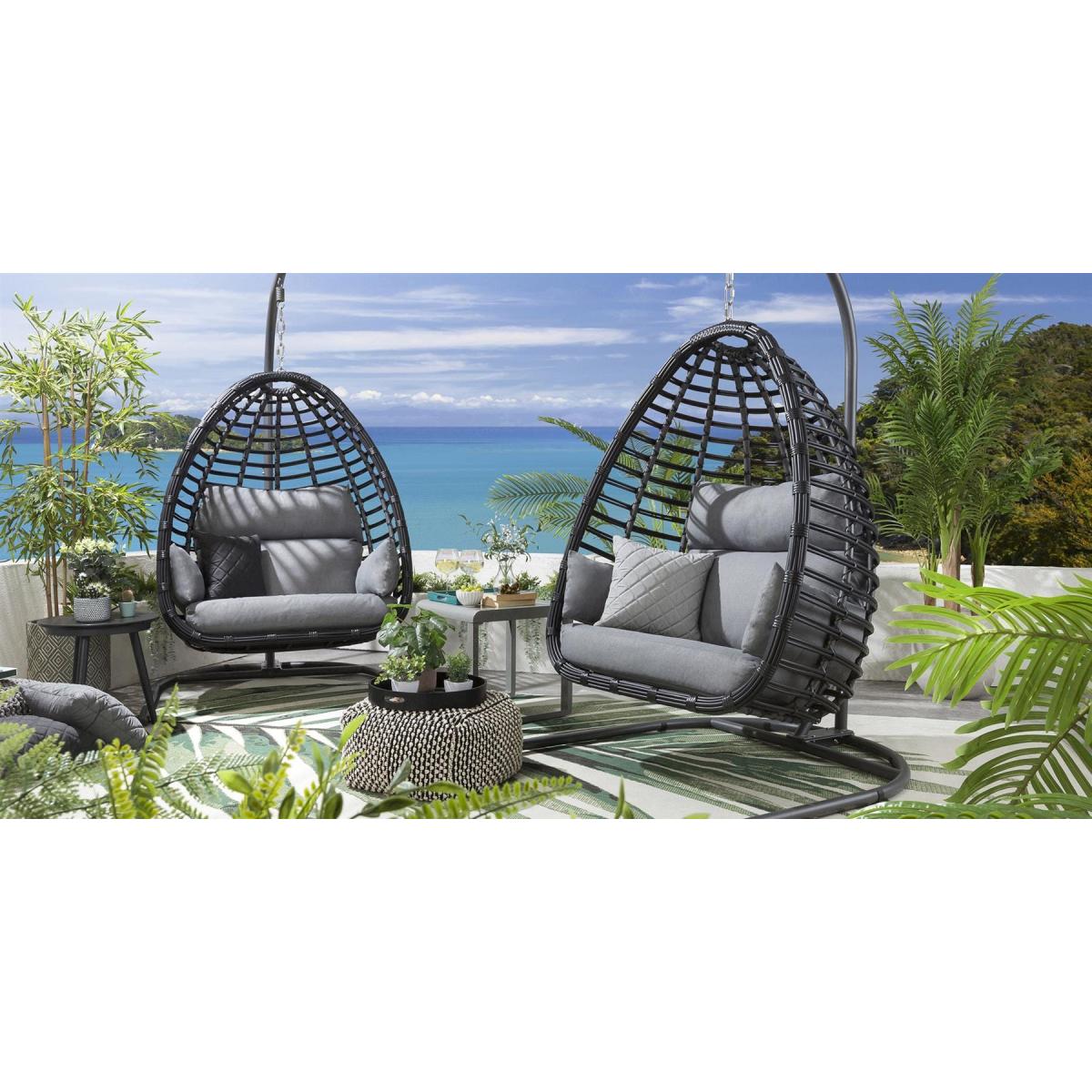 The Quatropi Bamboo style hanging chairs and sofas make a stunning sculptural statement in any garden. The beautiful teardrop shapes married with the strong horizontal bars provide a breathtaking image from any angle. All 2 and 3 seater sofas are available in either our coffee or charcoal colourways whist our single hanging chairs coming in our coffee, green, blue and grey colourways. Our single hanging chairs are totally unique in the market. The stunning teardrop shape not only looks amazing but provides a wider, flatter cocoon type seat which lends inself perfectly to curling up and getting cozy. The cushions have been developed with super-thick foam base cushions, split lumber / headrest soft fibre-filled back cushions and moveable armrest / scatter cushions. All cushion covers can be removed and are machine washable. The basket of the hanging chair is fully built for maximum stability, the frame comes boxed and does require minimal assembly and you may need a hand with hanging the basket on the frame. Our adjustable chain allows for different sitting heights, and the plastic support feet are moveable to help balance for uneven surfaces. Remember that none of our designs are available elsewhere and this latest generation of chairs keeps us at the very top of the premium market. W115cm D125cm H207cm Free Winter Cover Max Weight Capacity: 100kgs