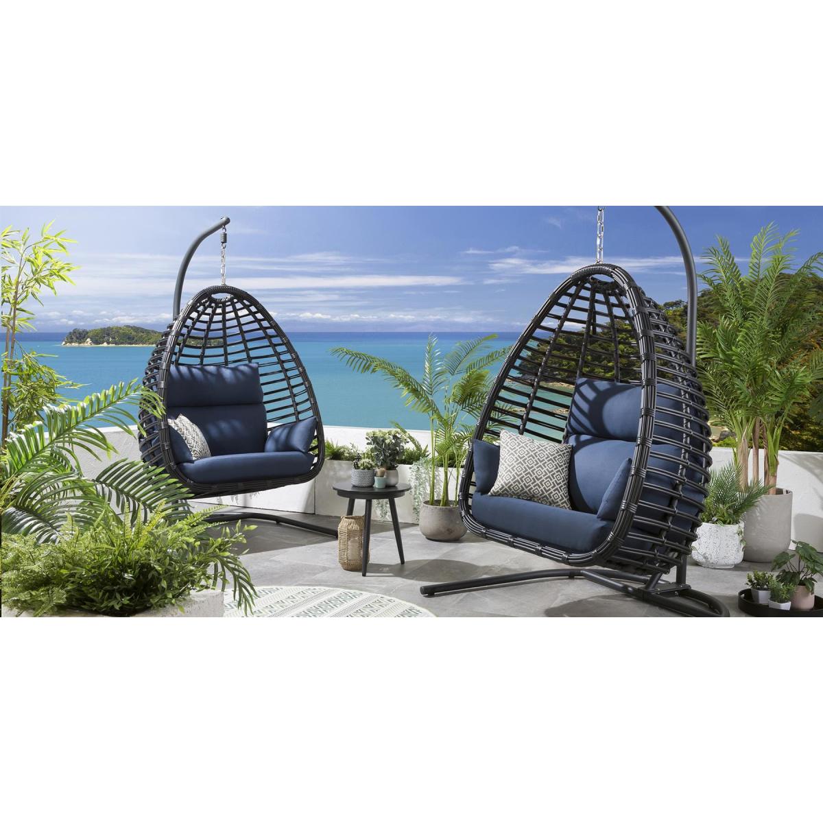 The Quatropi Bamboo style hanging chairs and sofas make a stunning sculptural statement in any garden. The beautiful teardrop shapes married with the strong horizontal bars provide a breathtaking image from any angle. All 2 and 3 seater sofas are available in either our coffee or charcoal colourways whist our single hanging chairs coming in our coffee, green, blue and grey colourways. Our single hanging chairs are totally unique in the market. The stunning teardrop shape not only looks amazing but provides a wider, flatter cocoon type seat which lends inself perfectly to curling up and getting cozy. The cushions have been developed with super-thick foam base cushions, split lumber / headrest soft fibre-filled back cushions and moveable armrest / scatter cushions. All cushion covers can be removed and are machine washable. The basket of the hanging chair is fully built for maximum stability, the frame comes boxed and does require minimal assembly and you may need a hand with hanging the basket on the frame. Our adjustable chain allows for different sitting heights, and the plastic support feet are moveable to help balance for uneven surfaces. Remember that none of our designs are available elsewhere and this latest generation of chairs keeps us at the very top of the premium market. W115cm D125cm H207cm Free Winter Cover Max Weight Capacity: 100kgs