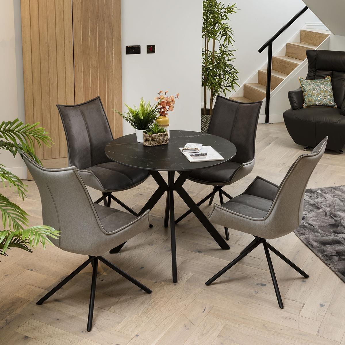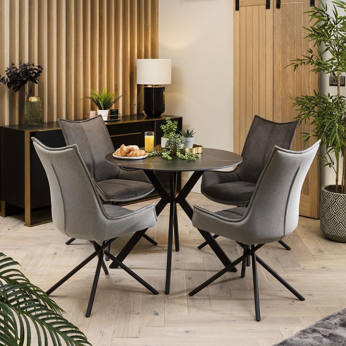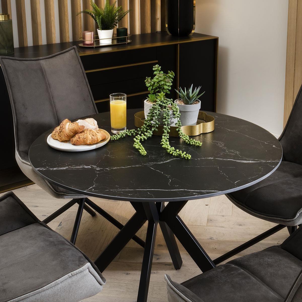 The Lena Dining Table will add a stunning industrial look to any living and dining area. The dining set has a large table top made of high-quality ceramic with a Matte Black finish in Marble Effect. The Round Marble Dining Table in Black is simplistic in design with a contemporary style that will comfortably seat 4 guests. The imposing black powder-coated metal table legs in a robust industrial look are a skilful addition to the sturdy ceramic marble top dining table. This exclusive dining table is constructed from a premium metal frame, complemented by a striking Matte Black ceramic marble effect top, creating a very stylish, modern product. This dining set includes 4 eye-catching, gorgeous Zena Luxury Carver Dining Chairs. The ultra-modern, flared design of the dining chair paired with the stylish dark grey, soft-touch upholstered seat and rotated black powder-coated metal legs make this contemporary carver dining chair a stunning addition to any home. Sit back, and enjoy your meal in style and comfort. Spread the cost our with interest-free finance options. Minimum spend applies.