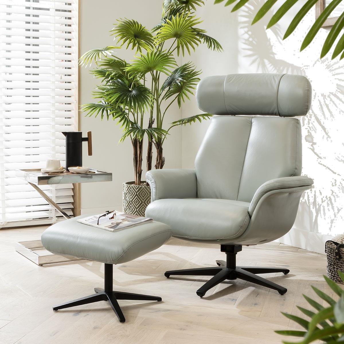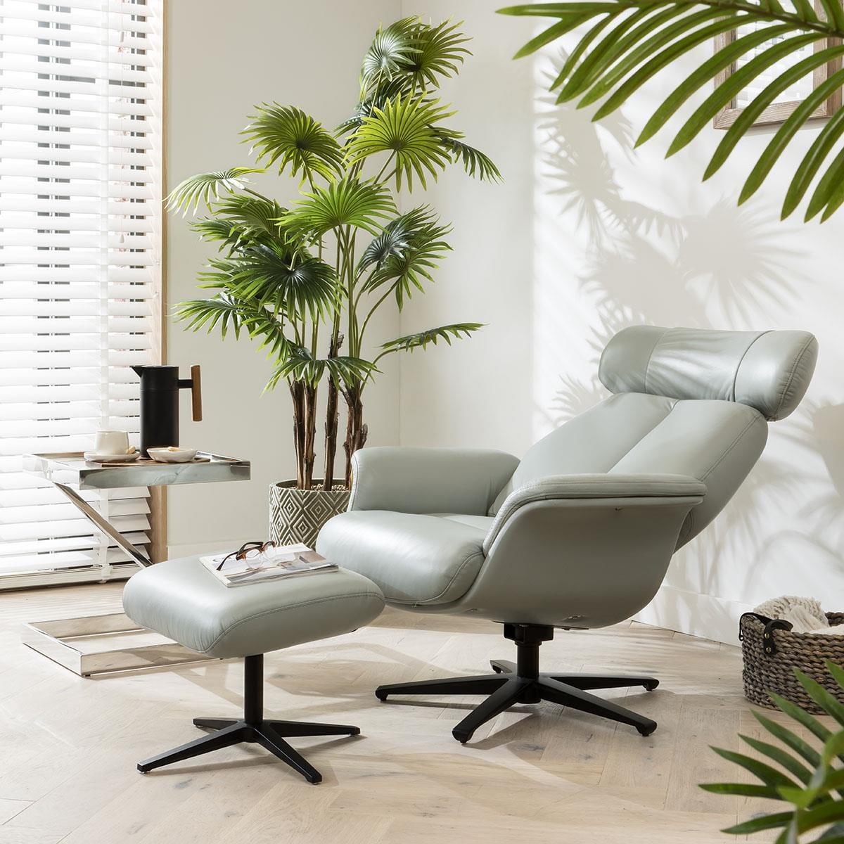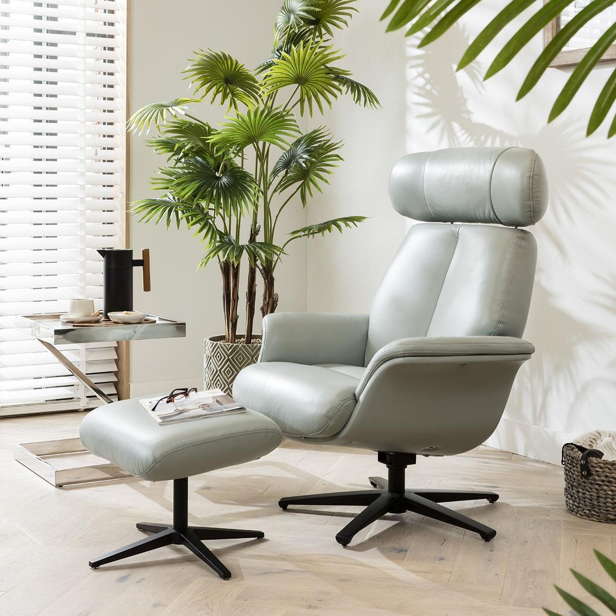 A clever combination of form and function, the Quatropi Svago leather reclining swivel armchair in blue has a modern design with natural lines that is perfect for any contemporary living space. The matching footstool is included and finishes off a magnificent chair. The swivel base and its unique padding ensure comfort and versatility in just about every position and the reclining mechanism makes this armchair easy to get into full relax mode. This model comes complete with an manually adjustable headrest and sufficient back height to provide luxury seating support regardless of user height. The Svago occasional chair is a luxury swivel recliner chair with generous padding, premium blue faux-leather upholstery all facing sides and a chrome metal star base that offers smooth and easy rotation. If you need more information about this product, use the Live Chat service to speak to the team or send us a message. Spread the cost our with interest-free finance options. Minimum spend applies. W81cm D86cm H103cm A modern recliner armchair with swivel base and matching footstool Premium Quality Furniture
