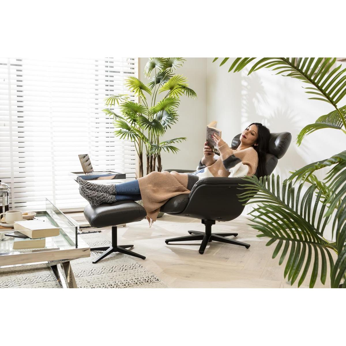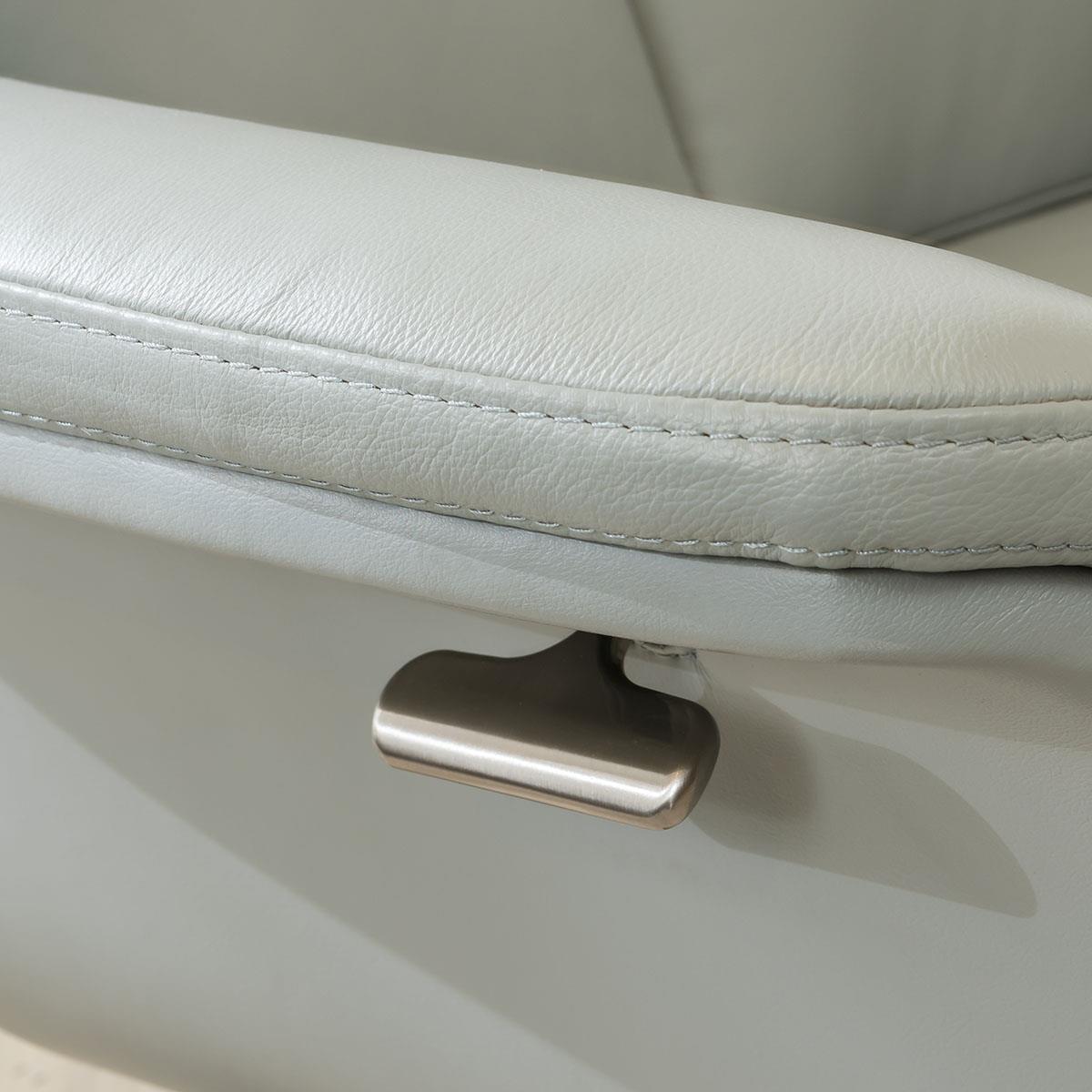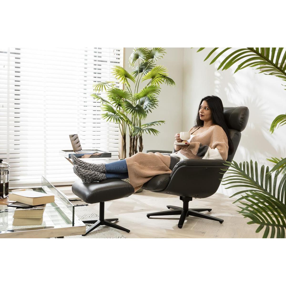 A clever combination of form and function, the Quatropi Svago leather reclining swivel armchair in blue has a modern design with natural lines that is perfect for any contemporary living space. The matching footstool is included and finishes off a magnificent chair. The swivel base and its unique padding ensure comfort and versatility in just about every position and the reclining mechanism makes this armchair easy to get into full relax mode. This model comes complete with an manually adjustable headrest and sufficient back height to provide luxury seating support regardless of user height. The Svago occasional chair is a luxury swivel recliner chair with generous padding, premium blue faux-leather upholstery all facing sides and a chrome metal star base that offers smooth and easy rotation. If you need more information about this product, use the Live Chat service to speak to the team or send us a message. Spread the cost our with interest-free finance options. Minimum spend applies. W81cm D86cm H103cm A modern recliner armchair with swivel base and matching footstool Premium Quality Furniture