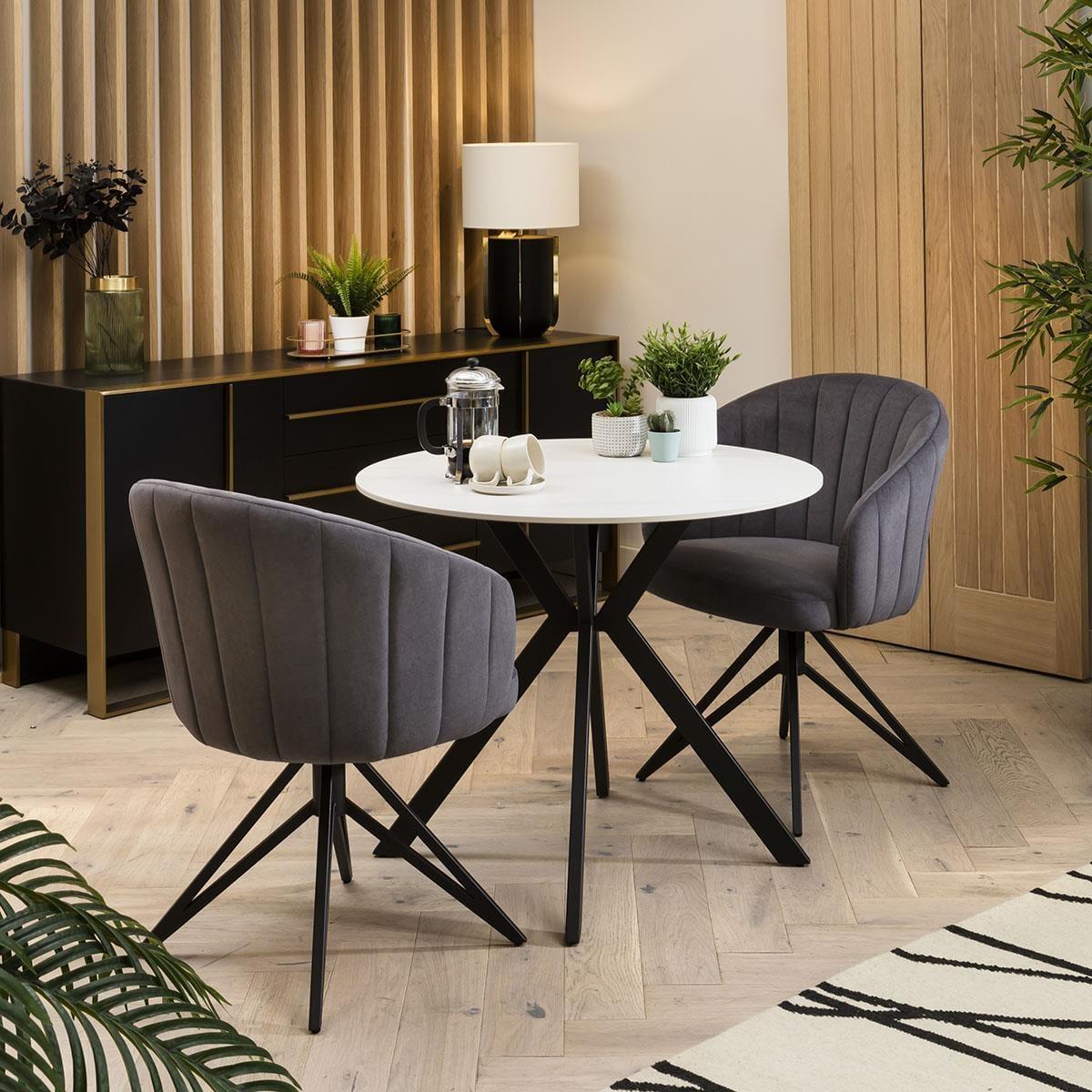 The Lena Dining Set will add a stunning industrial look to any living and dining area. The table has a large table top made of high-quality ceramic with a Matte White finish in Marble Effect. The Round Marble Dining Table in White is simplistic in design with a contemporary style that will comfortably seat 4 guests. The imposing black powder-coated metal table legs in a robust industrial look are a skilful addition to the sturdy ceramic marble top dining table. This exclusive dining table is constructed from a premium metal frame, complemented by a striking Matte White ceramic marble effect top, creating a very stylish, modern product. The simple elegant style of these upholstered chairs are enhanced by the plain structure, powder-coated metal legs, and shell-shaped seat with a half-moon recess. This swivel dining chair really has it all, clean contemporary lines, attractive ribbed upholstery detailing and a fully cushioned seat and back upholstered in premium dark grey fabric. The 9214 rotating grey dining chair with ribbed stitching, comes with splayed black metal powder-coated hairpin legs with a swivel mechanism, making it easy to get out of and into again. Spread the cost our with interest-free finance options. Minimum spend applies.