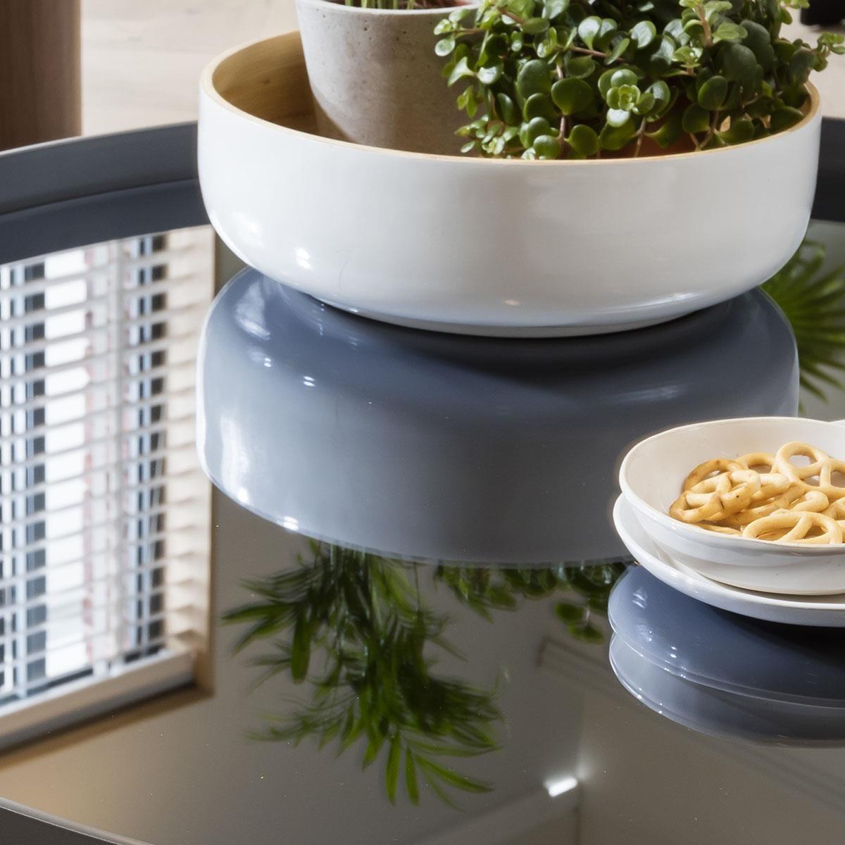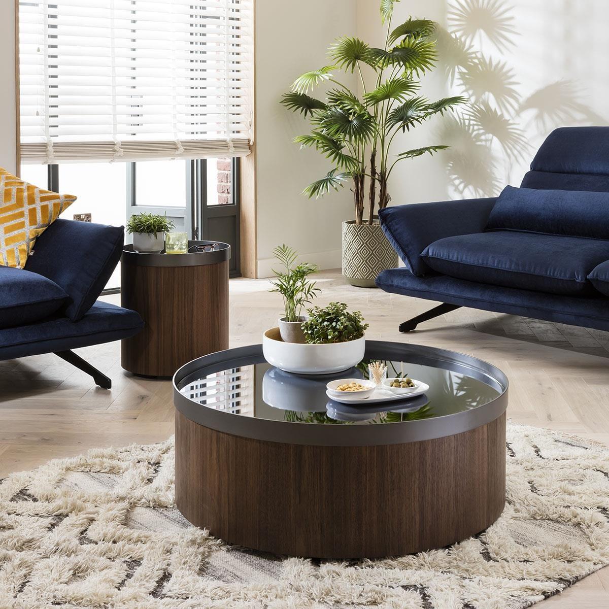 The cylindrical Brun-Luxe coffee table features a metal crown on its top in a space grey finish. The gorgeous and contemporary Brun-Luxe round coffee table has been expertly crafted using quality materials and complemented with our premium walnut veneer. The 90cm diameter round coffee table is 33.5cm high and has a grey mirror tabletop, surrounded with a space grey metal band around the edge of the table that perfectly complements the warm wooden tones of the base, adding a touch of class to the piece. The striking wood design of Brun-Luxe collection allows the natural beauty of the markings and varying wood tones to show through. The modern design presents a unique and compelling sculptural minimalism. If you are looking for products that work in an assortment of interiors then this one simply cannot be overlooked. A Quatropi Brun-Luxe coffee table expresses understated elegance, and is a useful addition to your home. Pair it with the matching Brun-Luxe round side table and the result is very classy living room furniture. W90cm D90cm H34cm Smoked Mirror Top Matching Items Available