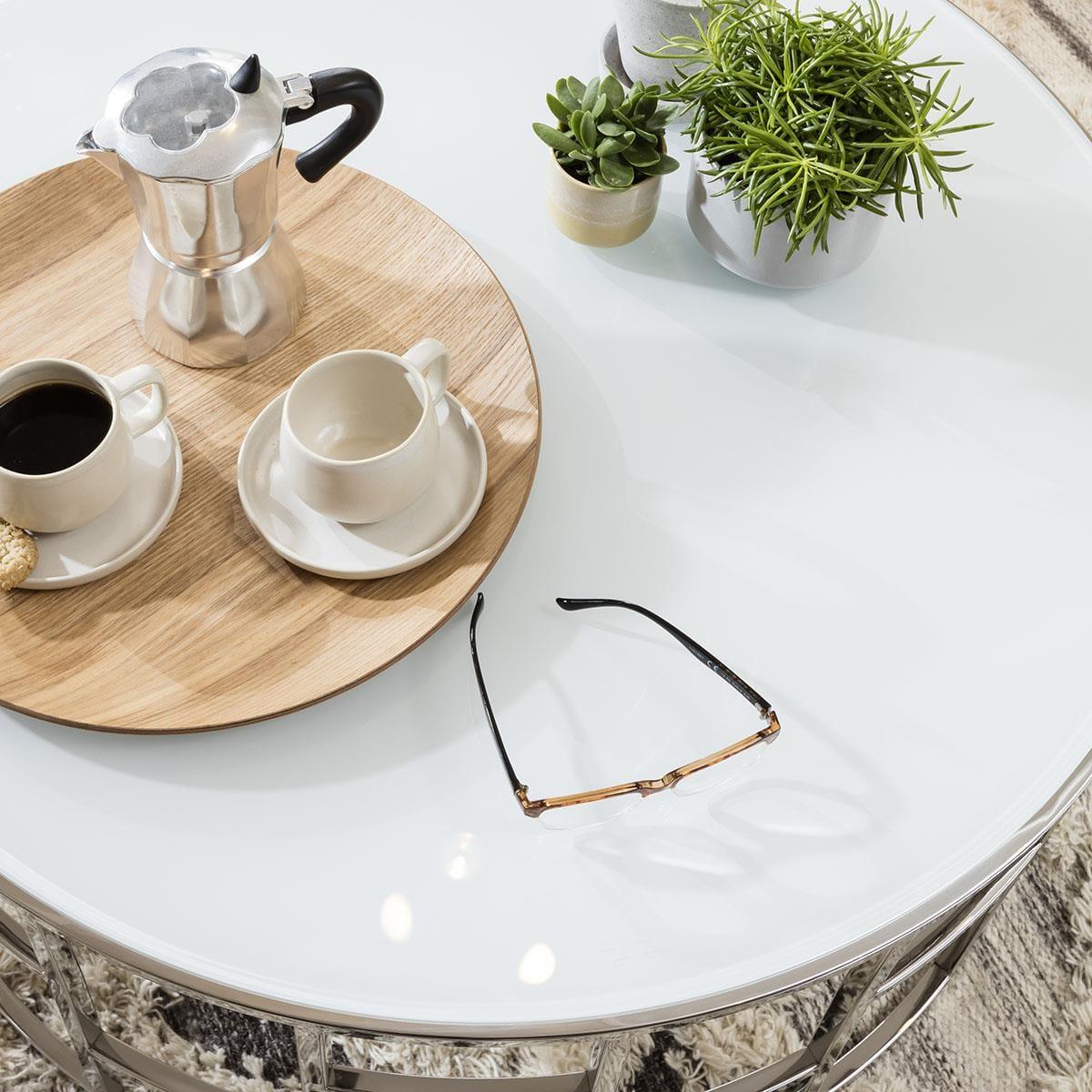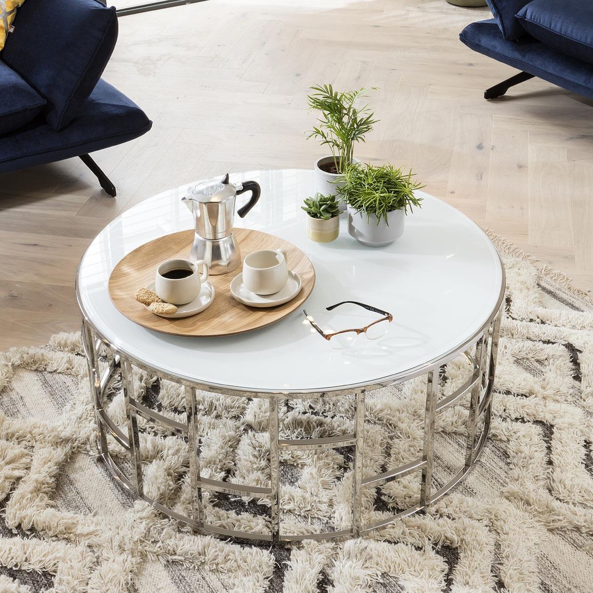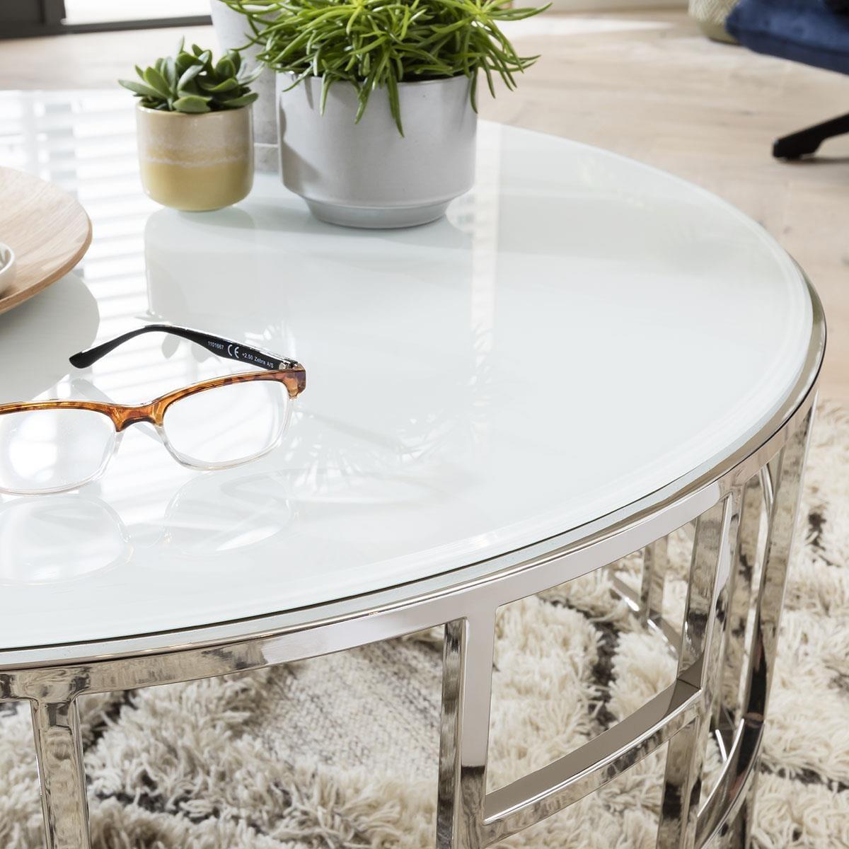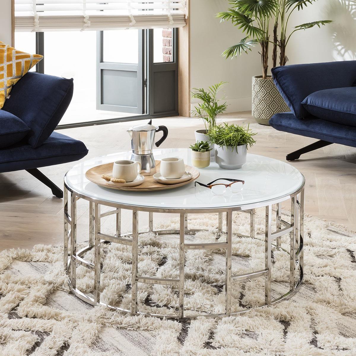 A chic addition to most decors, the white glass and metal coffee table from the Blanc-Luxe collection will make a stunning centrepiece for your living room. There is a luxurious look to its design and with a super white round tempered glass table top, this piece will stand out in any modern home. The 90cm coffee table has minimal metal framing and is formed from smooth stainless steel, with a highly reflective silver finish lending an air of lightness. Quatropi's Blanc-Luxe collection is a refined collection of beautifully shaped, contemporary stainless steel tables that will enhance all interiors with the added luxurious finesse of the white glass top. The perfect coffee table should sit quite low down. That's why most premium coffee tables at Quatropi sit about 40cm off the ground. The Blanc-Luxe modern coffee table sits at an ideal height of 37.5cm and being white and silver, works amazingly with a variety of interior decors. W90cm D90cm H38cm Unique Geometric Design Tempered glass top
