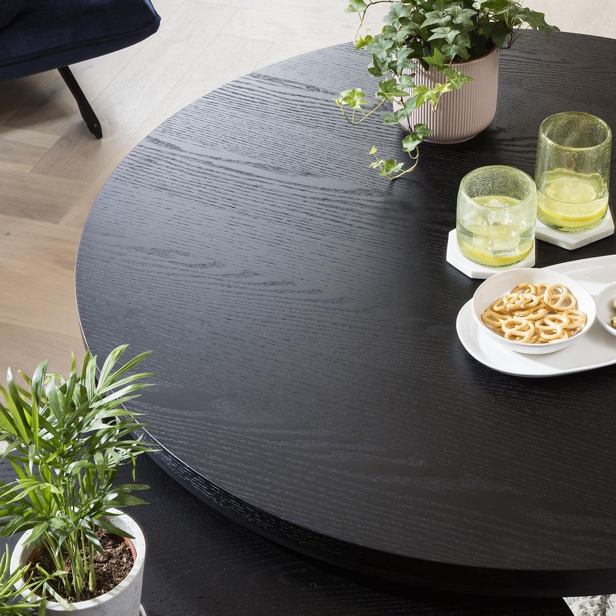 The Quatropi round nesting coffee table ensures long lasting durability. The frame is expertly crafted from premium black matt coated metal. This set of two coffee tables (1000mm & 800mm) boast a contemporary, stylish design with an industrial feel. Characterised by the black oak table top, this set of black round coffee tables are minimal by design, with premium materials and finishing. Ensuring a space saving solution, the coffee tables slot together as and when they are in use. W100cm D100cm H44cm Black Oak Effect Finish Matching Items Available