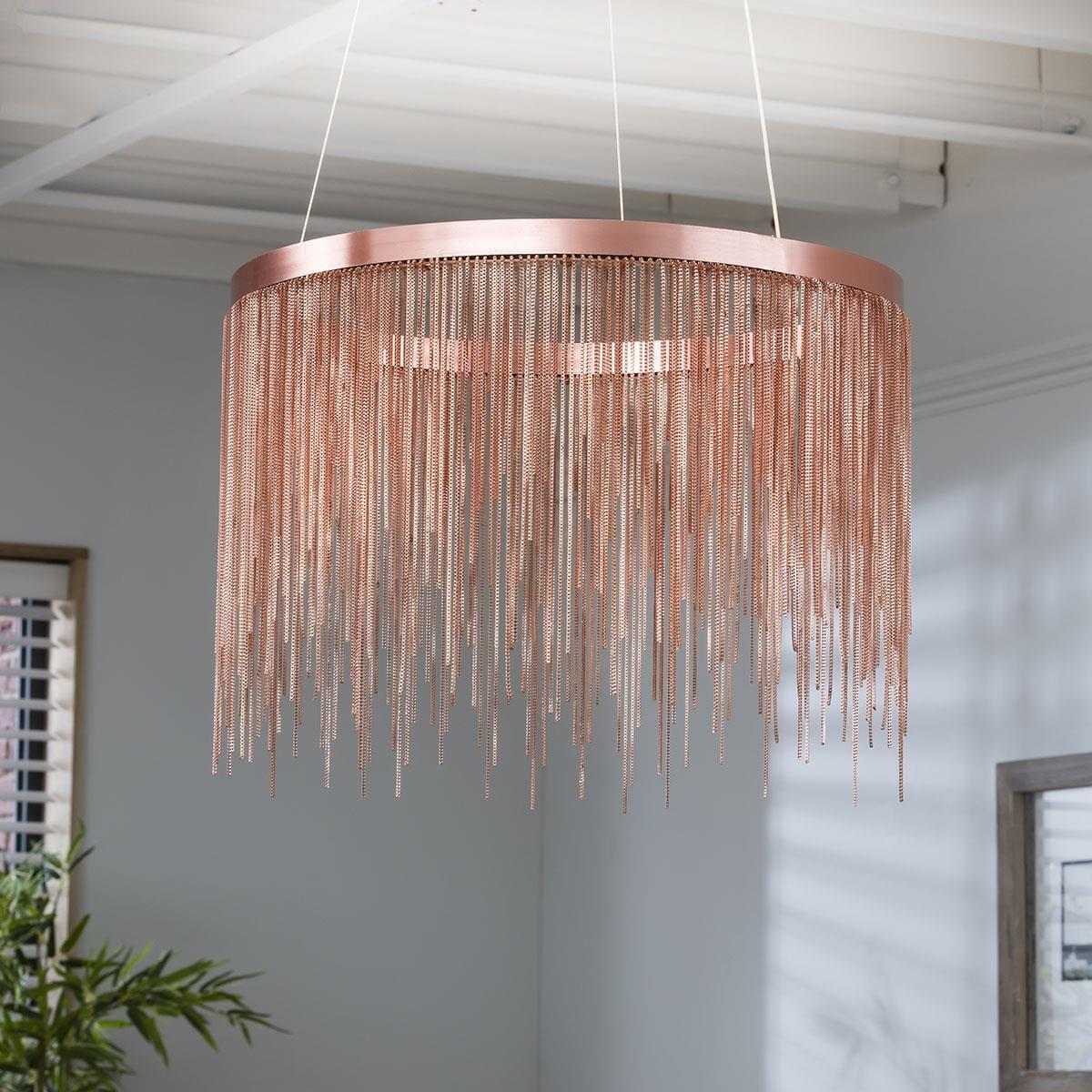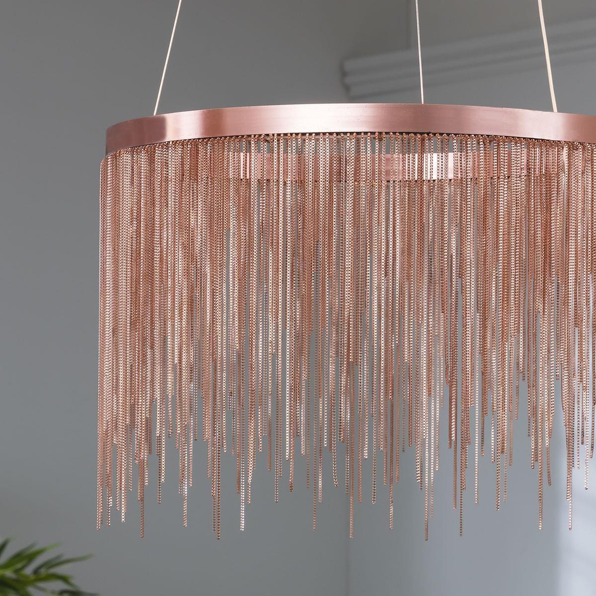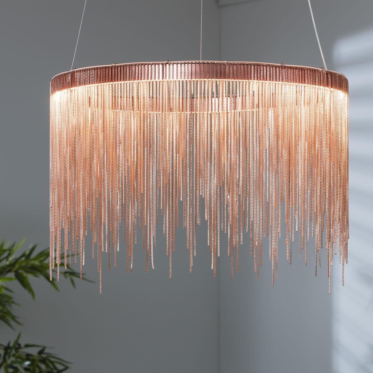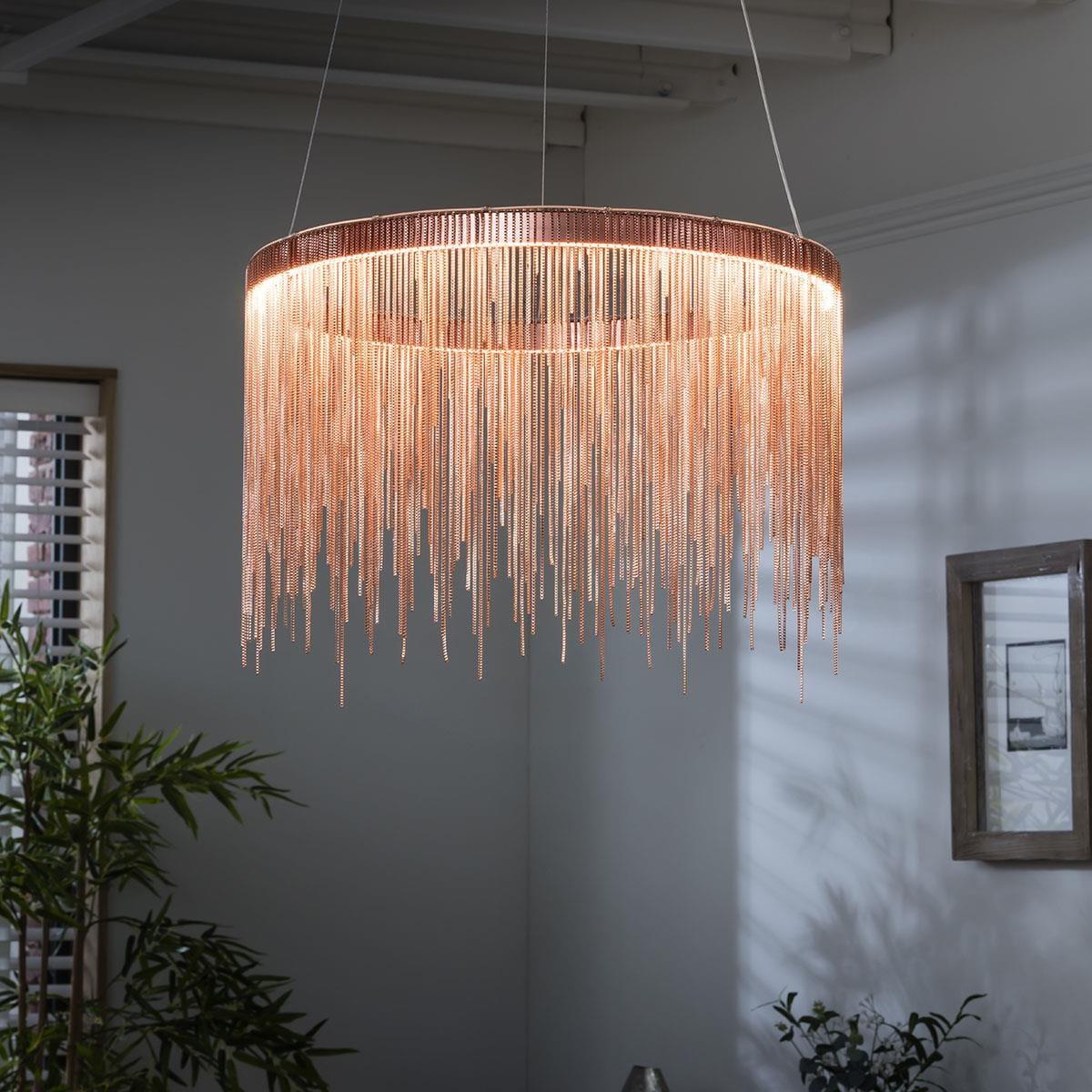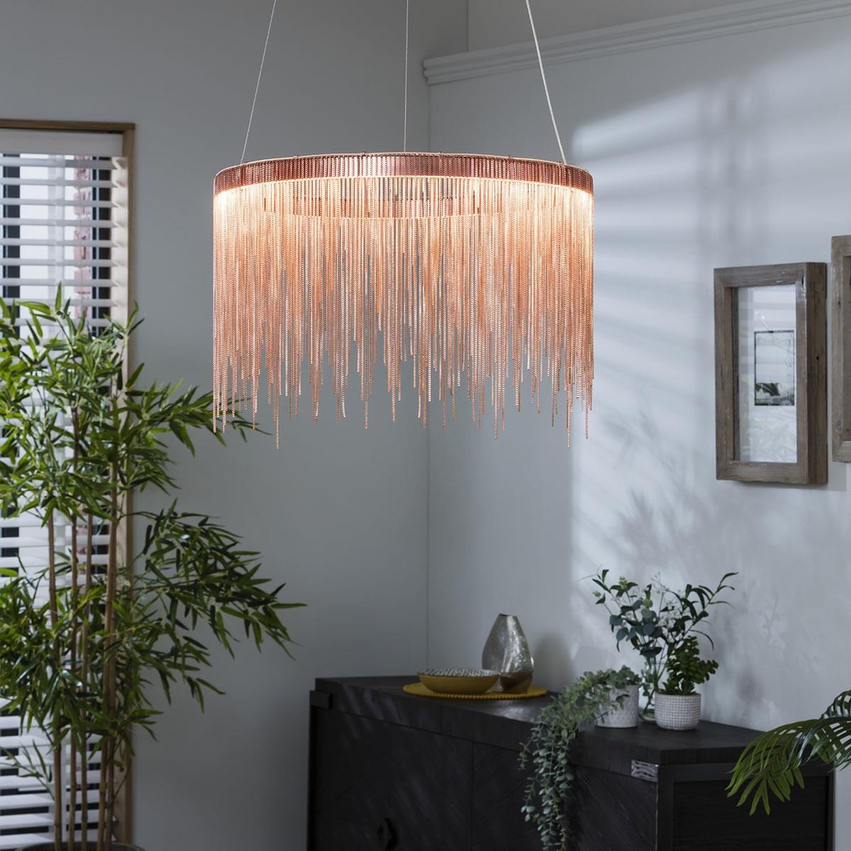 The Lux Ceiling Ring Light is a stunning, tassel ring ceiling pendant boasting luxurious rose gold tones. The ceiling light pendant is crafted with delicate cascading role gold plated chains, perfect for both traditional and contemporary homes, the Lux Ring Ceiling Light fitting would bring a bright, modern feel to any home. This fitting features integrated LED light with three colours. If you need more information about this product, use the Live Chat service to speak to the team or send us a message. This pendant is sure to be a standout feature. LED Lightsource Power: 20W 3 colours switch CCT: 3000K/4500K/6500 K W50cm D50cm H0cm Round Rose Gold Ring Tassel Ceiling Light Pendant Includes integrated LEDs