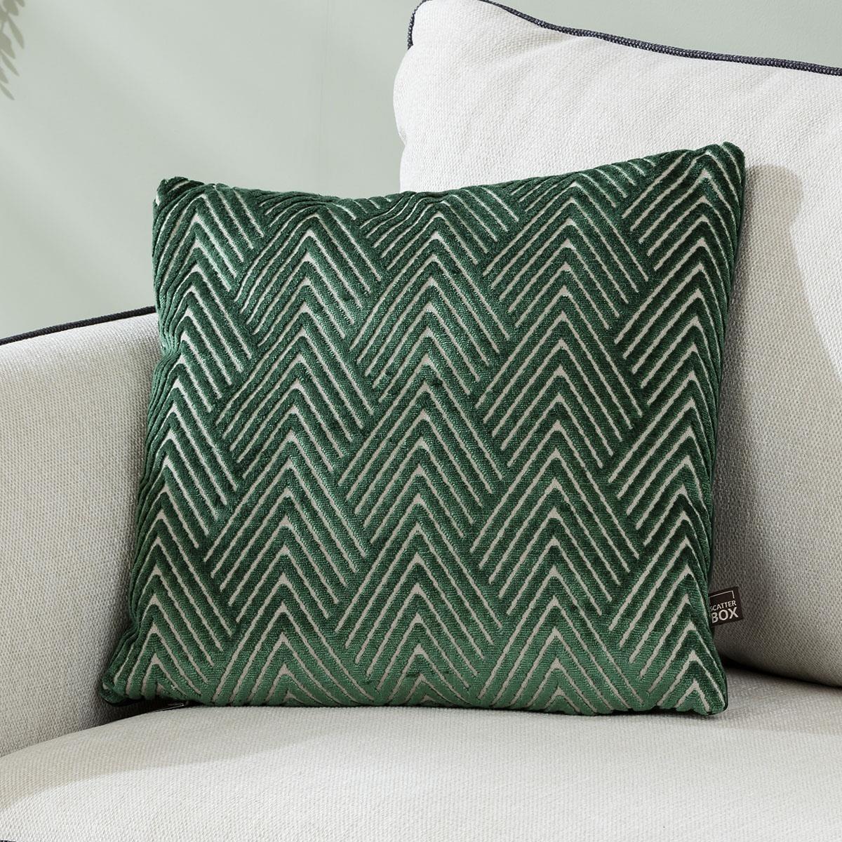 Lavish cut velvet in a contemporary geometric design with a coordinating green velvet reverse. If you need more information about this product, use the Live Chat service to speak to the team or send us a message. Spread the cost our with interest-free finance options. Minimum spend applies. W43cm D12cm H43cm Beautiful cut velvet fabric Velvet reverse with knife edge finish