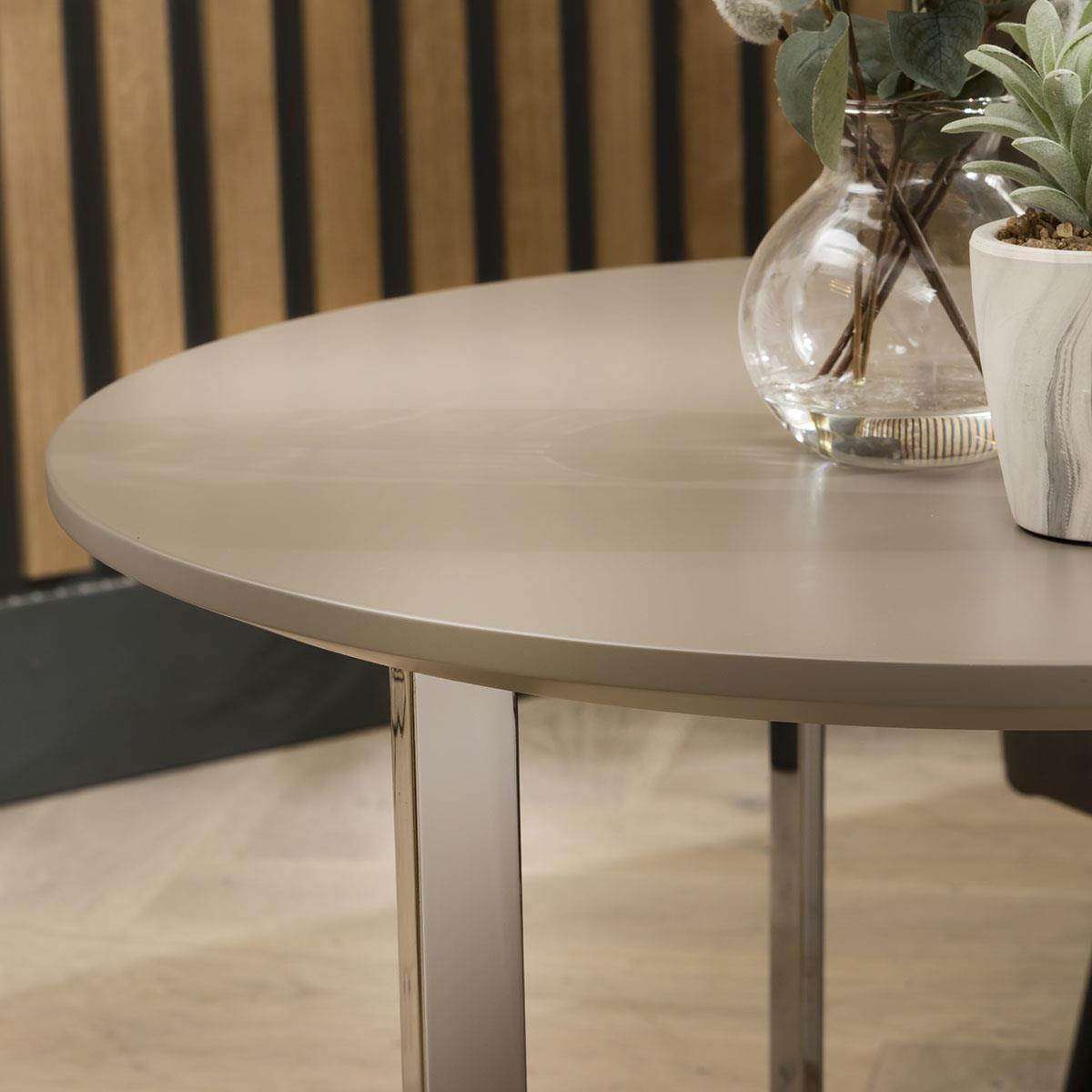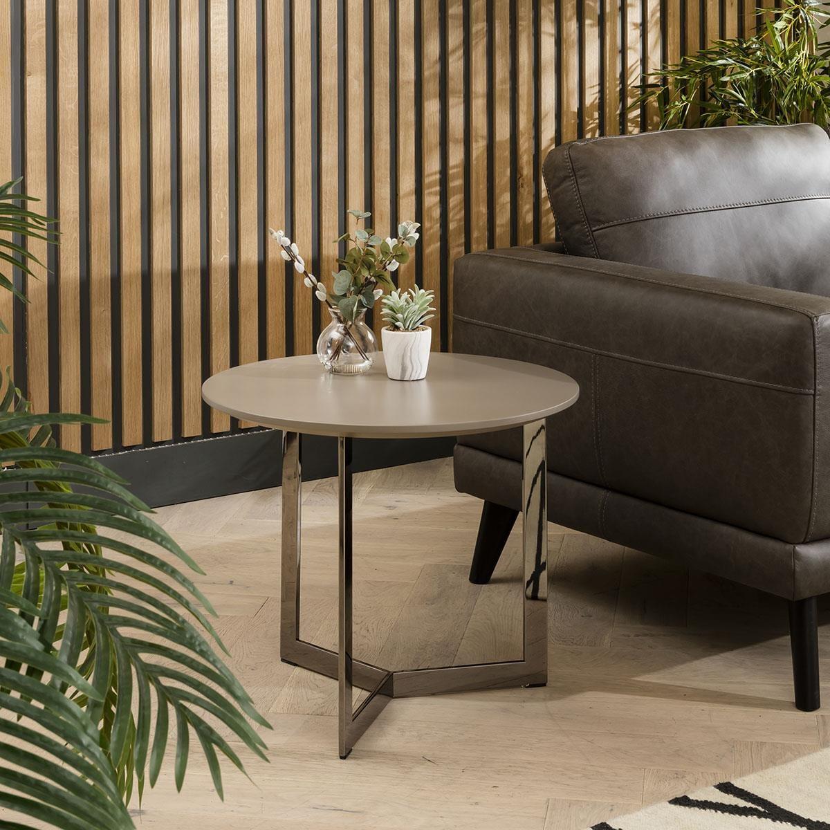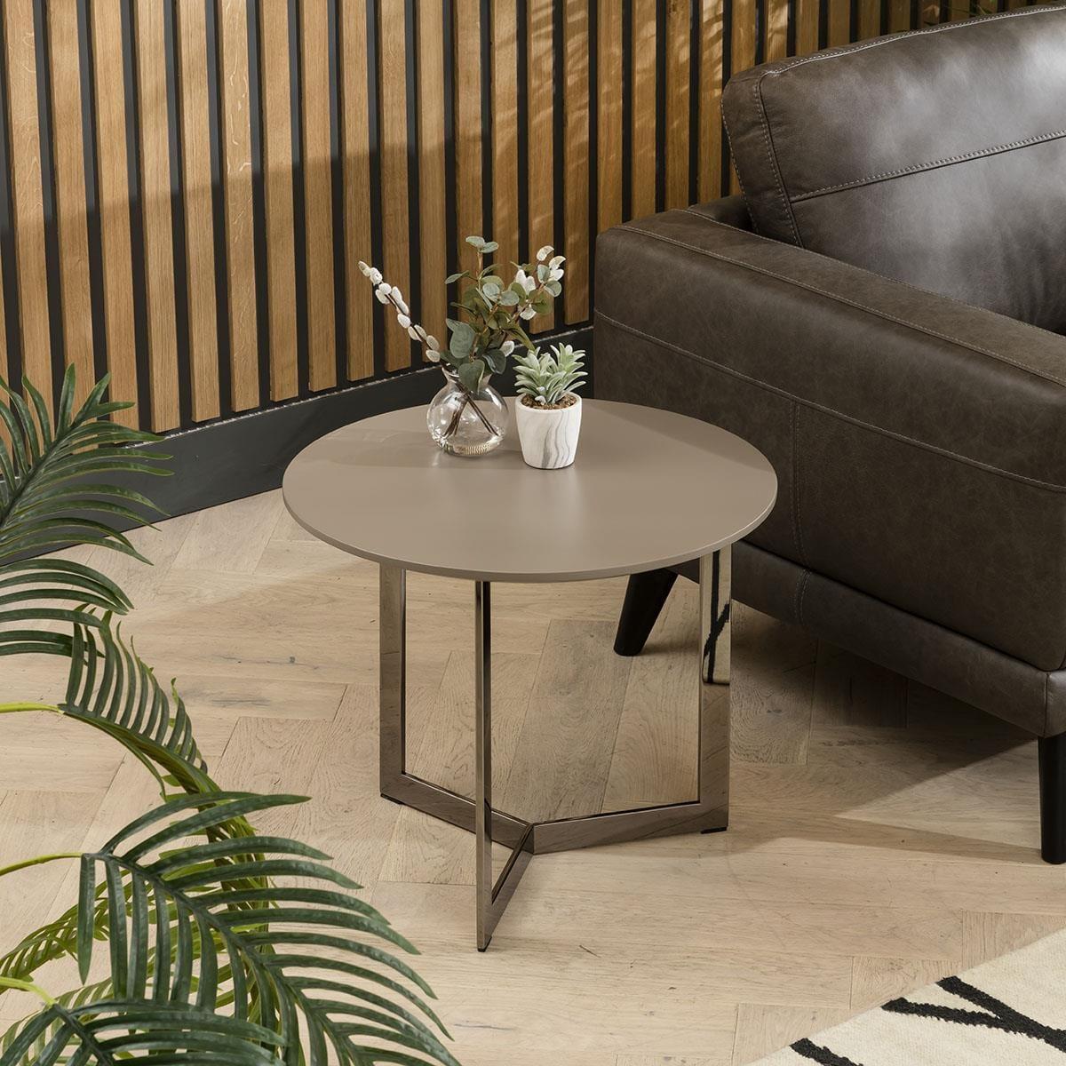 Our Matte Taupe Round 60cm Contemporary Side Table has been expertly crafted with an ultra-modern polished stainless steel pedestal. The Eternal Round Lamp Table has a slim profile that will work with any modern or classic decor. Attractive and functional, the Eternal End Table is exactly what you need to complete your room. Pair it up to frame your sofa set or bed for a glam finish. Quatropi have a wide range of side tables to suit any taste, from robust, industrial-esque collections to shiny, elegant glass side tables. W60cm D60cm H51cm Modern Taupe Side Table Polished Metal Base
