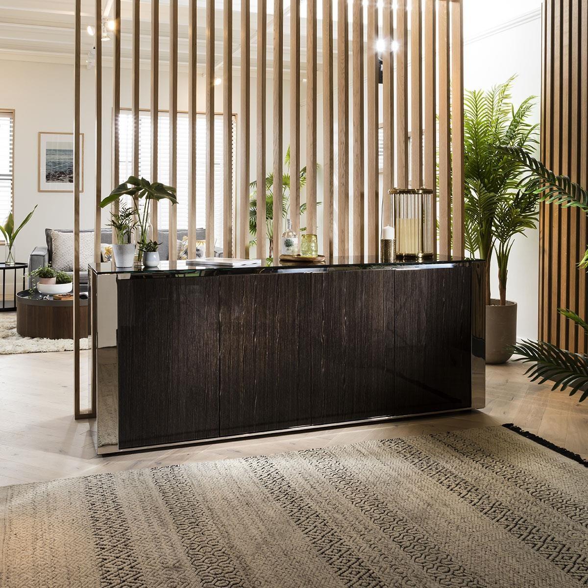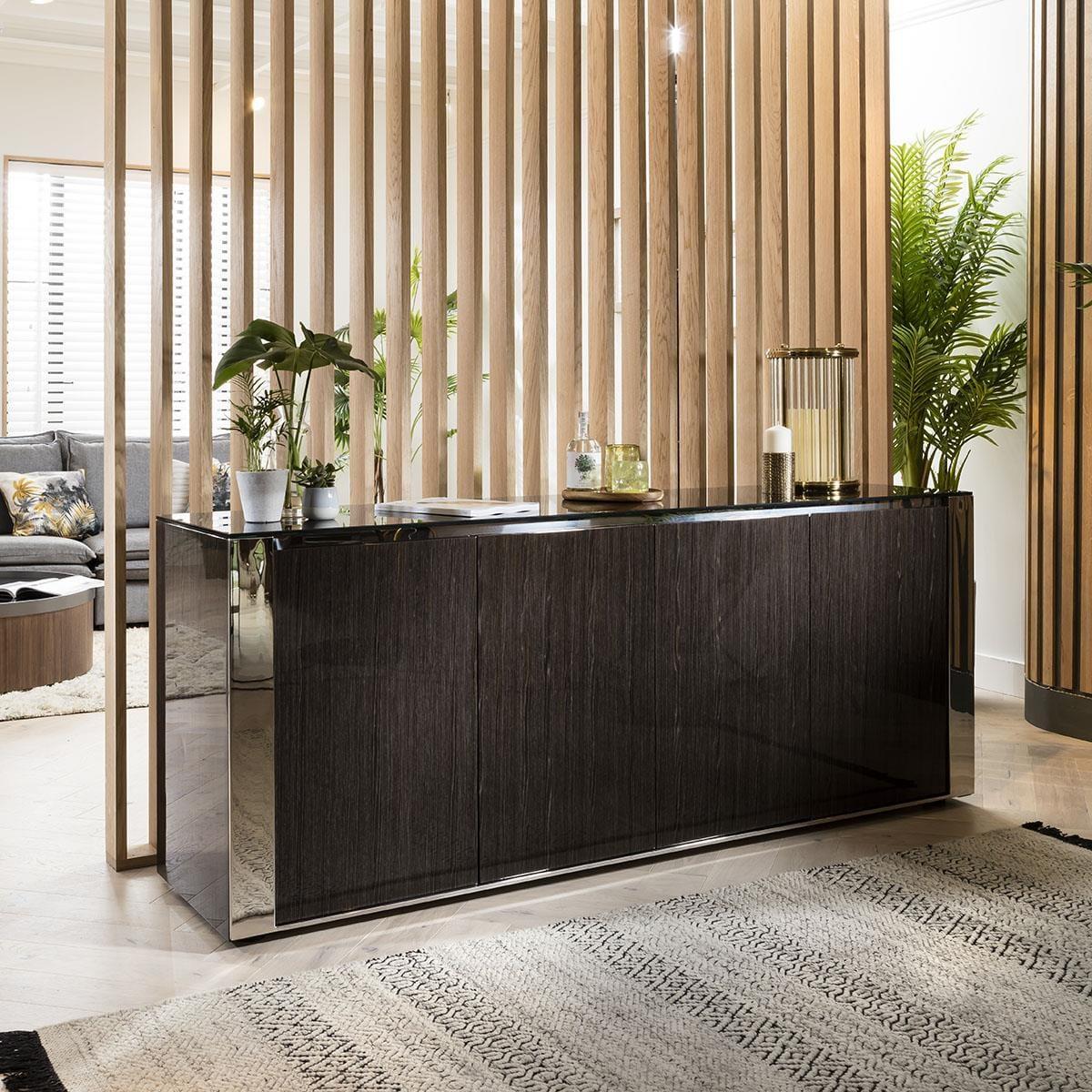 The exclusive Sophie smoked oak gloss sideboard features a harmonious combination of clean lines with shiny stainless steel framing and is the perfect solution to storage dilemmas in modern and contemporary homes. With it's deep black tempered glass top, the 200cm Sophie smoked oak gloss sideboard buffet has been designed with both style and quality in mind and definitely adds an attraction point to your space. Styled with contemporary design in mind, the Sophie collection combines the best materials with superior composition. Crafted from wood and given a smoked oak gloss finish, the Sophie range is completed by extremely shiny stainless steel accents and legs. The high gloss finish is easy to wipe clean and will intensify the mood in any dining or living area. We are specialists in high-end dining, and from our experience, a truly luxurious dining interior needs a sideboard. Here at Quatropi you will find something to suit any decor, including small to large sideboard cabinets, and a whole host of colours and materials, like premium oak cupboard units to elegant pure white sideboard cabinets. As part of the Sophie range, it matches perfectly with the smoked oak high gloss furniture in the collection to create a sophisticated yet homely dining environment. Please note this item is ground floor delivery only. If you need more information about this product, use the Live Chat service to speak to the team or send us a message. Spread the cost our with interest-free finance options. Minimum spend applies. W200cm D50cm H82cm Stainless Steel Detailing Matching Items Available