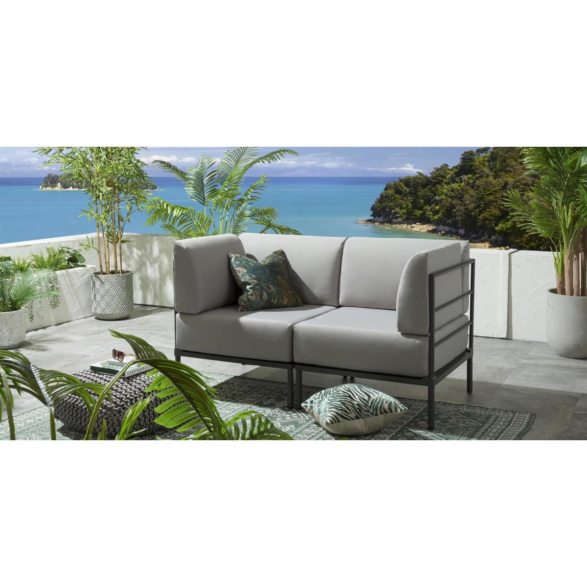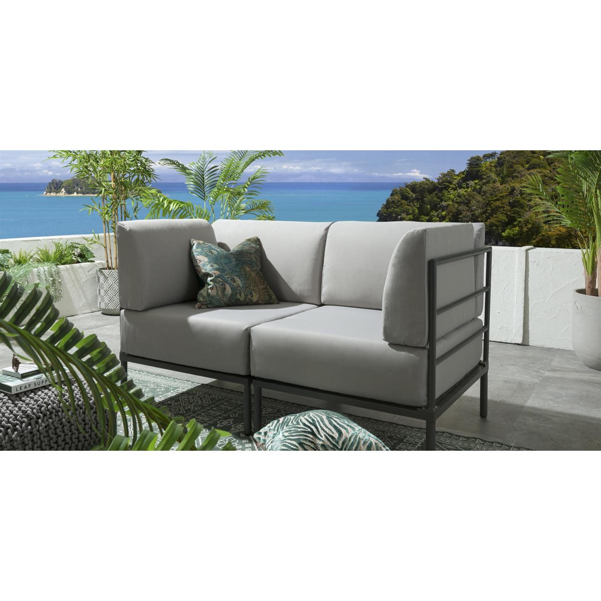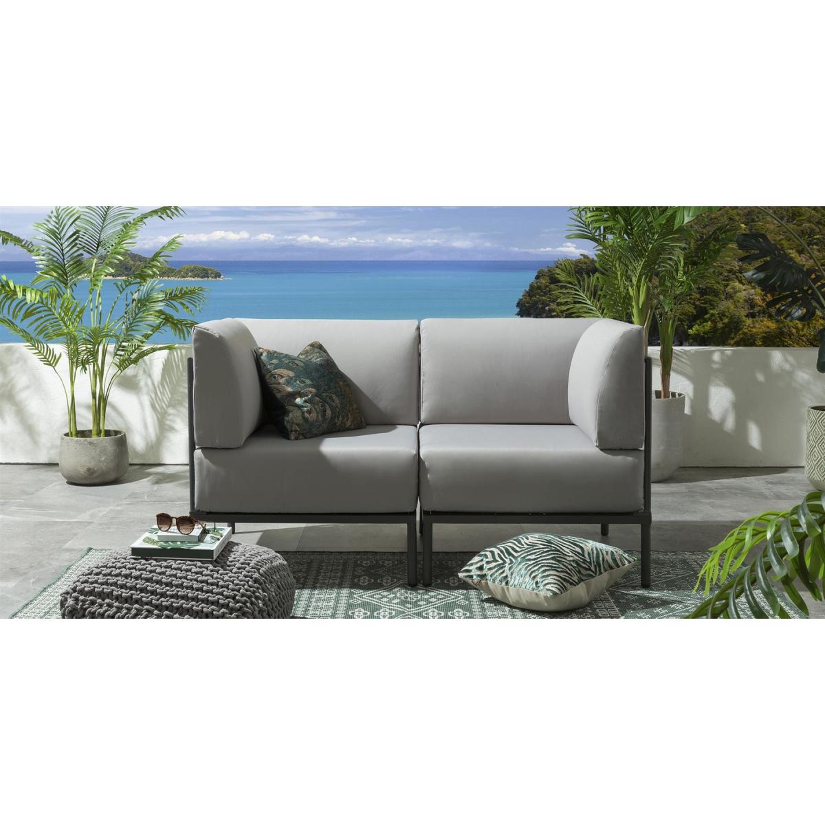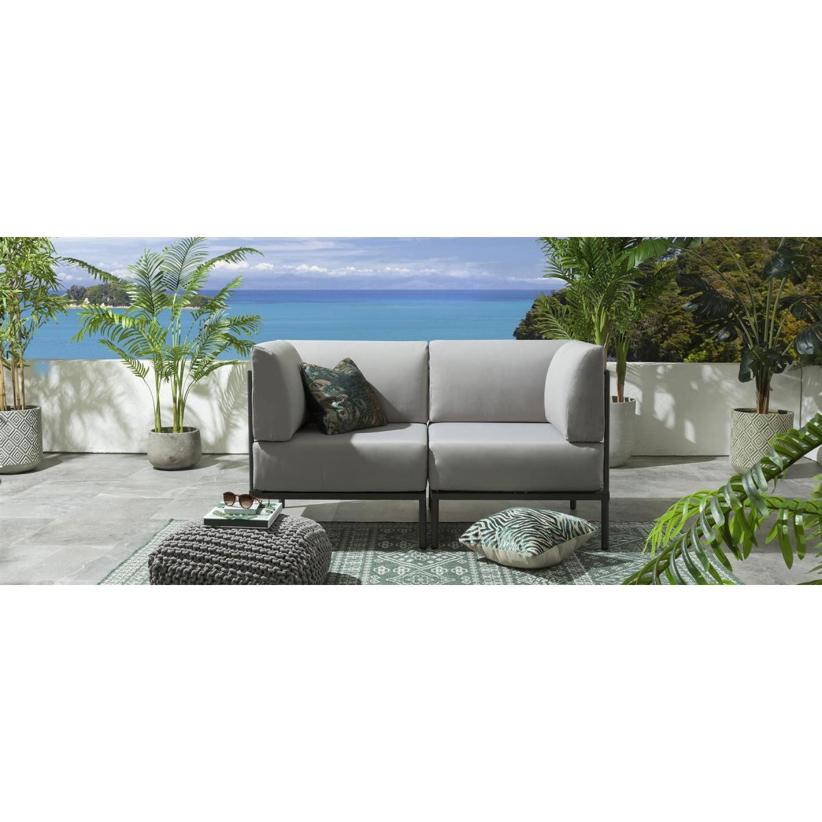 Add a touch of outdoor luxury to garden with the Alfie Small 2 Seater Outdoor Sofa. The sofa cushions are covered in a premium outdoor silver coloured fabric. Crafted with a fully modular design, the possibilities are infinite as you curate a personalised outdoor sofa arrangement to complement your patio. The robust frame, crafted entirely from aluminium and outfitted with premium stainless steel fittings, withstands the most arduous weather conditions, ensuring durability for years to come. The Alfie garden sofa range also features a matching coffee table, embellished with a real ceramic top that is resistant to scratches, adding a touch of glamour to any outdoor oasis. Relax in the garden and indulge in the exquisite Alfie outdoor sofa collection, a masterpiece years in the making. Our dedication to perfection has resulted in an unparalleled garden sofa that exudes opulence and sophistication and at great value. The outdoor sofa collection features comfortable foam cushions that can be removed and stored away when not in use. The sofa set also includes clips to attach the modular pieces together in your desired configuration. W144cm D72cm H73cm Fully modular design: this set includes 2x corner sections Winter covers can be bought as optional extra: the sofa has all-weather full aluminium frames