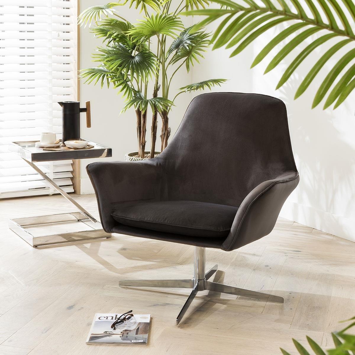 This swivel chair's contemporary design features a subtly curved backrest and low sloping armrests, accentuated by feature stitching detailing. It boasts premium dark grey upholstery and a stable silver metal base with a 360-degree swivel mechanism that makes it a perfect office chair and the piece will also be a perfect addition to your living room. If you need more information about this product, use the Live Chat service to speak to the team or send us a message. Spread the cost our with interest-free finance options. Minimum spend applies. W84cm D80cm H86cm Seat Height 45cm Premium Swivel Accent Chair in Dark Grey
