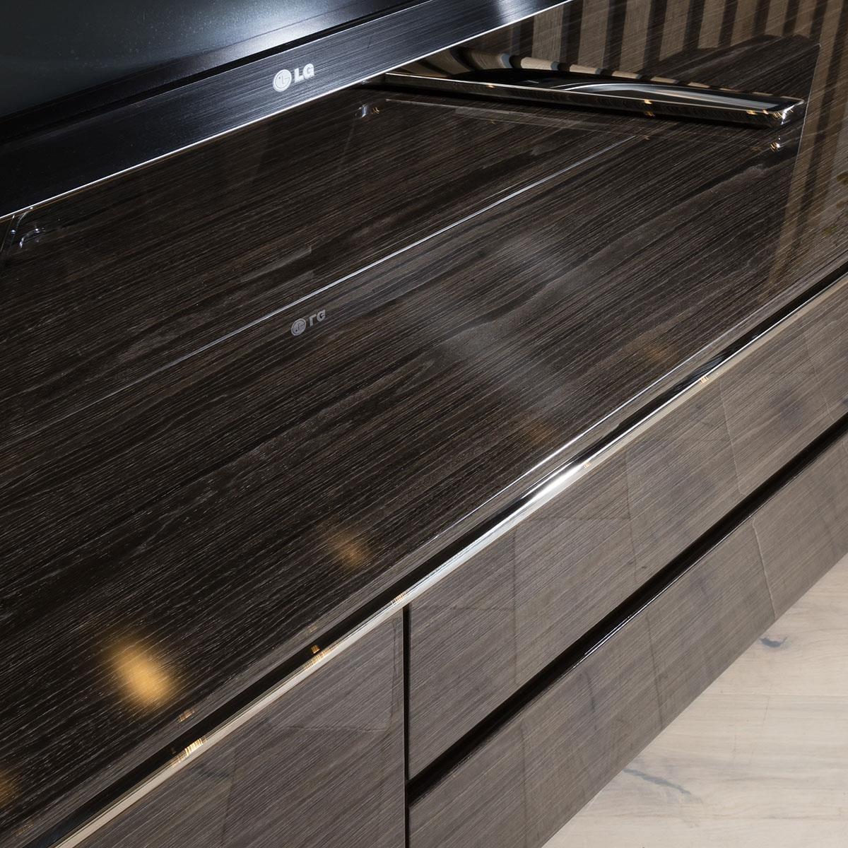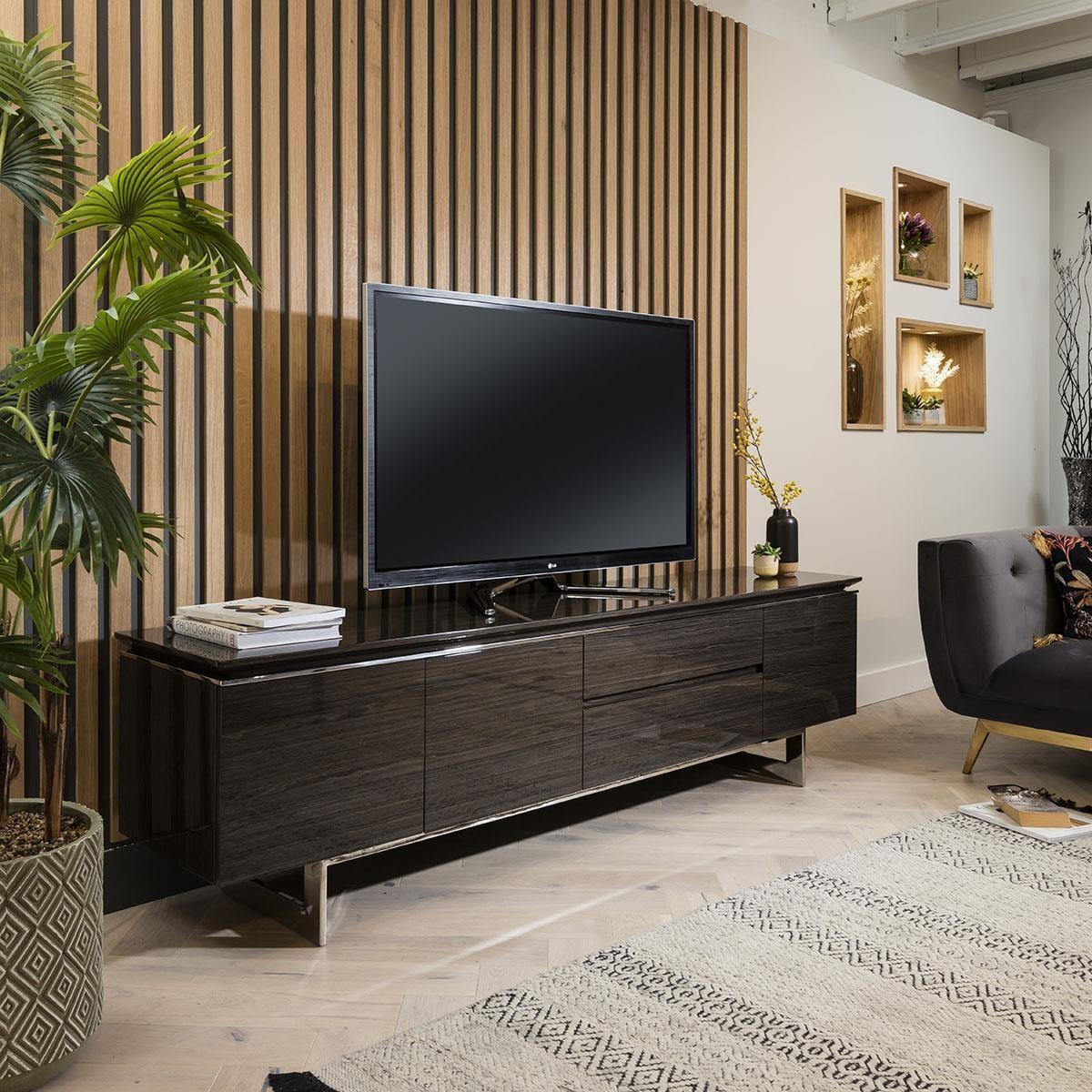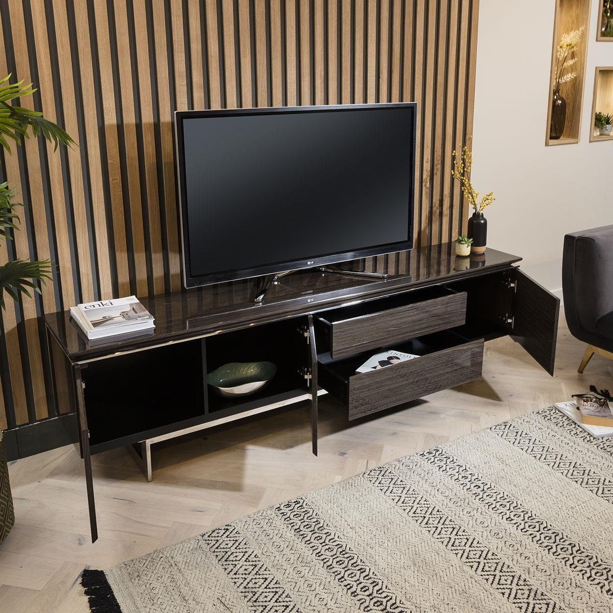 The Quatropi N248. F TV cabinet is designed with gorgeous sleek lines and a standout beveled edge top, with a polished stainless steel base - this TV stand captures your attention from every angle. The TV stand is expertly crafted and complemented by practical design with a plethora of storage, featuring three doors that open to reveal abundant cabinet space and two spacious drawers, this media stand is built to provide a place to store all of your media or living room necessities. Complemented with a practical design, this simple unit with stylish form has a smoked oak gloss finish for a unique look. Sleek metal lining flows through the boundaries to justify its popularity. Spread the cost our with interest-free finance options. Minimum spend applies. W220cm D44cm H60cm Lacquered finish & shiny stainless steel base Fully Assembled