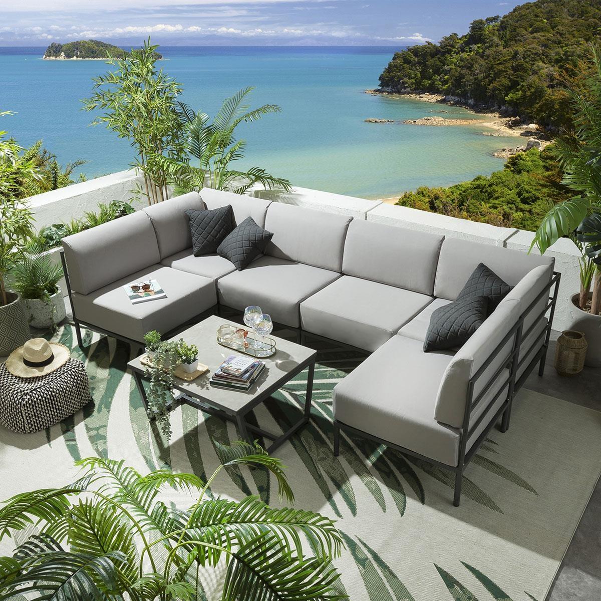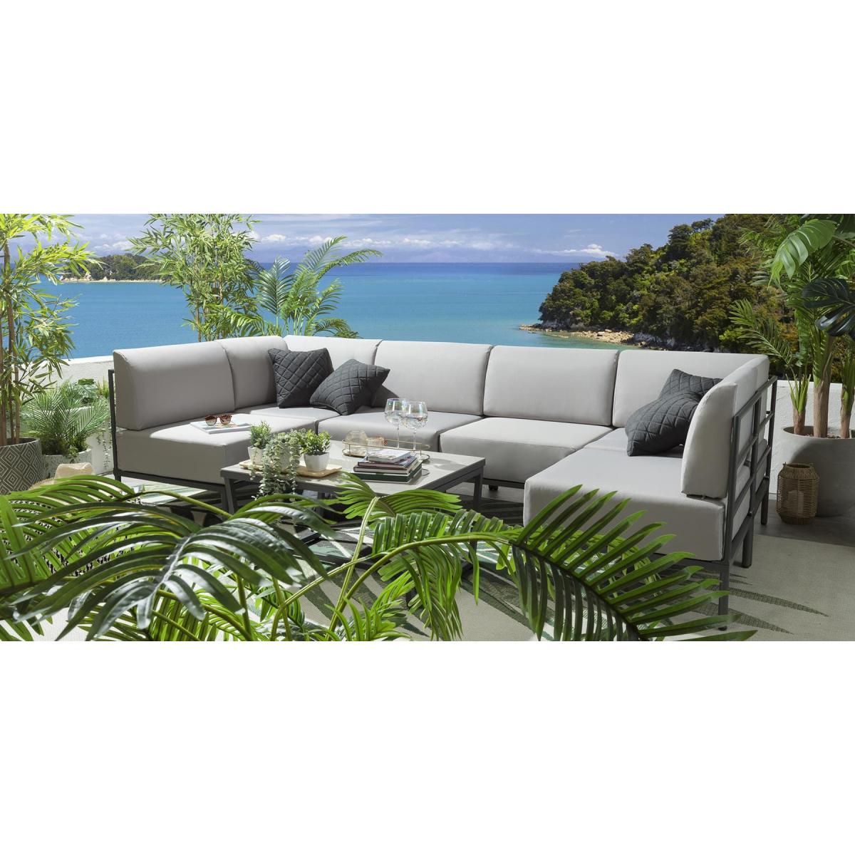 Add a touch of outdoor luxury to garden with the Alfie U Shape Corner Garden Sofa. The sofa cushions are covered in a premium outdoor silver coloured fabric. Crafted with a fully modular design, the possibilities are infinite as you curate a personalised outdoor sofa arrangement to complement your patio. The robust frame, crafted entirely from aluminium and outfitted with premium stainless steel fittings, withstands the most arduous weather conditions, ensuring durability for years to come. The Alfie garden sofa range also features a matching coffee table, embellished with a real ceramic top that is resistant to scratches, adding a touch of glamour to any outdoor oasis. Relax in the garden and indulge in the exquisite Alfie outdoor sofa collection, a masterpiece years in the making. Our dedication to perfection has resulted in an unparalleled garden sofa that exudes opulence and sophistication and at great value. The outdoor sofa collection features comfortable foam cushions that can be removed and stored away when not in use. The sofa set also includes clips to attach the modular pieces together in your desired configuration. W288cm D144cm H73cm Fully modular design: this set includes 2x corner sections, 4x middle sections Coffee Table is NOT included