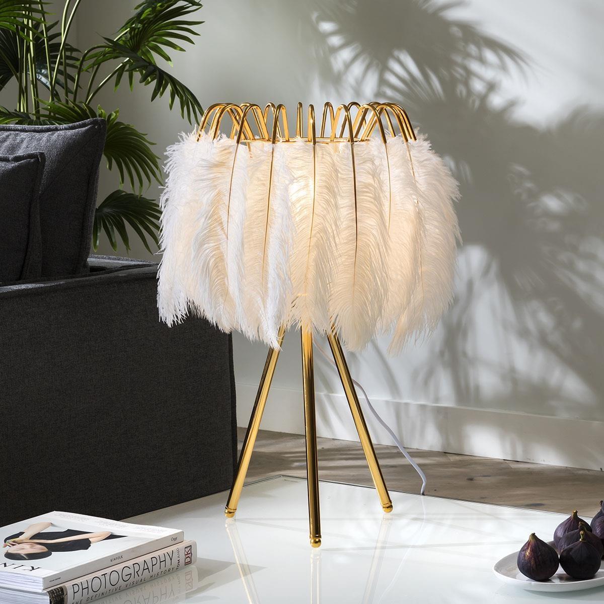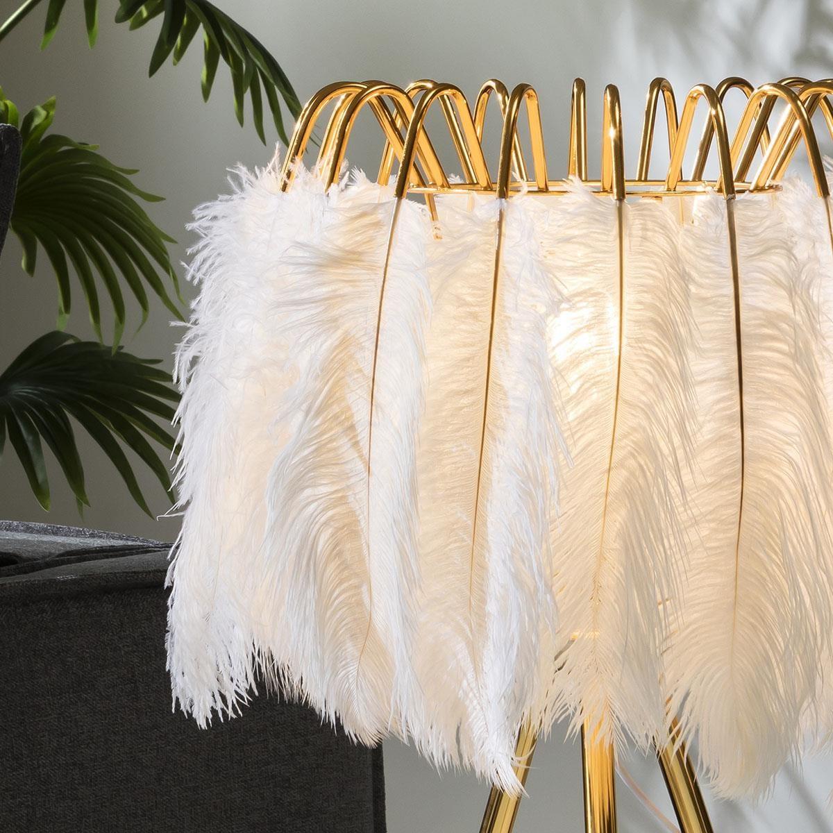 This flamboyant piece is luxury mixed with flair and an explosion of eccentricity, this fully feathered table lamp is iconic. Standing on a beautiful metallic tripod frame, a ring of soft & delicate feathers held in place by a golden wire frame and a series of metal gold arms which offer a soft glow and glint seductively when alight. As the best kept secret in the furniture business we have been quietly supplying thousands of loyal customers with our unique contemporary furniture since 2004. Requires 4 E27 Bulbs Height: 60cm Also available as a ceiling light & floor lamp
