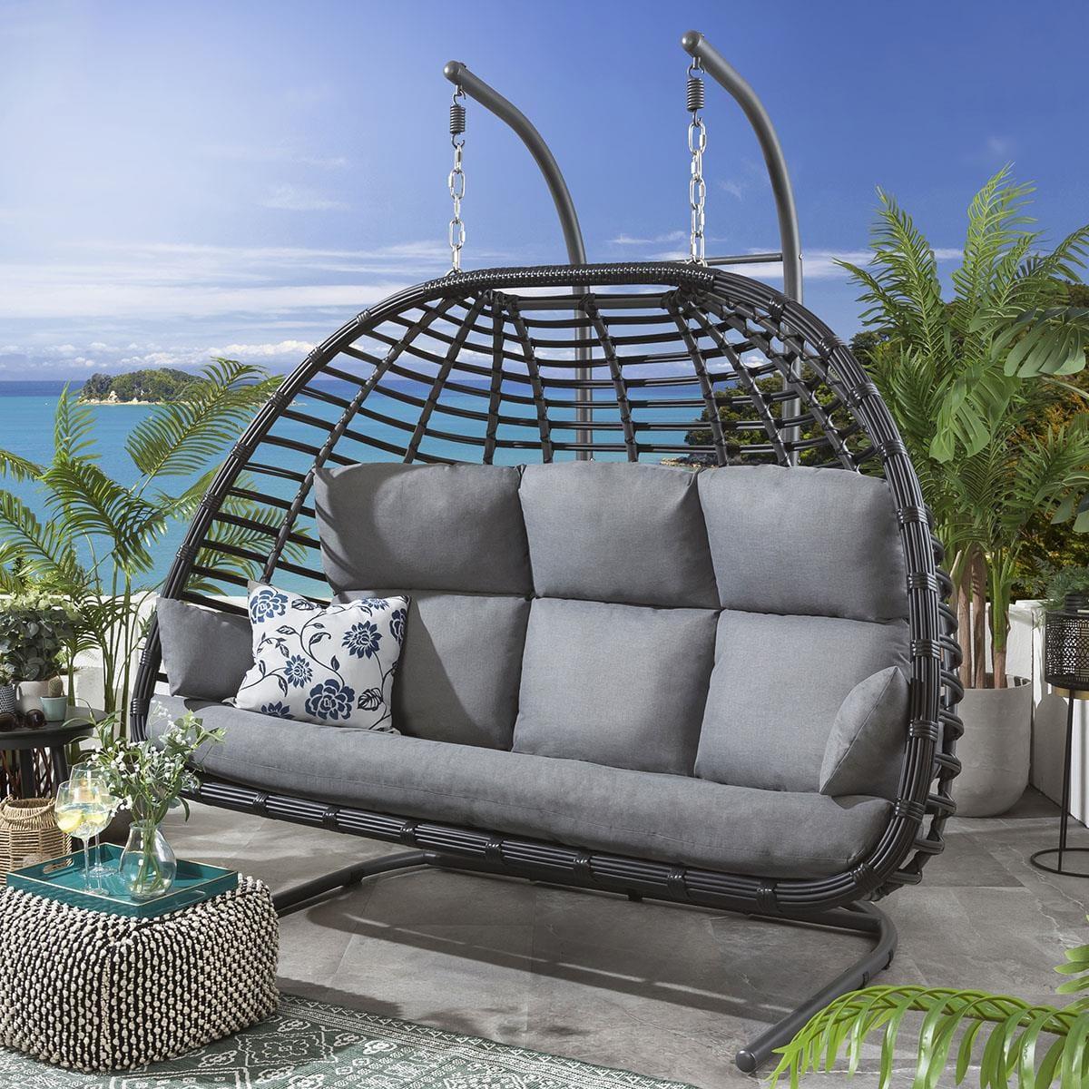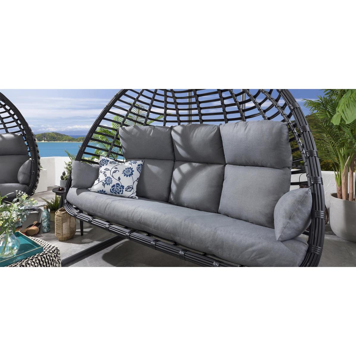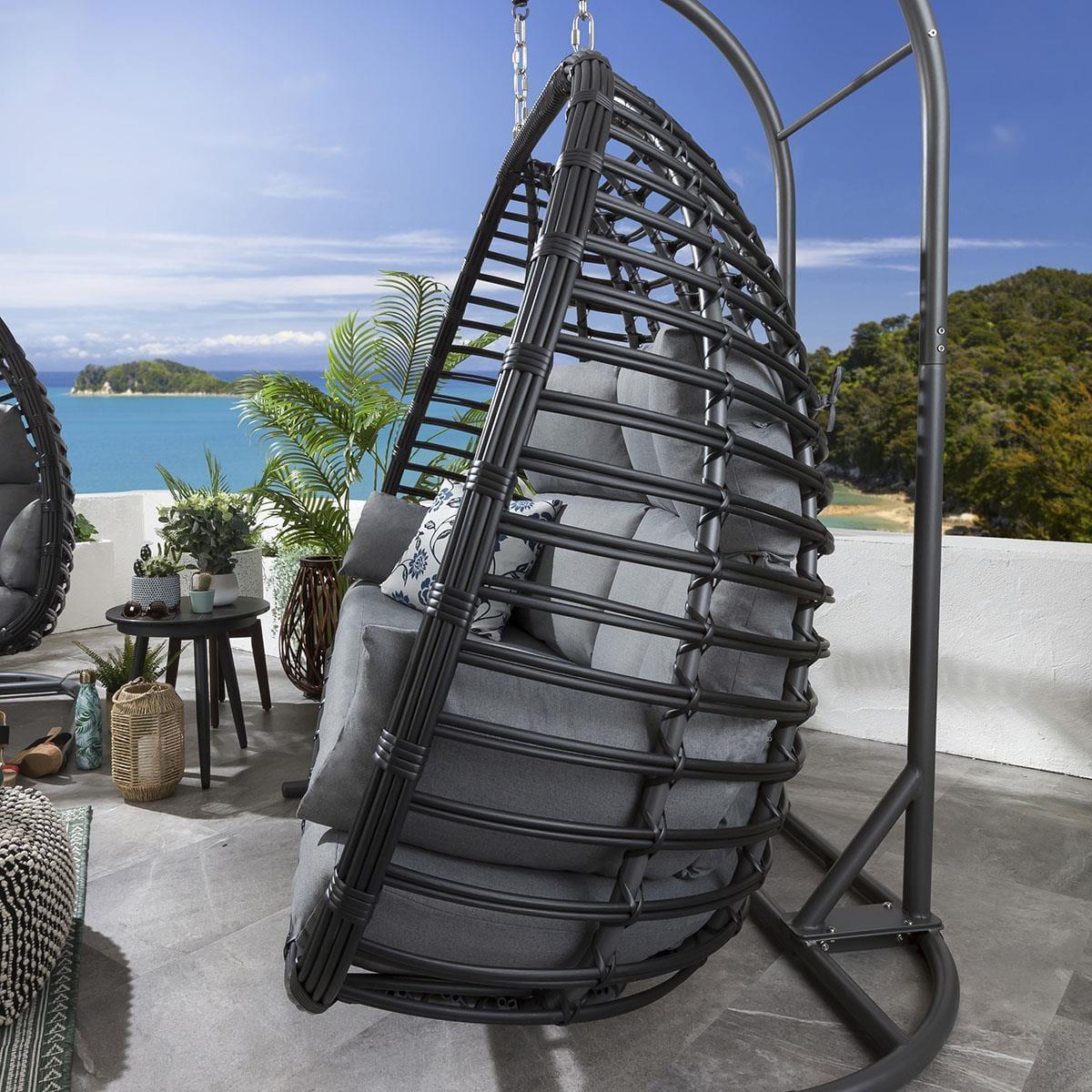 The Quatropi Bamboo style hanging chairs and sofas make a stunning sculptural statement in any garden. The beautiful teardrop shapes married with the strong horizontal bars provide a breathtaking image from any angle. All 2 and 3 seater sofas are available in either our coffee or our charcoal colourways whist our single hanging chairs coming in our coffee, green, blue and grey colourways. Our hanging daybed sleeper sofas are totally unique in the market. The stunning teardrop shape not only looks amazing but provides a wider, flatter cocoon type seat which lends inself perfectly to lying flat with over 6ft 6 inches of internal width or sharing the space with a loved ones. The cushions have been developed with super-thick foam base cushions, split lumber / headrest soft fibre-filled back cushions and moveable armrest / scatter cushions. All cushion covers can be removed and are machine washable. The basket of the hanging chair is fully built for maximum stability, the frame comes boxed and does require minimal assembly and you may need a hand with hanging the basket on the frame. Our adjustable chain allows for different sitting heights, and the plastic support feet are moveable to help balance for uneven surfaces. For 10 years Quatropi have been the leading supplier of luxury hanging chairs in the UK. Our focus always has and always will be on quality first yet comfort, style and cost must also meet our stringent standards. With all our hanging chairs, everything you need comes as standard including the super strong frame, luxury cushions and even the winter cover. Our entire range of hanging chairs now have sofa style foam base cushions providing superior comfort and a uniquely stylish look. Remember that none of our designs are available elsewhere and this latest generation of chairs keeps us at the very top of the premium market. W205cm D125cm H207cm Free Winter Cover Max Weight Capacity: 175kgs