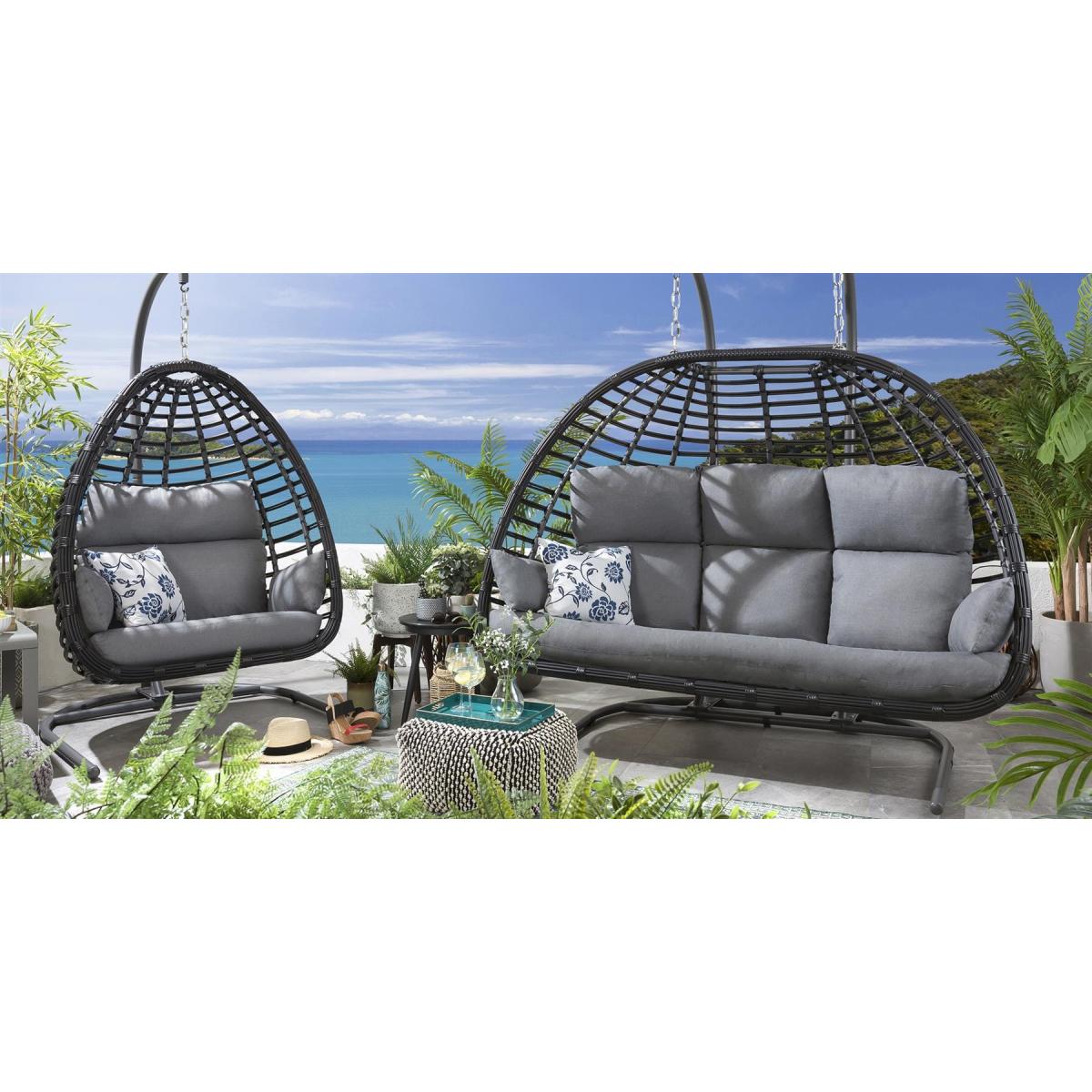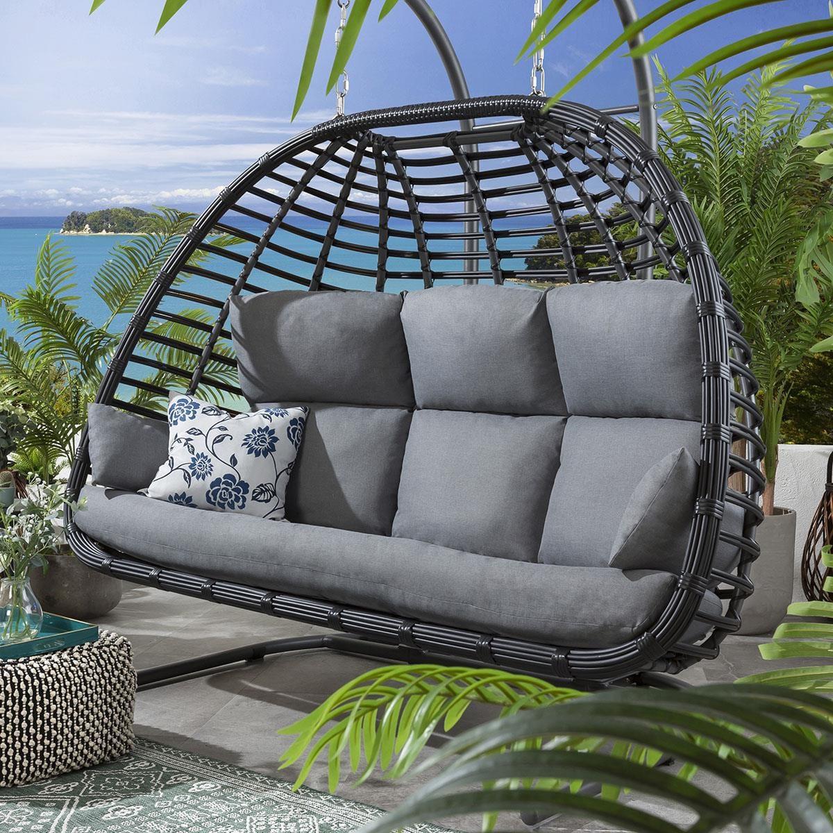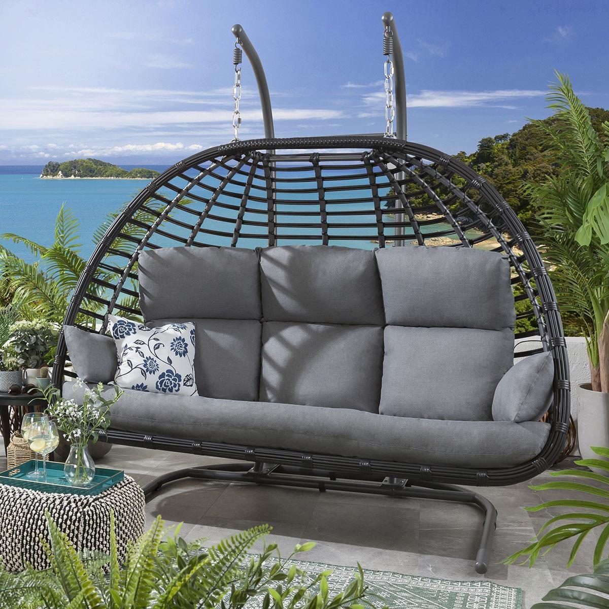 The Quatropi Bamboo style hanging chairs and sofas make a stunning sculptural statement in any garden. The beautiful teardrop shapes married with the strong horizontal bars provide a breathtaking image from any angle. All 2 and 3 seater sofas are available in either our coffee or our charcoal colourways whist our single hanging chairs coming in our coffee, green, blue and grey colourways. Our hanging daybed sleeper sofas are totally unique in the market. The stunning teardrop shape not only looks amazing but provides a wider, flatter cocoon type seat which lends inself perfectly to lying flat with over 6ft 6 inches of internal width or sharing the space with a loved ones. The cushions have been developed with super-thick foam base cushions, split lumber / headrest soft fibre-filled back cushions and moveable armrest / scatter cushions. All cushion covers can be removed and are machine washable. The basket of the hanging chair is fully built for maximum stability, the frame comes boxed and does require minimal assembly and you may need a hand with hanging the basket on the frame. Our adjustable chain allows for different sitting heights, and the plastic support feet are moveable to help balance for uneven surfaces. For 10 years Quatropi have been the leading supplier of luxury hanging chairs in the UK. Our focus always has and always will be on quality first yet comfort, style and cost must also meet our stringent standards. With all our hanging chairs, everything you need comes as standard including the super strong frame, luxury cushions and even the winter cover. Our entire range of hanging chairs now have sofa style foam base cushions providing superior comfort and a uniquely stylish look. Remember that none of our designs are available elsewhere and this latest generation of chairs keeps us at the very top of the premium market. W205cm D125cm H207cm Free Winter Cover Max Weight Capacity: 175kgs