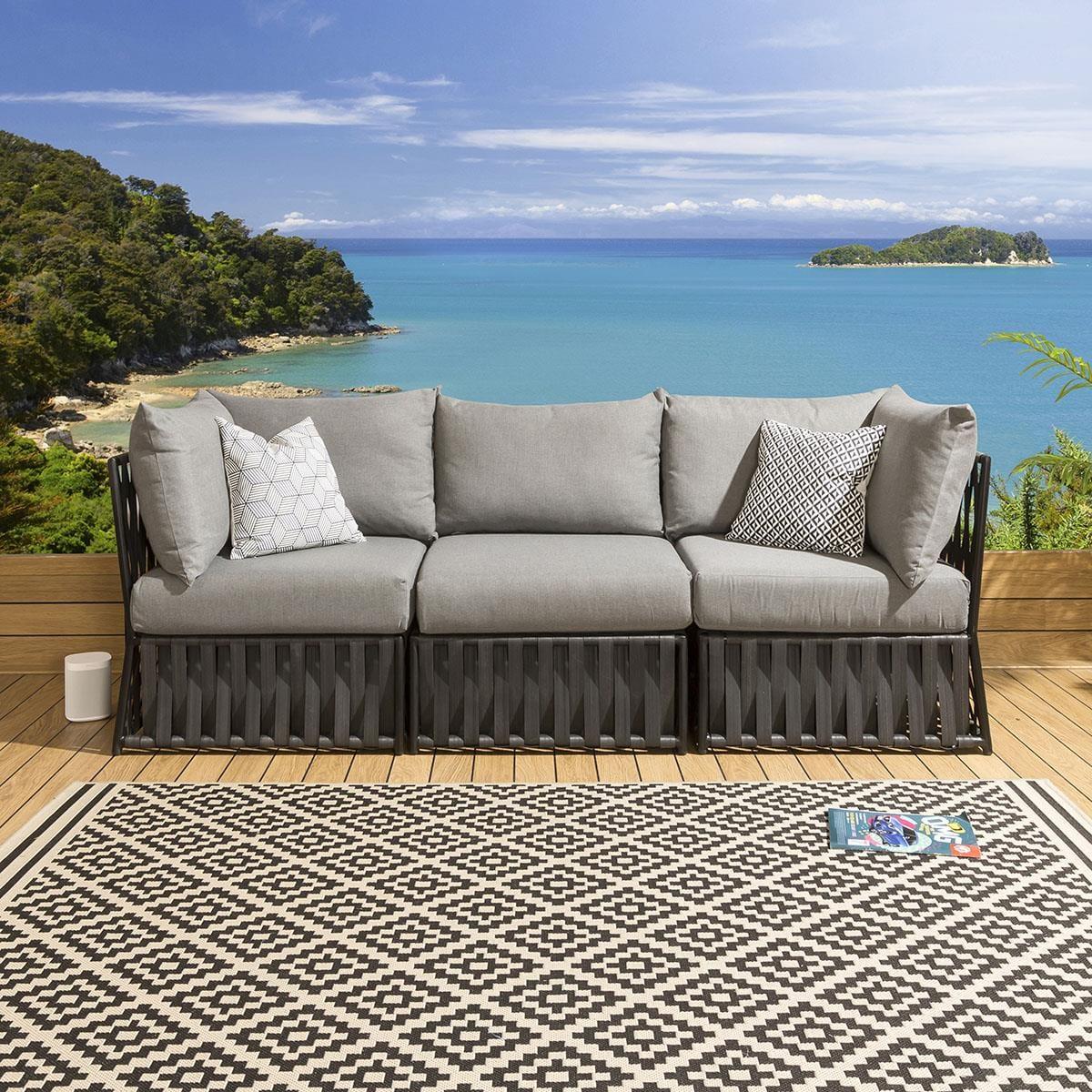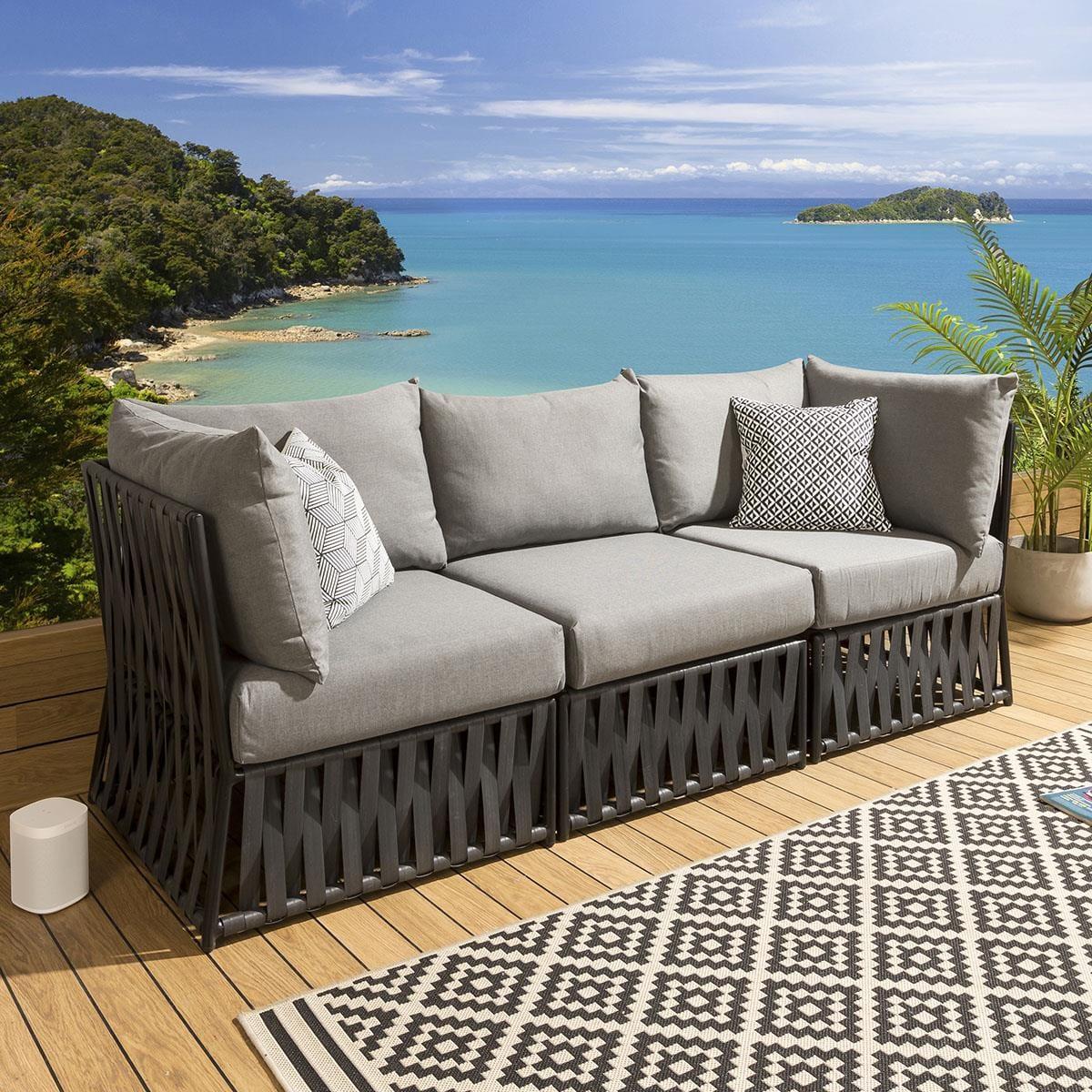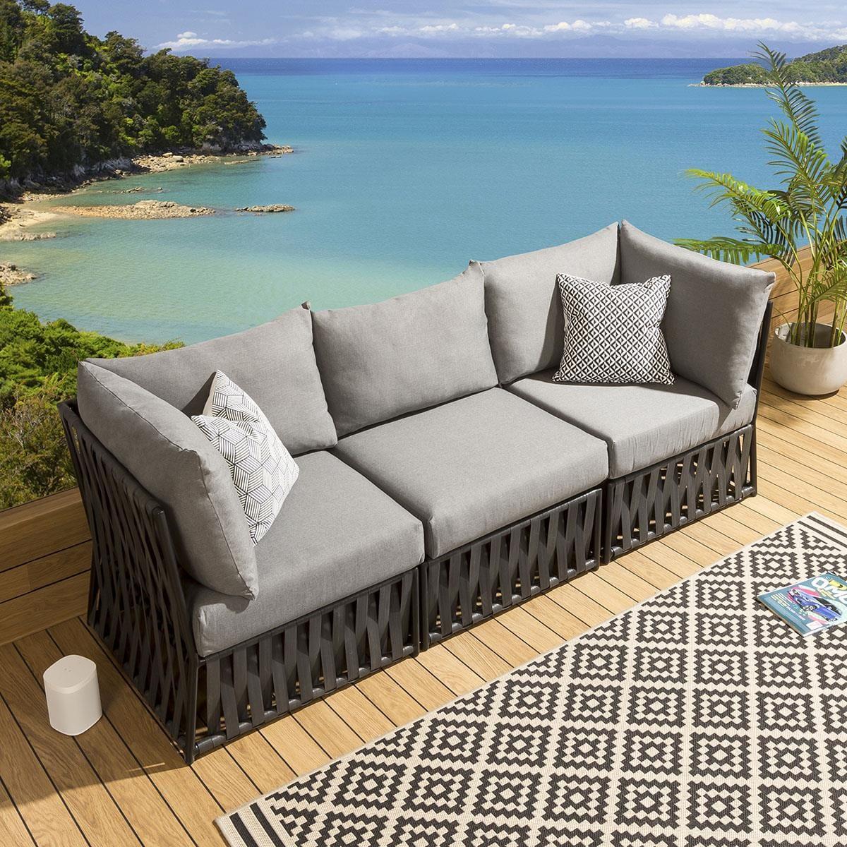 The Theo modular S3 garden sofa set in brushed black rattan with medium grey cushions by Quatropi is the 3 piece set from the Theo modular garden sofa range. The set consists of 1 middle and 2 corner modules to make a classic 3-seater garden sofa. All sections come with their own free winter cover. The set is made from high-grade aluminium which makes it very strong and designed in a way to make it as light and simple as possible. The frame is sturdy and has an intricate rattan weave that blends traditional with contemporary. It offers an unexpected alliance between the design minimalism of its metallic structure and the artisanal warmth of its hand-woven rattan. The weather resistant cushioning is created with high-density foam for long-lasting support which provides ultimate comfort for those long summer dinner parties. The cushions are upholstered in a gorgeous medium grey outdoor fabric - part of the unique designer range of garden patio furniture exclusive to Quatropi. Ongoing maintenance of the sofa is easy, the frame and cushions can easily be cleaned with warm soapy water. The cushions are also detachable for when they are not in use. Relax in style with this expertly crafted rattan garden furniture and entertain guests in your garden for hours on end. Sit back and relax on Quatropi premium outdoor furniture, sipping summery cocktails and watch the world go by. Are you looking to spruce up your garden? Light but hard-wearing, poly-rattan is a great way to add some practical style. Whether it's perking up a patio or decking, rattan garden furniture will add some serious quality to your outdoor seating area. Our rattan dining sets are perfect for both gardens and patios, with a range of styles and sizes, no matter how big or small your outdoor space is, we've got a set to match. PU rattan has been developed to look like the genuine item without the weatherproofing issues. It's a great low/no-maintenance option for those who'd like to buy a set and forget about it for the summer season. It's waterproof, UV-resistant and should last considerably longer than its natural counterpart, but it'd still appreciate being covered with a waterproof sheet during colder periods to avoid damaging the material. The Theo range is a modular furniture set. They are unique so that you can expand on your current furniture set to create different arrangements to suit every situation. Whether it be making your furniture set larger, smaller or even if you want to split the sets into smaller chunks and have multiple lounging areas to use, then Quatropi modular garden furniture sets are for you. Explore the entire rattan garden furniture range by Quatropi. Our sets come in a range of colours, select from black, grey or brown rattan garden furniture, where you'll find our premium weave. With lots of styles to choose from, including dining sets, with stunning garden tables and chairs, as well as, modular corner sofas, bistro sets and patio chairs and table sets, with such a huge collection of garden furniture sets available you'll find a set suited to your style. Spread the cost our with interest-free finance options. Minimum spend applies. W220cm D75cm H75cm Fully Modular Sofa Set Rattan Detailing