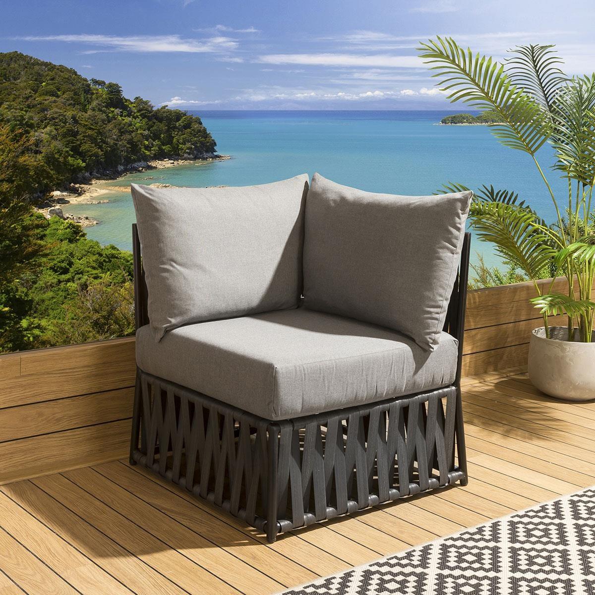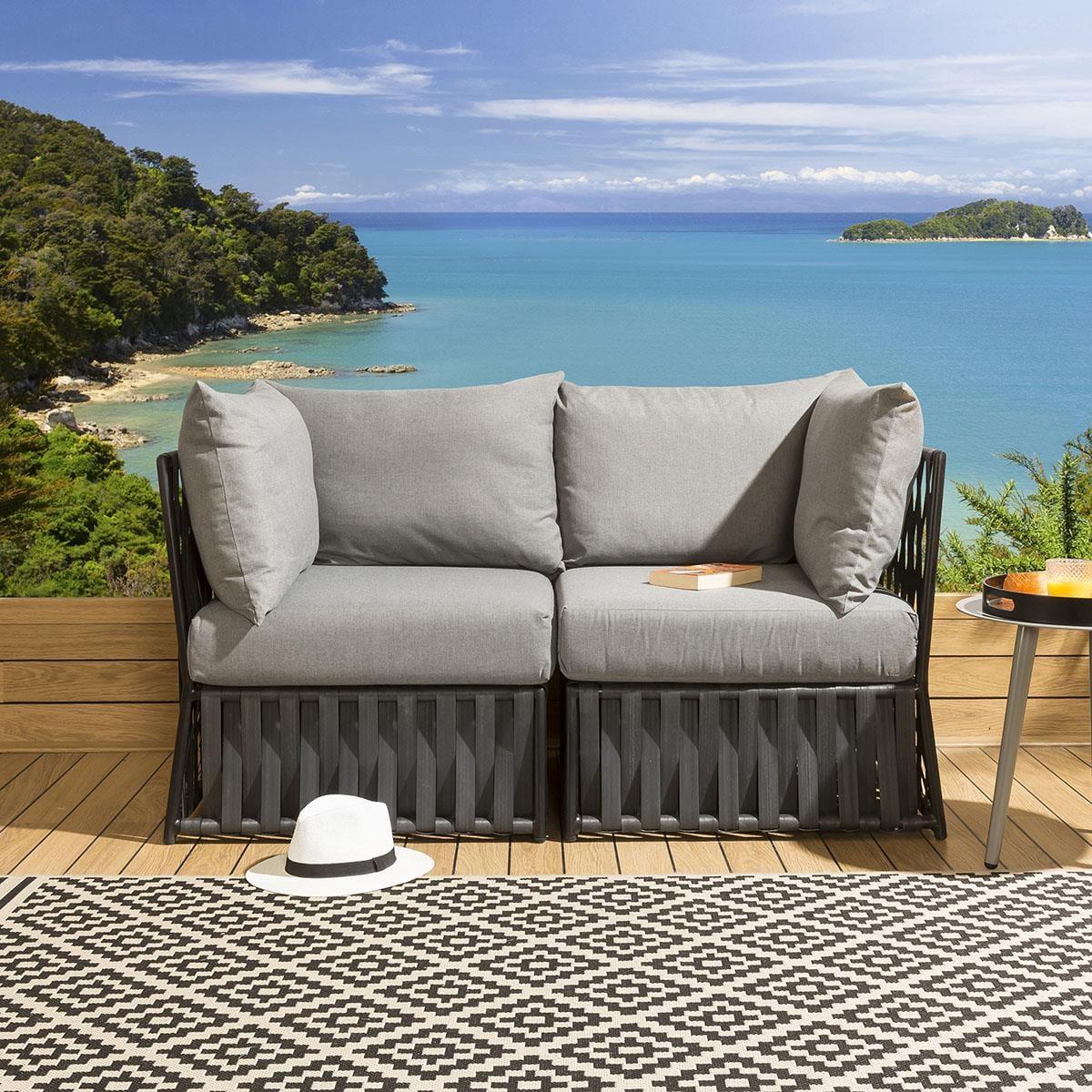 The Theo modular S2 garden sofa set in brushed black rattan with medium grey cushions by Quatropi is the 3 piece set from the Theo modular garden sofa range. The set consists of 2 corner modules, plus a footstool, creating a lovely 2-seater garden sofa. All sections come with their own free winter cover. The set is made from high-grade aluminium which makes it very strong and designed in a way to make it as light and simple as possible. The frame is sturdy and has an intricate rattan weave that blends traditional with contemporary. It offers an unexpected alliance between the design minimalism of its metallic structure and the artisanal warmth of its hand-woven rattan. The weather resistant cushioning is created with high-density foam for long-lasting support which provides ultimate comfort for those long summer dinner parties. The cushions are upholstered in a gorgeous medium grey outdoor fabric - part of the unique designer range of garden patio furniture exclusive to Quatropi. Ongoing maintenance of the sofa is easy, the frame and cushions can easily be cleaned with warm soapy water. The cushions are also detachable for when they are not in use. Relax in style with this expertly crafted rattan garden furniture and entertain guests in your garden for hours on end. Sit back and relax on Quatropi premium outdoor furniture, sipping summery cocktails and watch the world go by. Are you looking to spruce up your garden? Light but hard-wearing, poly-rattan is a great way to add some practical style. Whether it's perking up a patio or decking, rattan garden furniture will add some serious quality to your outdoor seating area. Our rattan dining sets are perfect for both gardens and patios, with a range of styles and sizes, no matter how big or small your outdoor space is, we've got a set to match. PU rattan has been developed to look like the genuine item without the weatherproofing issues. It's a great low/no-maintenance option for those who'd like to buy a set and forget about it for the summer season. It's waterproof, UV-resistant and should last considerably longer than its natural counterpart, but it'd still appreciate being covered with a waterproof sheet during colder periods to avoid damaging the material. The Theo range is a modular furniture set. They are unique so that you can expand on your current furniture set to create different arrangements to suit every situation. Whether it be making your furniture set larger, smaller or even if you want to split the sets into smaller chunks and have multiple lounging areas to use, then Quatropi modular garden furniture sets are for you. Explore the entire rattan garden furniture range by Quatropi. Our sets come in a range of colours, select from black, grey or brown rattan garden furniture, where you'll find our premium weave. With lots of styles to choose from, including dining sets, with stunning garden tables and chairs, as well as, modular corner sofas, bistro sets and patio chairs and table sets, with such a huge collection of garden furniture sets available you'll find a set suited to your style. Spread the cost our with interest-free finance options. Minimum spend applies. W150cm D75cm H75cm Fully Modular Sofa Set Rattan Detailing