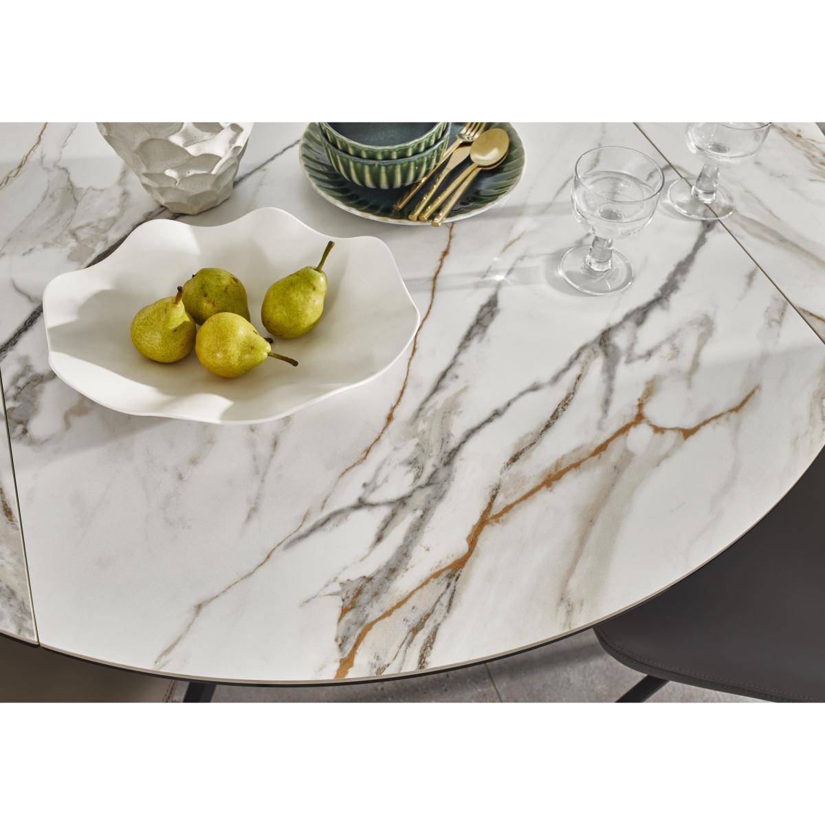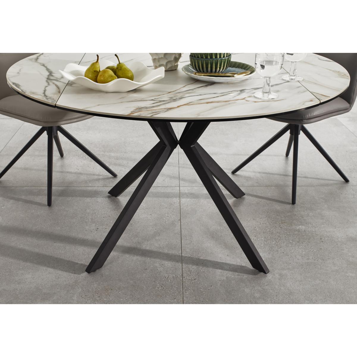 Make life easy with our thoughtfully designed and beautifully crafted Quattro dining range. Created for stylish and sociable dining, whatever the size of your home, this range features a dining table that becomes a larger circular table in seconds thanks to its clever swivel mechanism. The ceramic top is sleek and stylish as well as robust and hardwearing, so it’s perfect for grown-up entertaining and everyday family dining. The collection also includes sets of swivel dining chairs that make the most of a smaller dining space, and a dining set. And with four table top finishes and four dining chair upholstery colours, it’s easy to mix and match to create a look that’s quite unique. All the elegance of marble, all the durability of ceramic. The elegantly patterned ceramic extending dining table in this dining set delivers form as well as function. This dining set includes four chairs. Why you'll love it Space-saving, sociable and very stylish dining set. Effortless swivel mechanism – simply rotate the table top to seat 2 more. In a choice of fabulous colour finishes. The ceramic top is bonded to glass for extra strength. It’s hardwearing, heat-, scratch- and chip-resistant, and easy to clean. Sturdy and very durable base in black powder-coated metal. Dining set includes 4 swivel dining chairs. Well-cushioned with higher backs and automatic swivel return function. Soft faux leather upholstery in a choice of colours. Ideal for both entertaining and family dining. This dining set is part of the Quattro range. What you need to know Chairs are cushioned with foam. Metal frames and legs. Table has a ceramic and glass top. Metal frame and legs. Table seats 4 closed and 6 when extended. Please note that the ceramic table top is not 100% heatproof. We recommend using coasters and placemats at all times. Item code: QUATT4CHASST-001