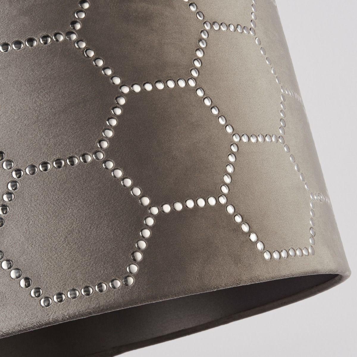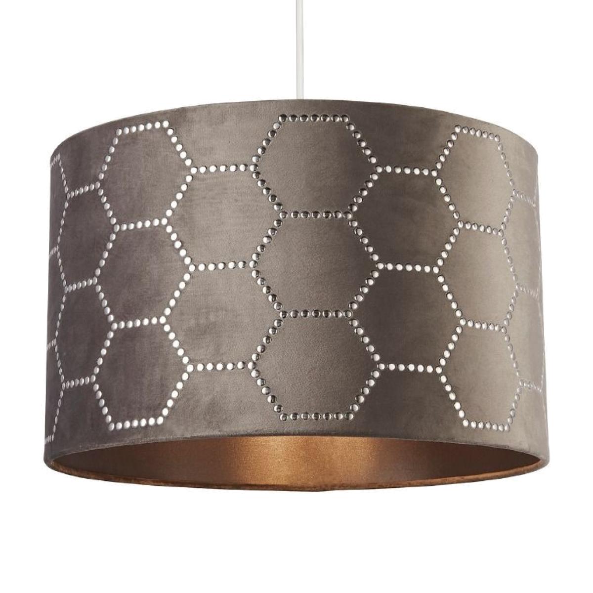Trendy luxe grey velvet shade with stud detailing Complete your space with the trendy Queen Bee luxe velvet grey shade, featuring polished chrome stud hexagon shapes. An 'easy fit' non-electric pendant which can be fitted with ease to an existing bulb holder in living rooms, hallways and bedrooms. Trendy luxe grey velvet shade with stud detailing Complete your space with the trendy Queen Bee luxe velvet grey shade, featuring polished chrome stud hexagon shapes. An 'easy fit' non-electric pendant which can be fitted with ease to an existing bulb holder in living rooms, hallways and bedrooms.
