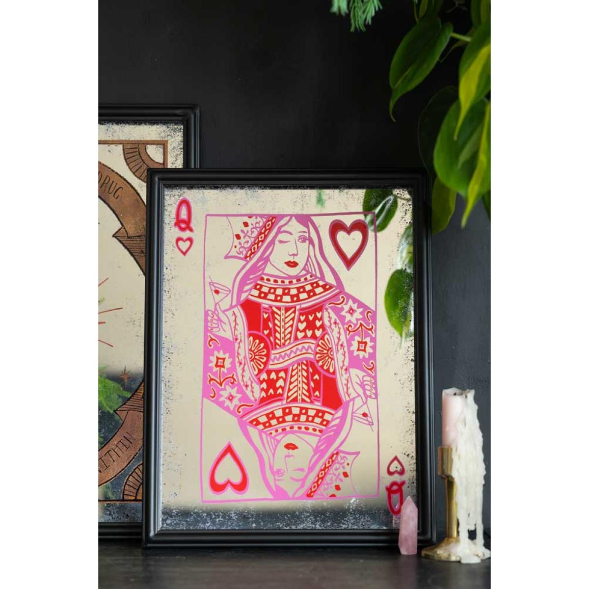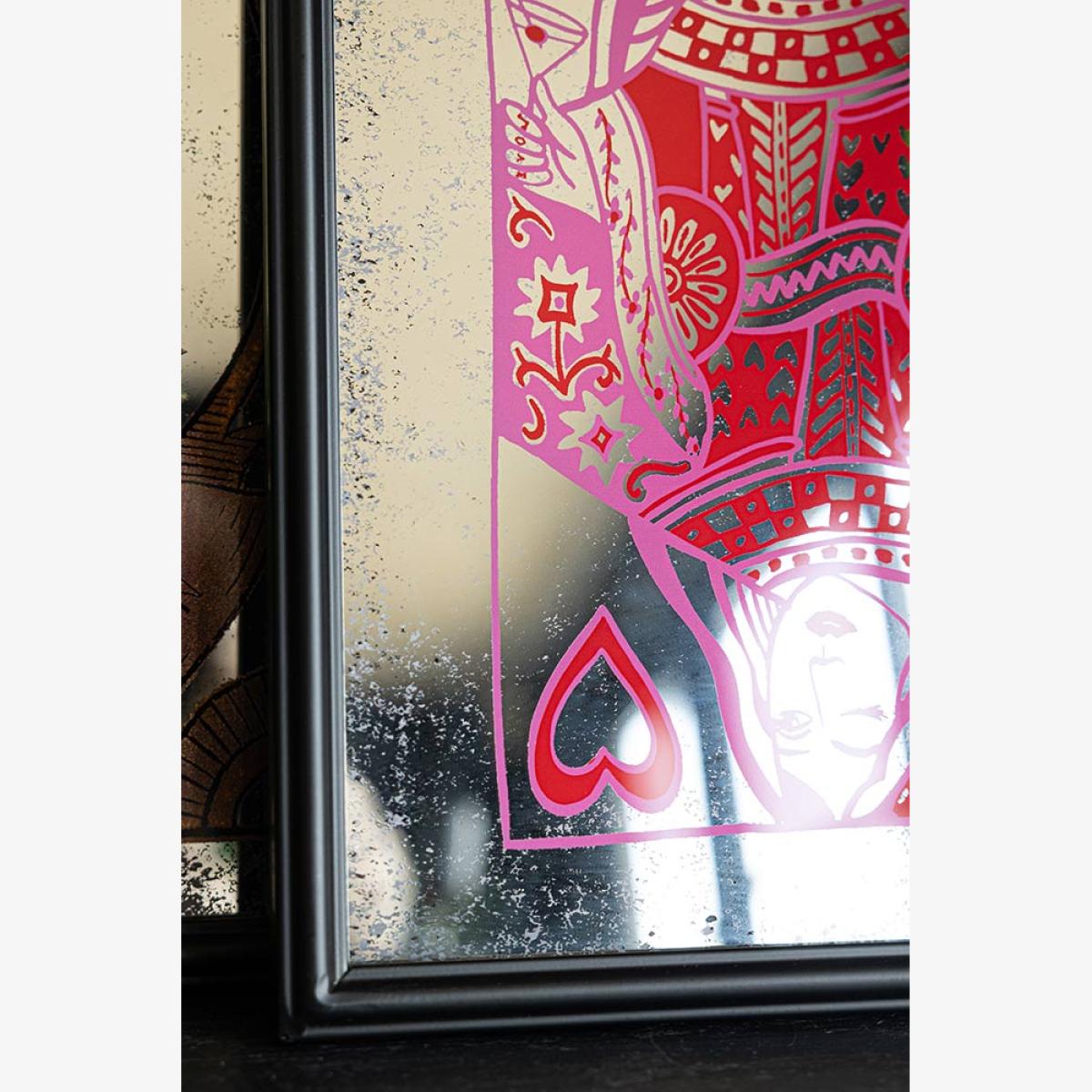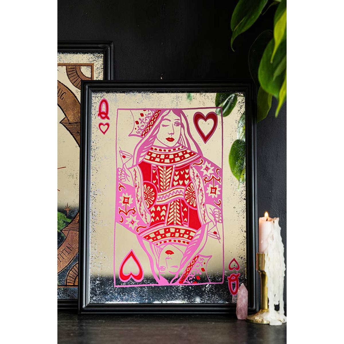<!--td --> It’s the Queen of Hearts, but not as we know it – featuring a cheeky wink that embodies the spirit of RSG sass perfectly, this lovely lady adds a pop of personality and colour to your home wherever you choose to style her! Whether in the hallway, kitchen (we all need to be reminded of our fabulousness while loading the dishwasher, after all) or bedroom, the red and pink detailing sings loud and proud from the foxed silver background, making this a fabulous clash of colours that brightens up your living space, whatever interior design theme you favour. Be super bold and add this as a regal touch to the downstairs loo, if that’s what tickles your fancy – this Queen can take it. Beautiful, fun, and oh-so very you. - Queen Of Hearts Decorative Playing Card Mirror - Material: Glass and metal - Measures: H40cm x W30cm x D2cm