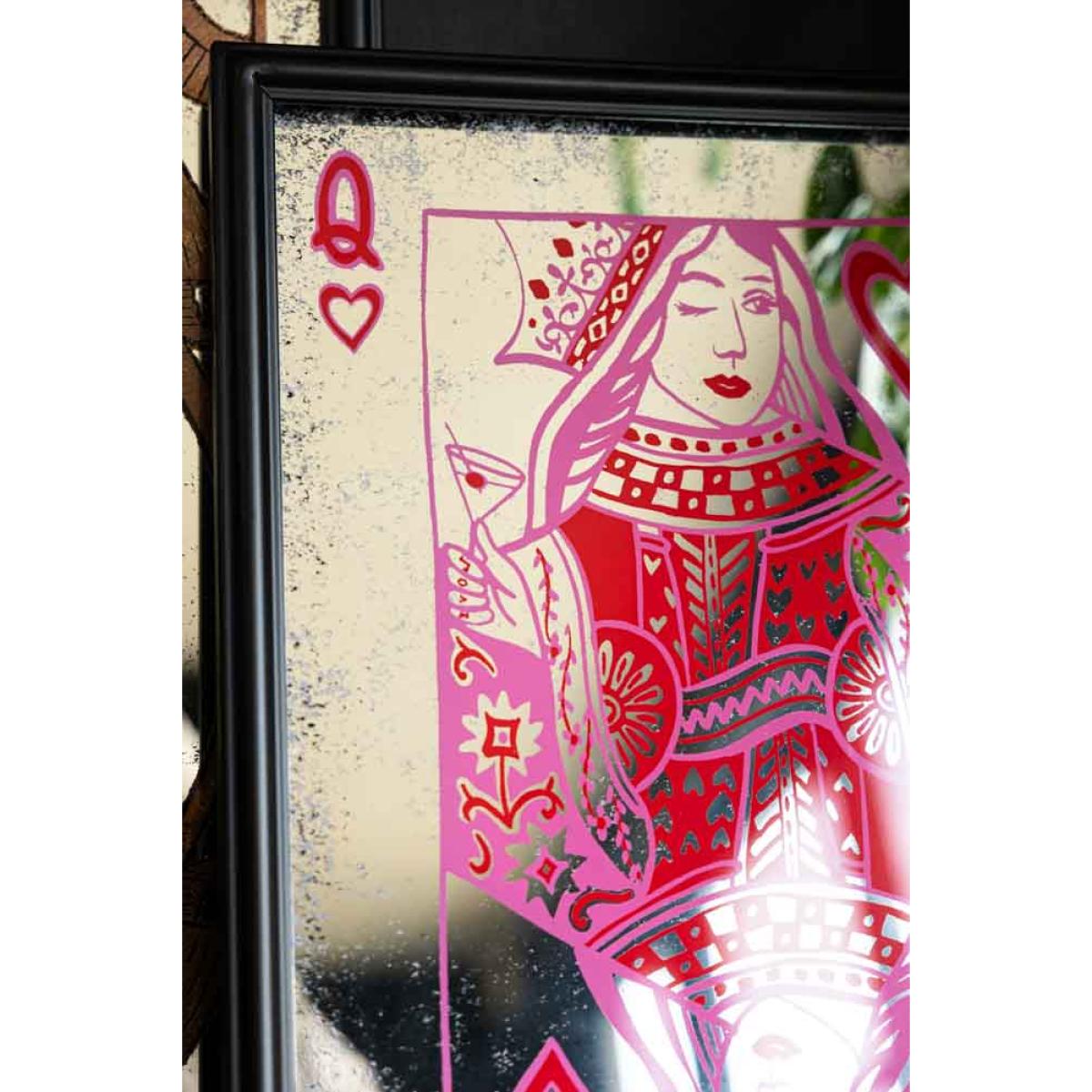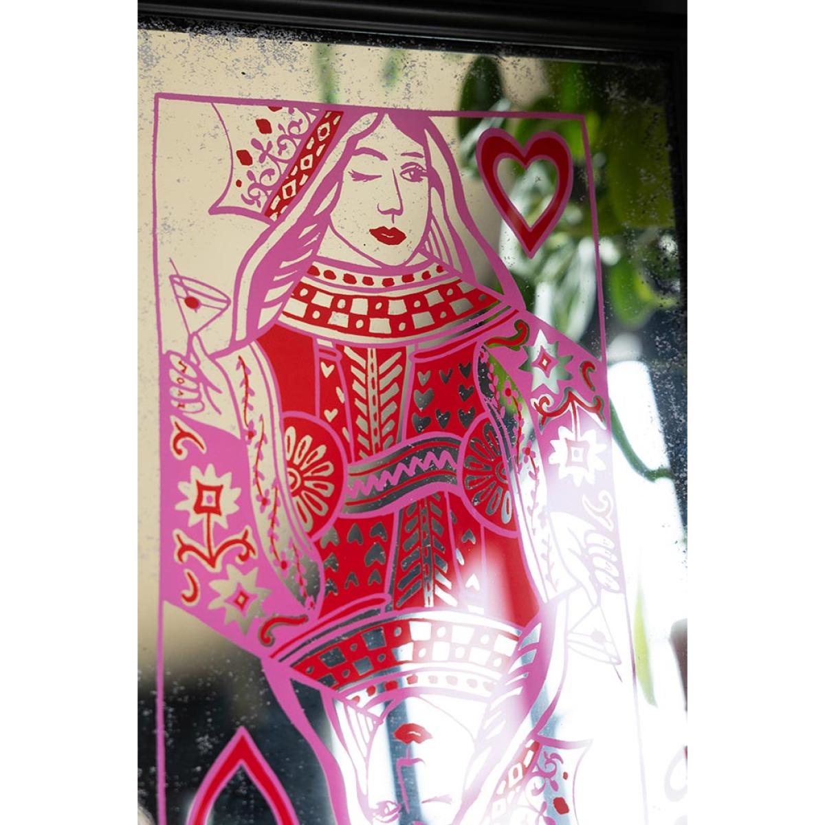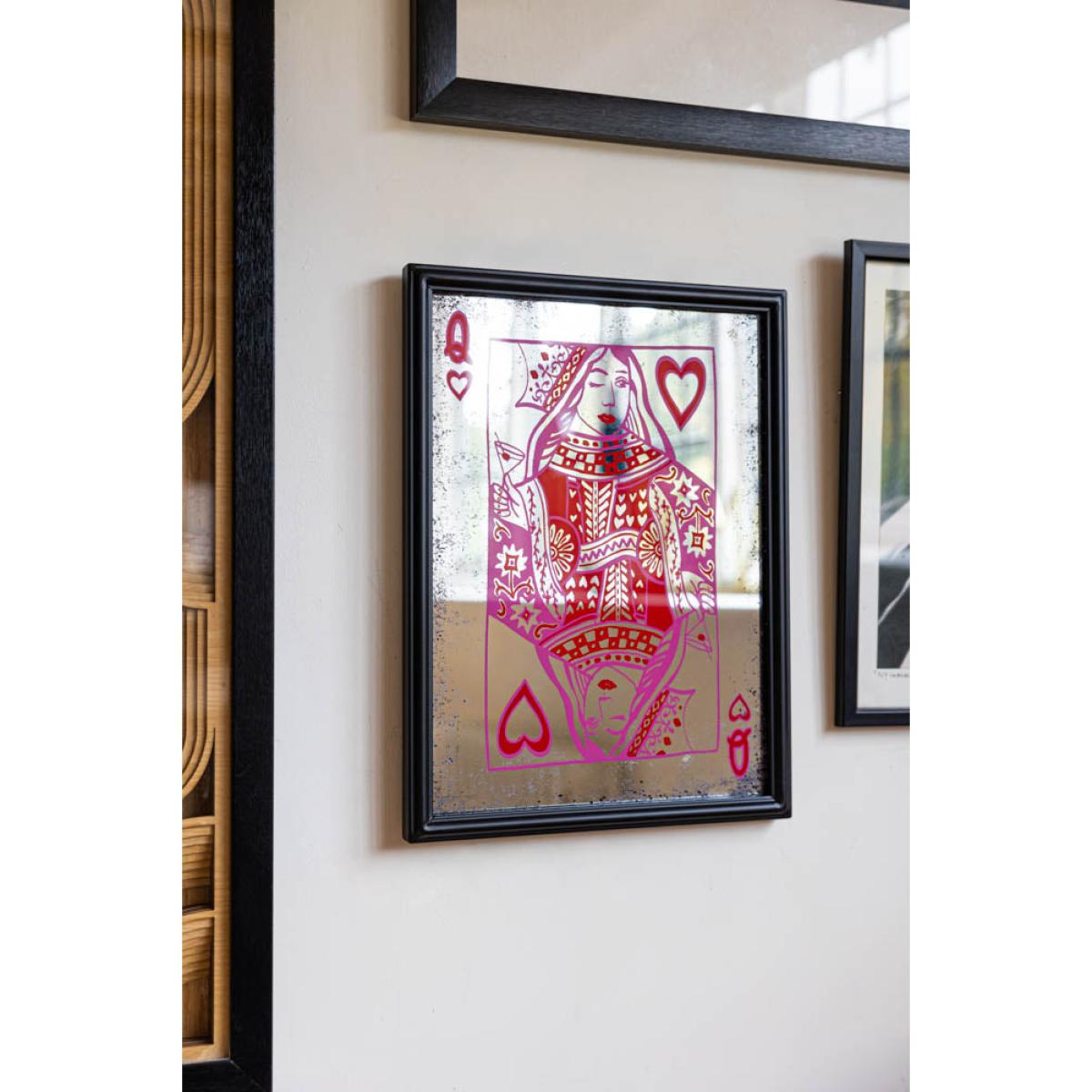 <!--td --> It’s the Queen of Hearts, but not as we know it – featuring a cheeky wink that embodies the spirit of RSG sass perfectly, this lovely lady adds a pop of personality and colour to your home wherever you choose to style her! Whether in the hallway, kitchen (we all need to be reminded of our fabulousness while loading the dishwasher, after all) or bedroom, the red and pink detailing sings loud and proud from the foxed silver background, making this a fabulous clash of colours that brightens up your living space, whatever interior design theme you favour. Be super bold and add this as a regal touch to the downstairs loo, if that’s what tickles your fancy – this Queen can take it. Beautiful, fun, and oh-so very you. - Queen Of Hearts Decorative Playing Card Mirror - Material: Glass and metal - Measures: H40cm x W30cm x D2cm