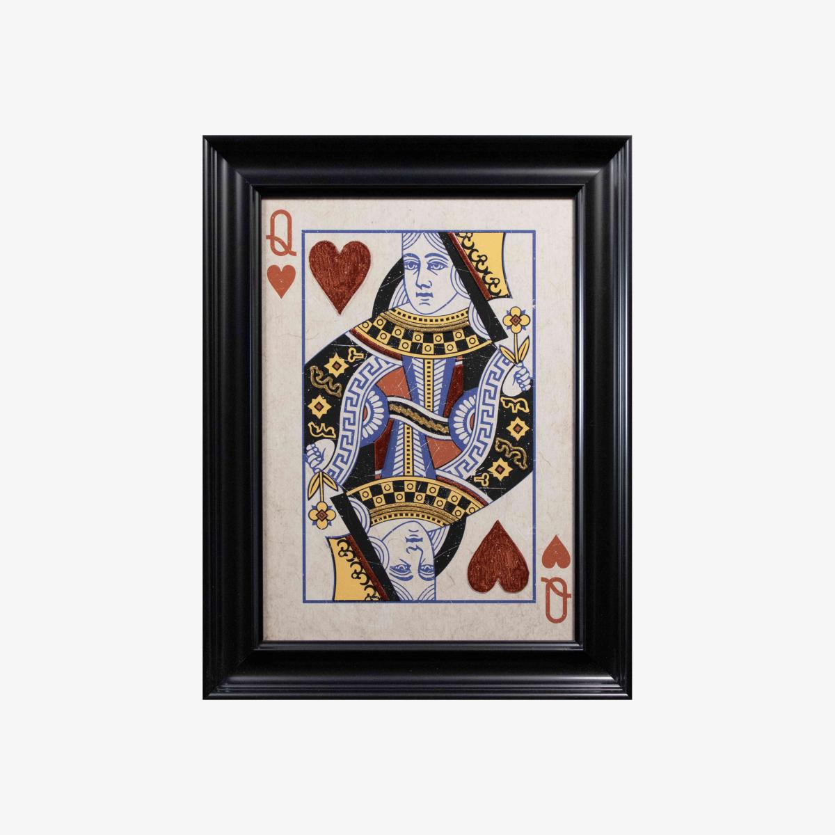 Give you home a regal touch with our Queen of Hearts framed picture. This oversized vintage-style playing card is hand-embellished which means that every one is unique. Why you'll love it Our Queen of Hearts cuts an iconic figure in this charming piece of framed picture. Hand-embellishment makes this a unique piece of art. Striking black frame. Display with our King of Hearts framed picture. Handmade in the UK. This framed picture is part of the Furniture Village home accessories collection. What you need to know Hanging instructions supplied. Indoor use only. Dimensions Height: 85 cm (33 in). Width: 65 cm (26 in). Depth: 5 cm (2 in).