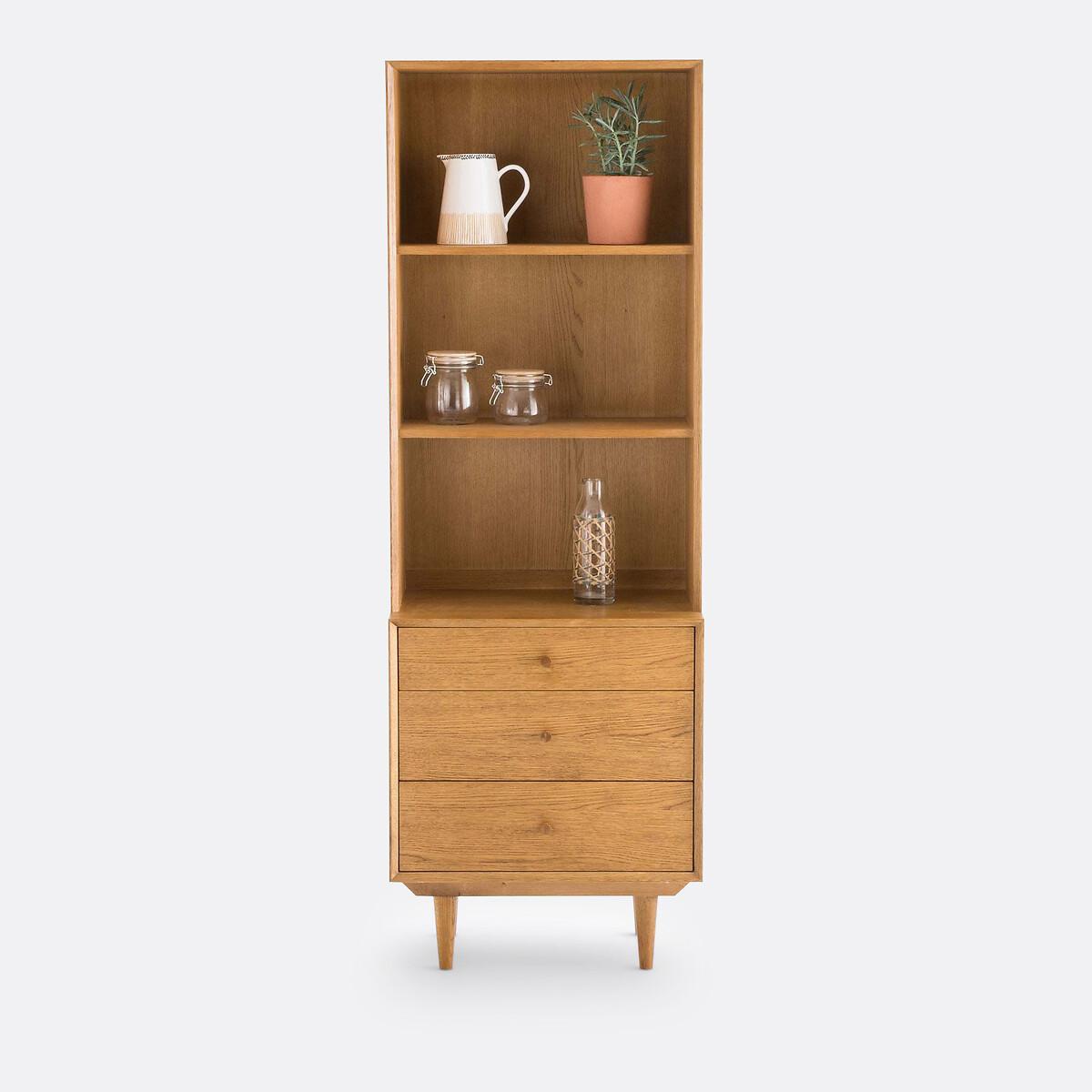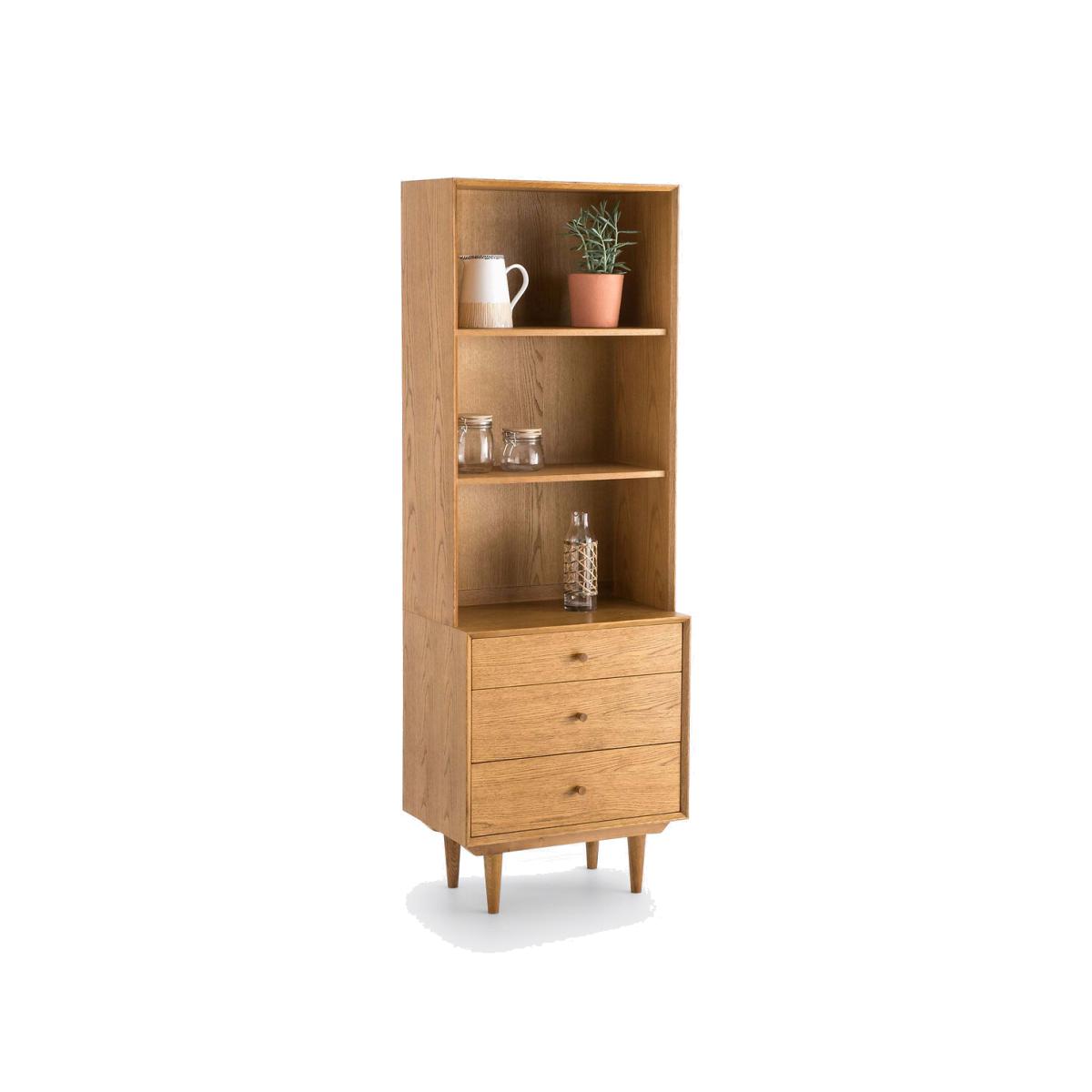 I love the Quilda vintage bookcase for its timeless appeal and practical storage options. It works particularly well in both eclectic and Scandi-inspired interiors, where its light wood tone complements neutral palettes and adds warmth. Its three open shelves are perfect for showcasing plants, decorative accessories, or books, while the drawers offer discreet storage for essentials. For styling tips, consider layering open shelving with varying heights and textures to create visual interest, and use the drawers to keep clutter out of sight. This piece can serve as a focal point in a living room or a stylish storage solution in a bedroom or home office, adding character without overwhelming the space.