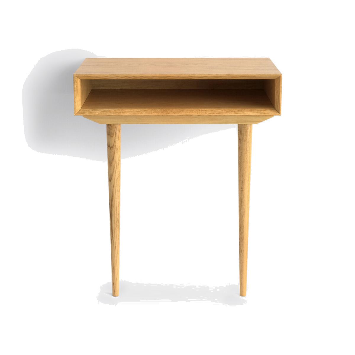 The Quilda desk wall unit. Compact in appearance and particularly successful design, the Quilda desk or console is inspired by the 60s for a nice touch of elegance in the bedroom,the entrance or the living room as an extra piece of furniture or a dressing table by adding a pretty mirror. Product Details • Solid oak legs, MDF box structure with oak veneer and nitrocellulose lacquer finish • Fixes to the wallDimensions. Total • Length: 65cm • Height: 76cm • Depth: 38cmDelivery:. This product is sold for self-assembly. Parcel dimensions and weight:1 parcel • 74 x 47 x 24.5cm • 13kg