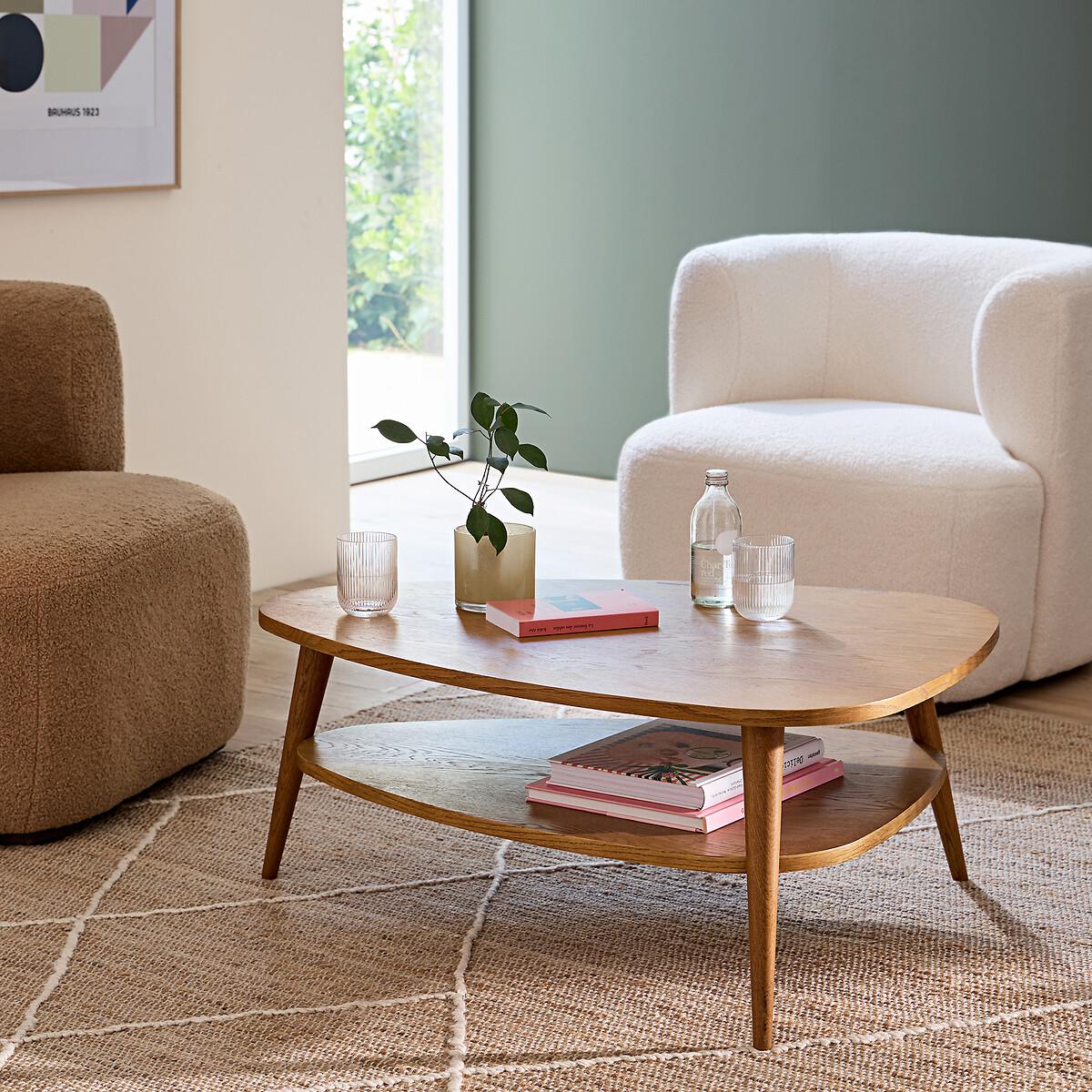 Quilda two-tier vintage coffee table. Vintage style furniture is back... check out this coffee table. Product Details • Two tier • Tapered legs • Medium oak-veneered MDF top • Nitrocellulose varnish finish • Solid oak legsDimensions. Total: • Length: 90cm • Height: 37cm • Depth: 67.50cm. Delivery: • Sold with feet to be attached. Available for home delivery. Note! Please check that all access points are large enough to accommodate your delivery (doors, stairs, lifts). • WOOD FROM SUSTAINABLY MANAGED FORESTS. FSC® certified wood comes from forests that are environmentally, socially and economically well managed. Parcel dimensions and weight:1 parcel • L102 x H9.5 x D80cm • 15kg