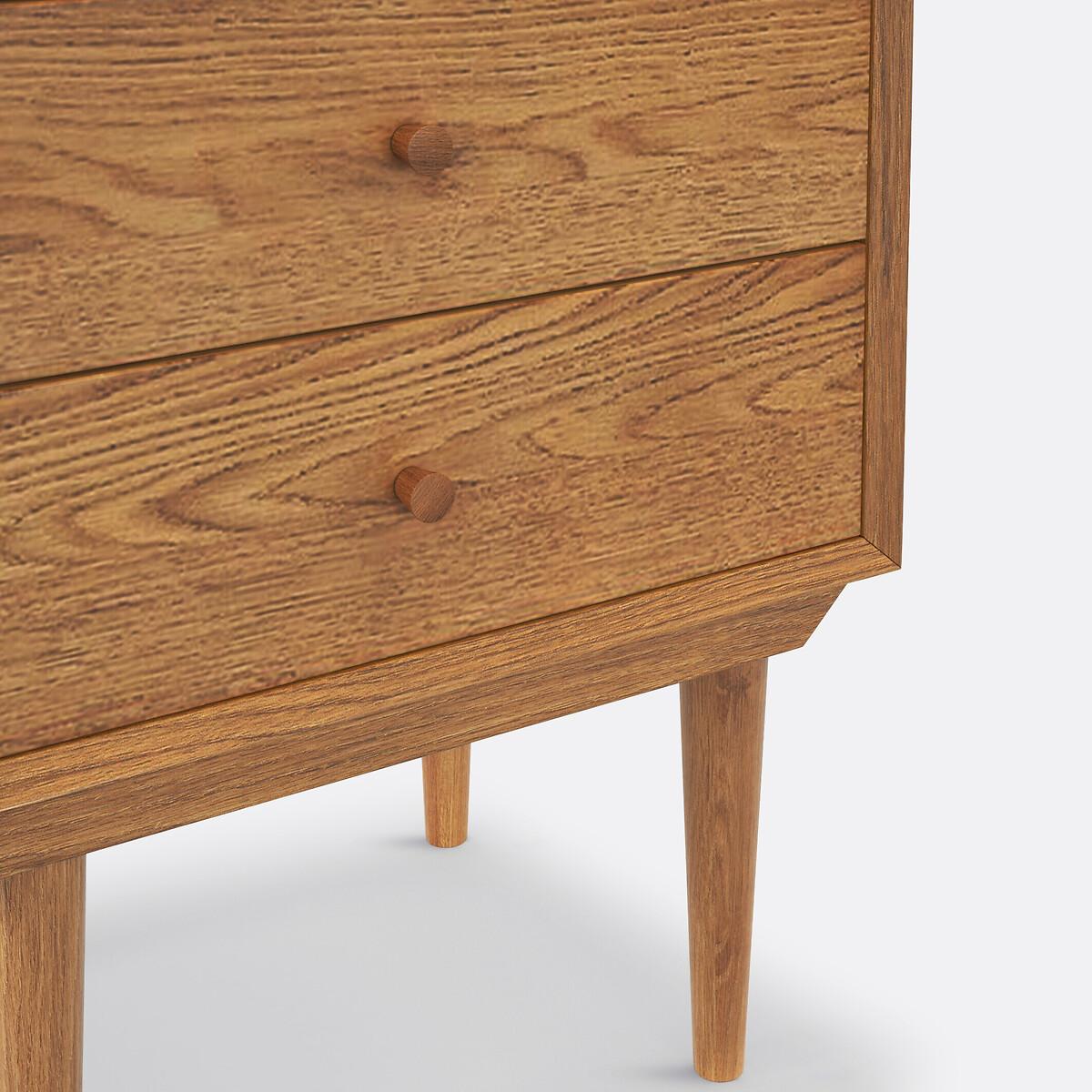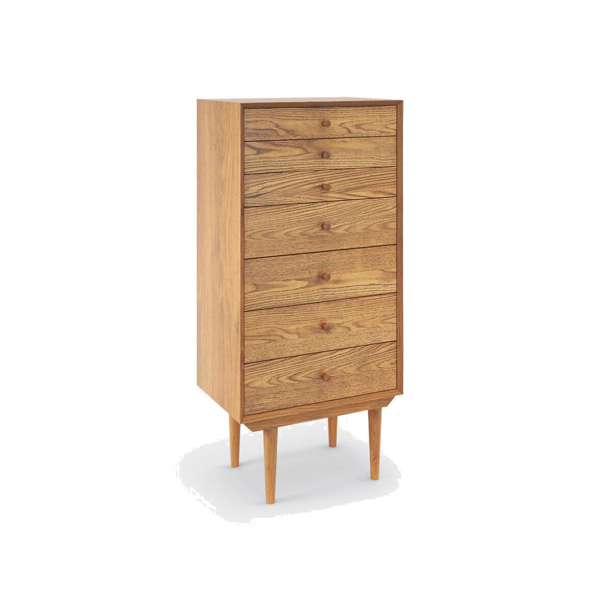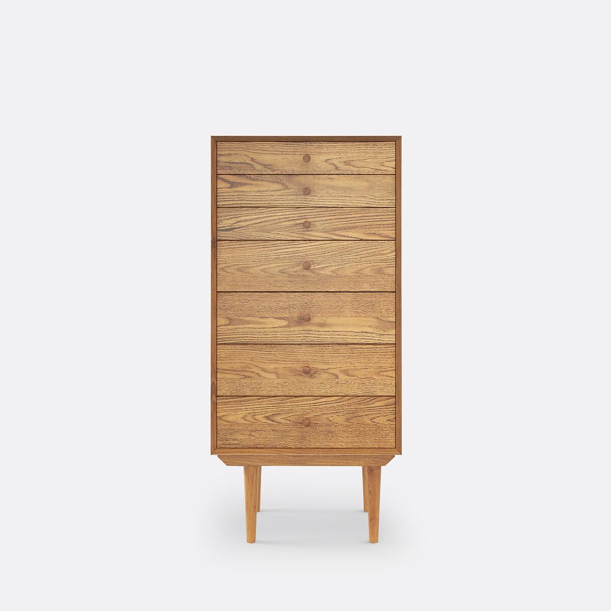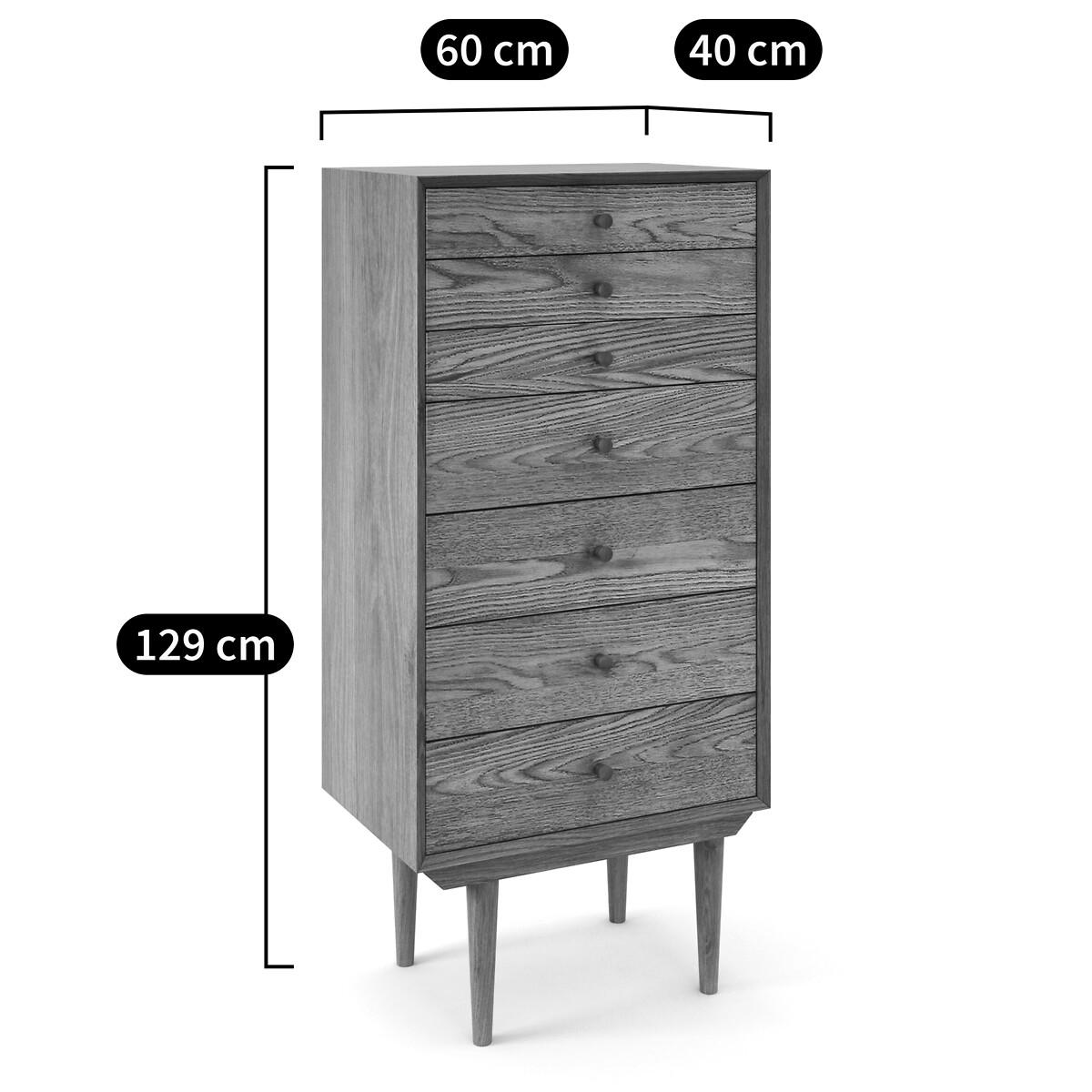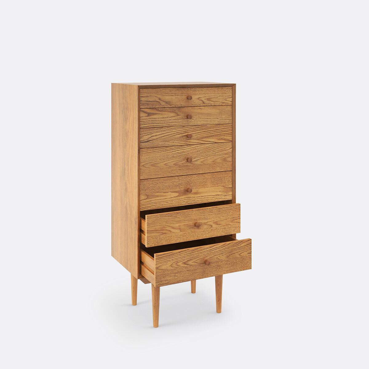 Quilda vintage 7-drawer chest. Typical of furniture of the 1950s, this chest of drawers has a beautiful vintage spirit with a nice mix of oak and a design of tapered legs. Perfectly proportioned, attractive and understated design with 7 storage drawers. Product Details • Composed of 7 drawers of various sizes and heights • Vintage-style legs • Medium oak veneer • Oak cabinet, doors, drawers and oak veneered MDF • Solid oak legs • Discover the full Quilda collection online. Dimensions • Width: 60cm • Height: 129cm • Depth: 40cm. Usable drawer dimensions • Small drawer: L56 x H8 x D35cm • Large drawer: L56 x H14 x D35cm Home Delivery. Sold with the legs to be attached. It will be delivered to your door!Note! Please check that all access points are large enough to accommodate your delivery (doors, stairs, lifts). • WOOD FROM MORE SUSTAINABLY MANAGED FORESTS AND CONTROLLED SOURCES. FSC® Mix wood contains at least 70% FSC® certified and/or recycled wood, the remainder being FSC® controlled wood. Dimensions and weight of parcel • L65.5 x H128 x D50.5cm • 29kg