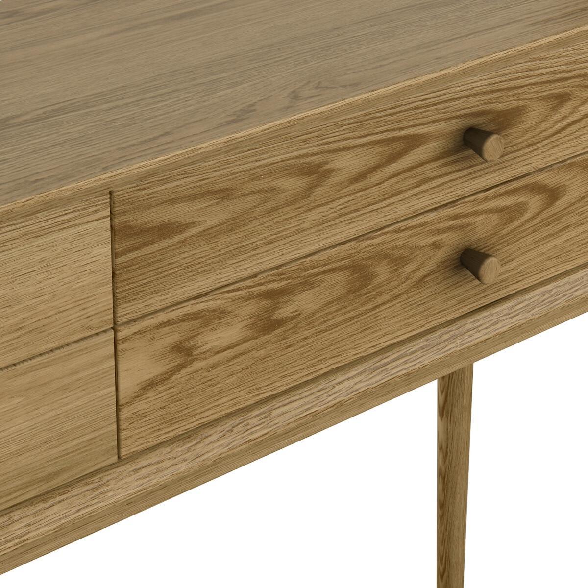 I really like this vintage-style console table because of its clean, straightforward design and the natural wooden finish, which makes it versatile for various interiors. It works particularly well in entryways, living rooms, or even a bedroom as a side table. The four drawers are practical for storing smaller items like keys, mail, or accessories, making it as functional as it is stylish. For styling, consider keeping the top simple with a statement lamp, a few potted plants, or decorative trays - avoiding clutter helps highlight its timeless appeal. In more traditional or eclectic spaces, this piece adds warmth and charm, but it can also seamlessly blend into modern settings with minimalist accents.